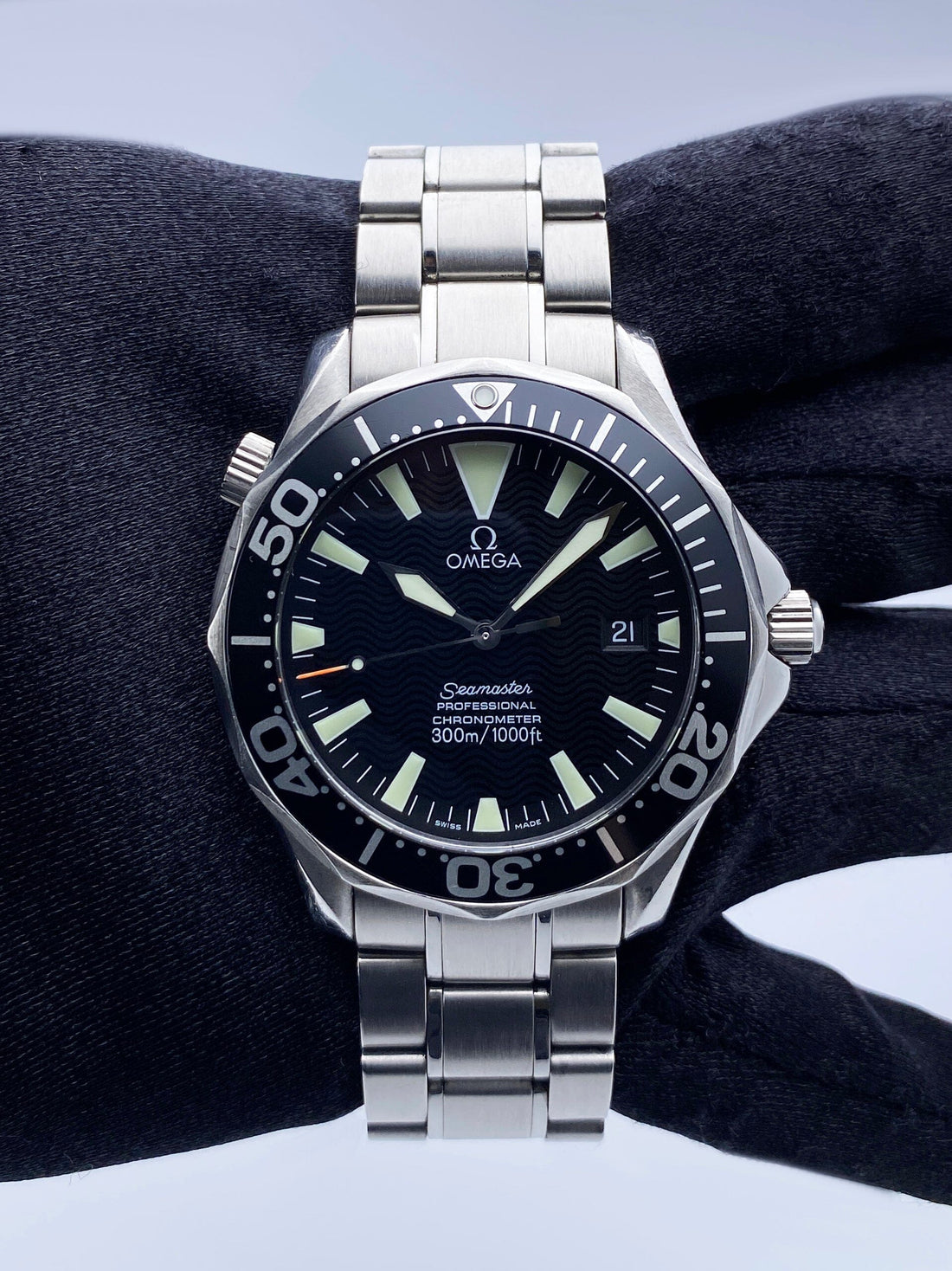 Omega Seamaster 2254.50.00 Mens Watch. 41mm stainless steel case. Bi-directional rotating stainless steel bezel with black aluminum insert. Black dial with luminous steel hands and index hour markers. Minute markers on the outer dial. The date is displayed at the 3 o'clock position. Stainless steel bracelet with fold over clasp with double push button safety. Will fit up to a 7-inch wrist. Sapphire crystal. Stainless steel case back. Automatic self-winding movement.