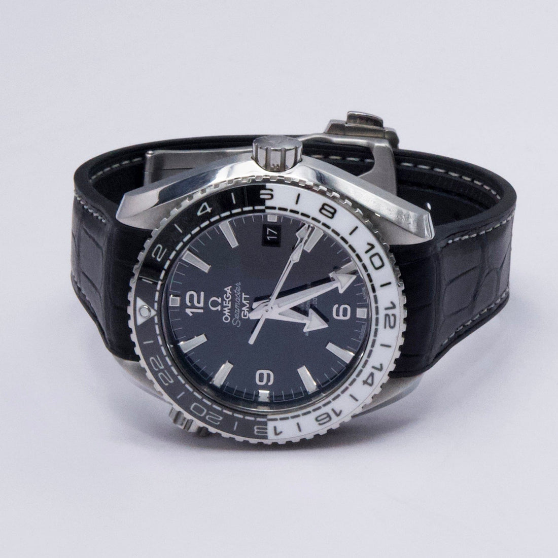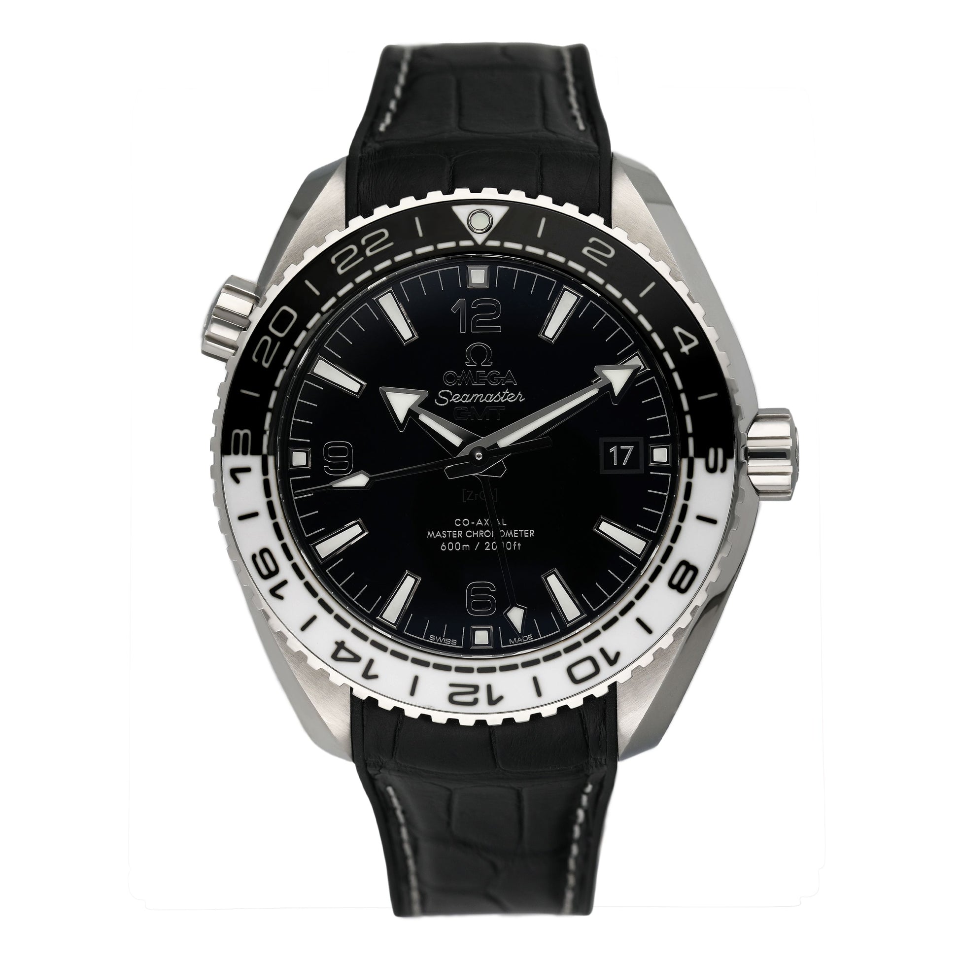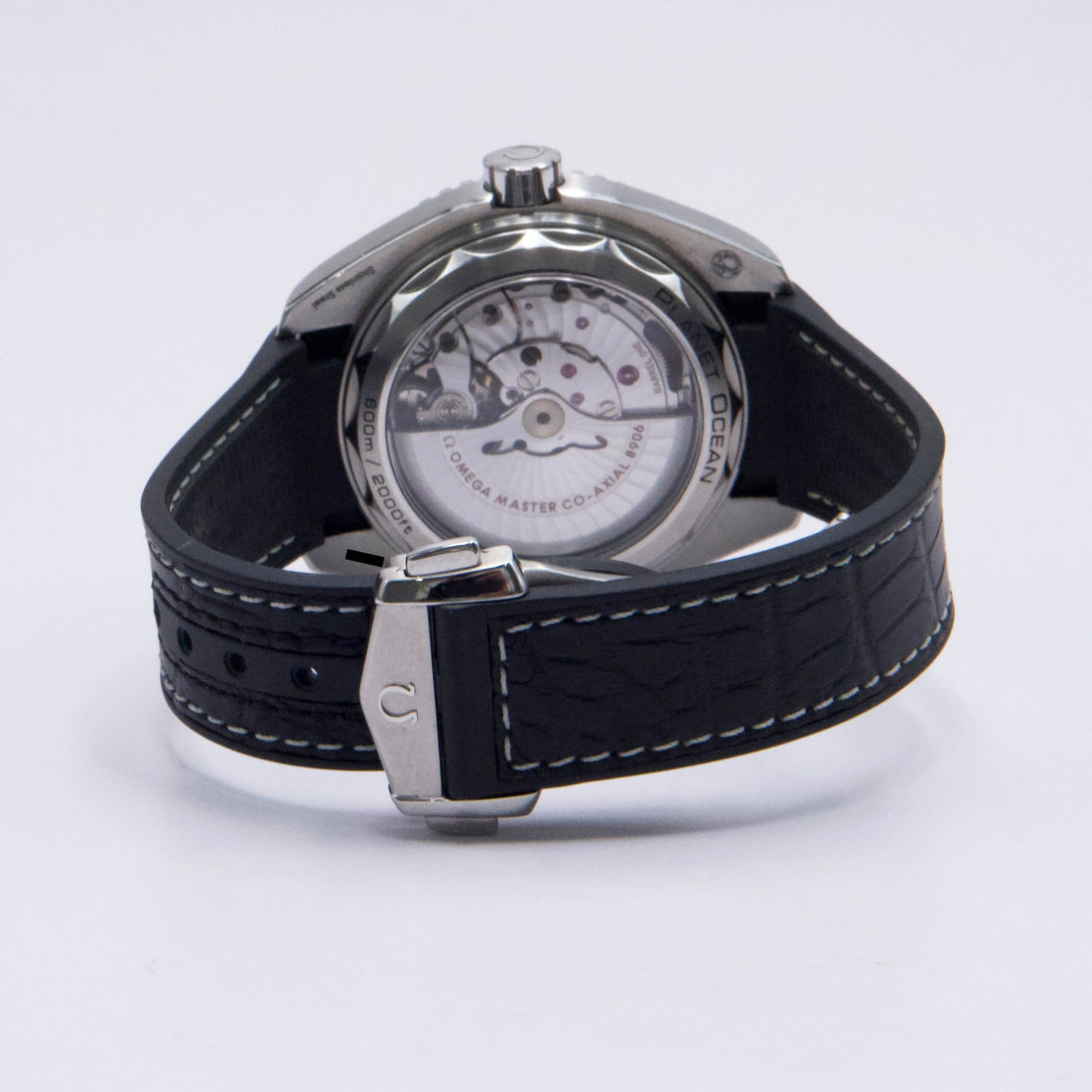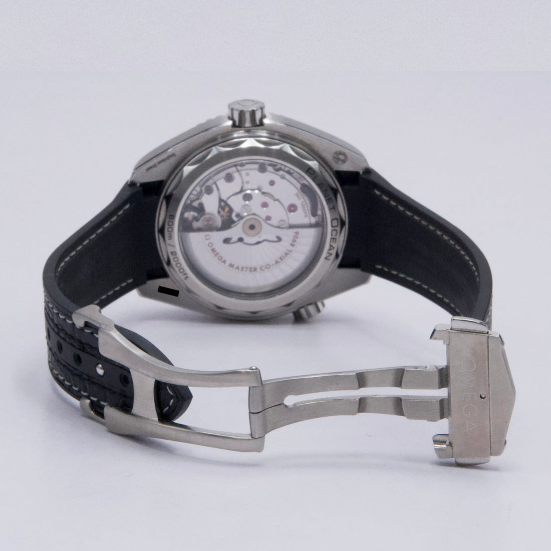 Omega Seamaster Planet Ocean 215.33.44.22.01.001 Mens Watch. 43.5mm stainless steel case. Bi-directional rotating stainless steel bezel with black and white insert. Black dial with luminous steel hands and Arabic numeral & index hour markers. Minute markers on the outer dial. The date is displayed at the 3 o'clock position. Black leather strap with stainless steel deployment clasp. Will fit up to a 7.5-inch wrist. Sapphire crystal. Transparent case back. Automatic self-winding movement. This watch comes with original Box and Papers.