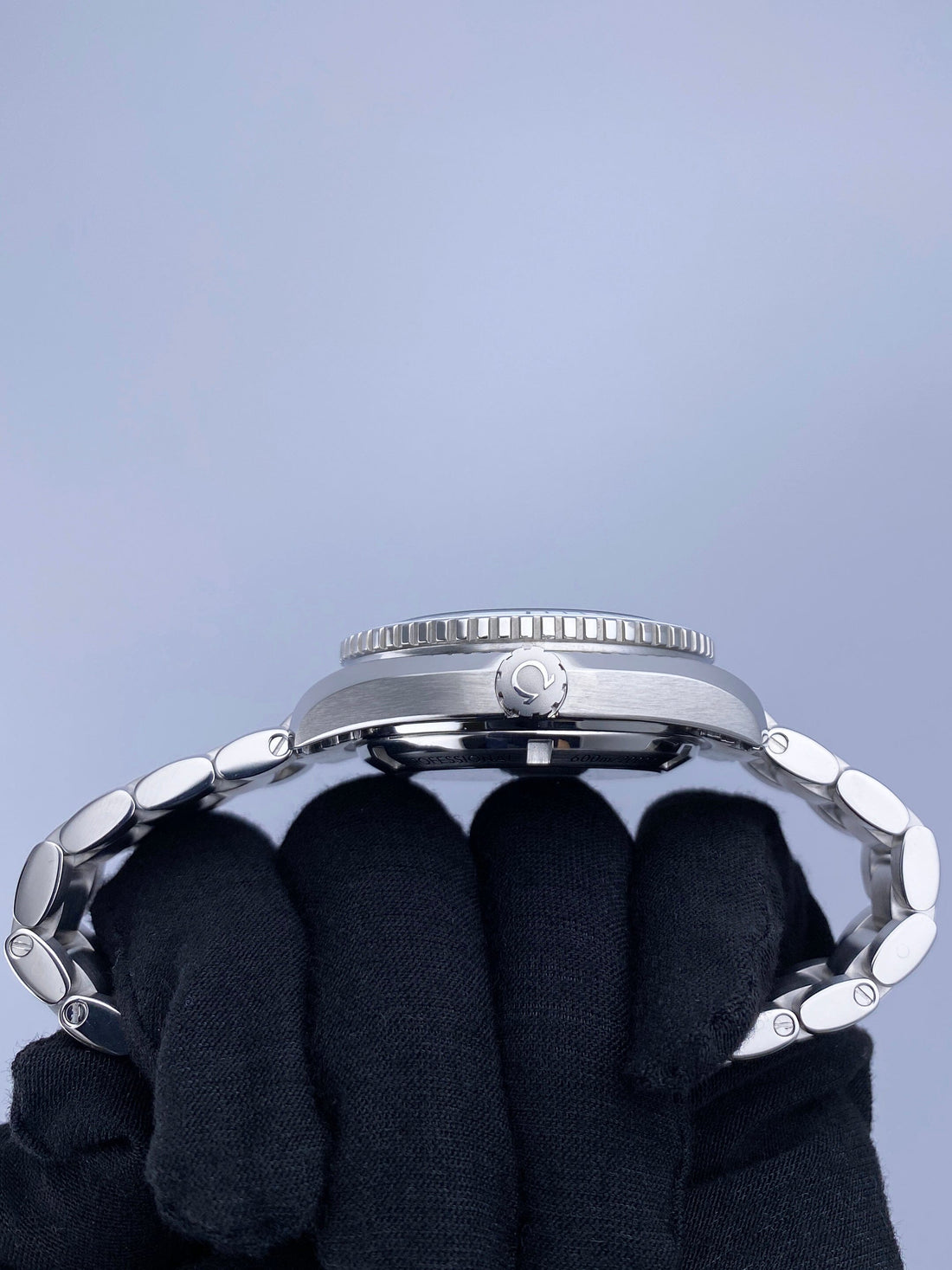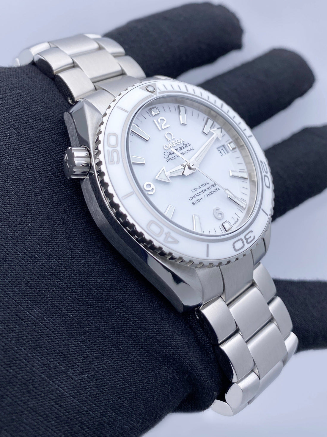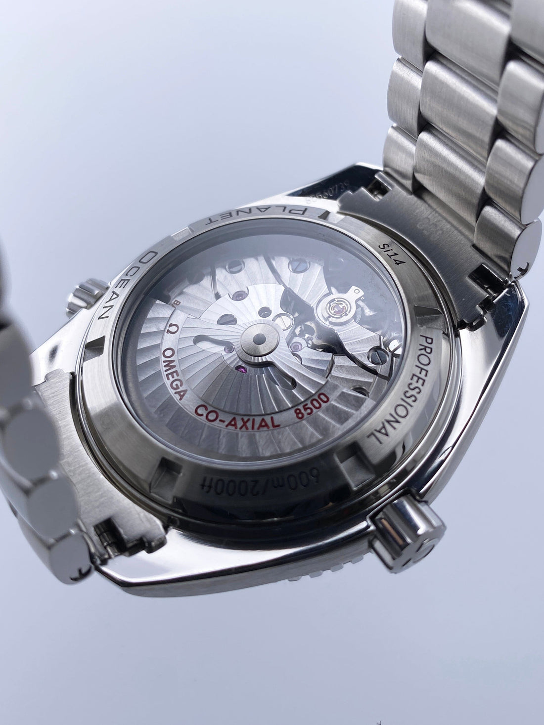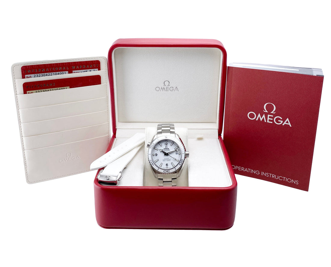 Omega Seamaster Planet Ocean 232.30.42.21.04.001 Mens Watch. 42mm stainless steel case. Unidirectional rotating stainless steel bezel with white insert. White dial with luminous steel hands and Arabic numeral & index hour markers. Minute markers on the outer dial. Date display at the 3 o'clock position. Stainless steel bracelet with fold over clasp with double push button safety. Will fit up to a 7.5-inch wrist. Extra white rubber strap with deployment clasp Sapphire crystal. Stainless steel case back. Calibre Omega 8500 Automatic self-winding movement with a 60-hour power reserve. This watch comes with original Box and Papers.