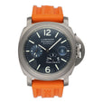 Panerai Luminor Power Reserve PAM00093 Mens Watch. 44mm titanium case. Titanium bezel. Blue dial with silver-tone luminous hands and luminous Arabic numeral & index hour markers. Date indicator at 3 o'clock position. Small seconds sub-dial display between 8 and 10 o'clock. Power reserve indicator at 7 o'clock. Orange rubber strap with titanium deployment buckle. Will fit up to a 8-inch wrist. Sapphire crystal. Titanium case back. Automatic self-winding movement.