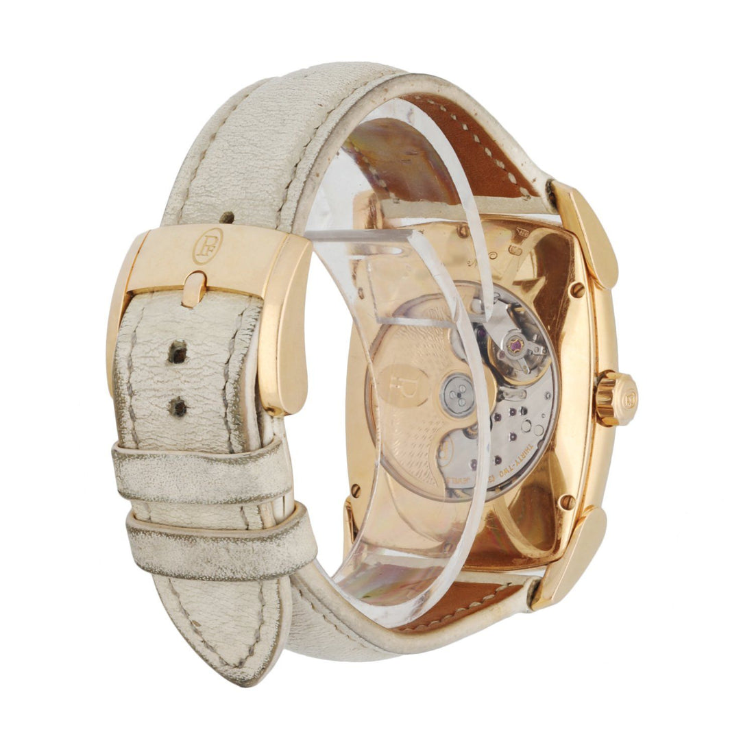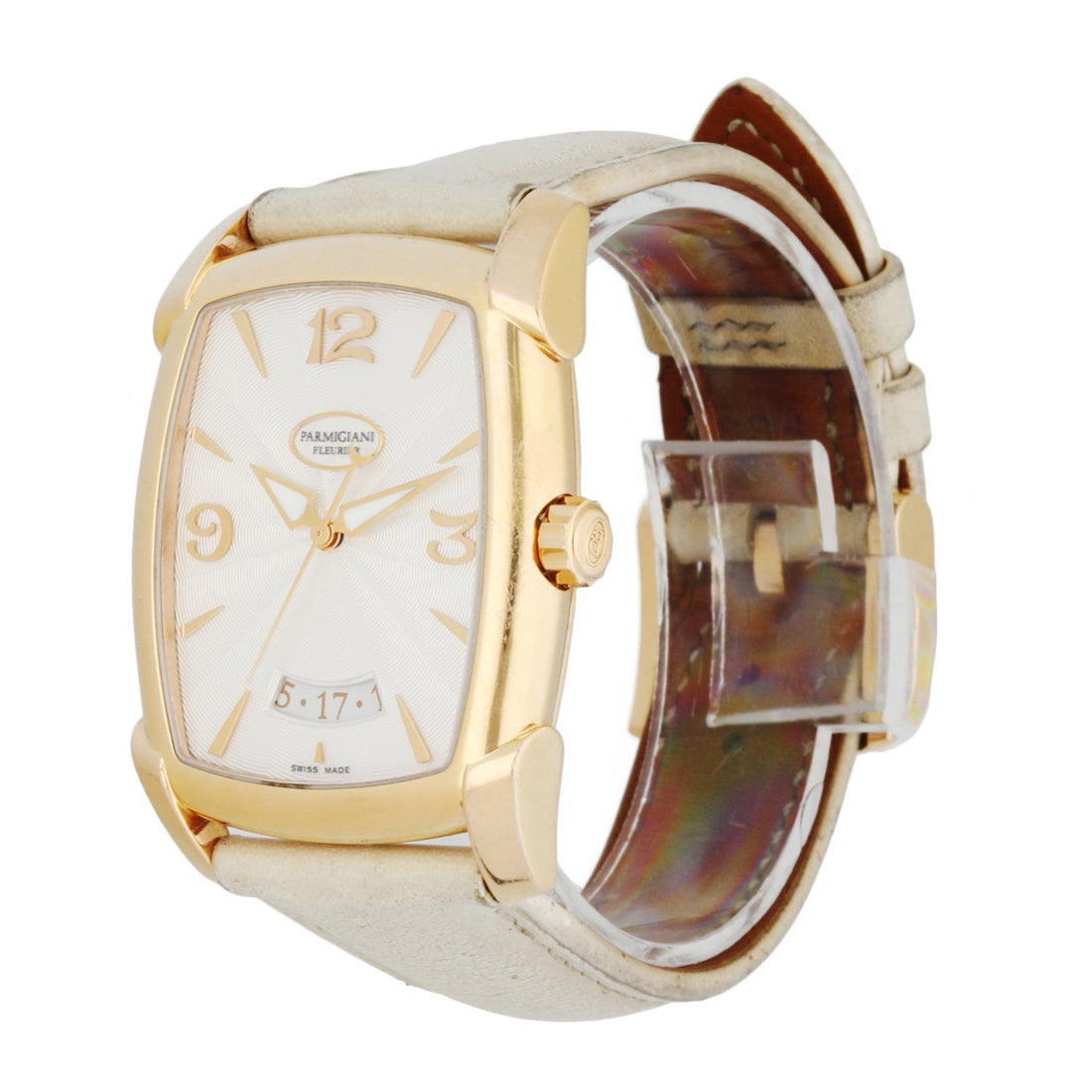 Parmigiani Fleurier men's watch. 32MM 18K yellow gold case. White dial with luminous gold hands and gold Arabic numeral & index hour marker. Date display between 5 & 7 o'clock. White leather strap with 18K yellow gold buckle. Will fit up to 6.75-Inch wrist. Sapphire crystal and Sapphire crystal case back. Automatic self winding movement.