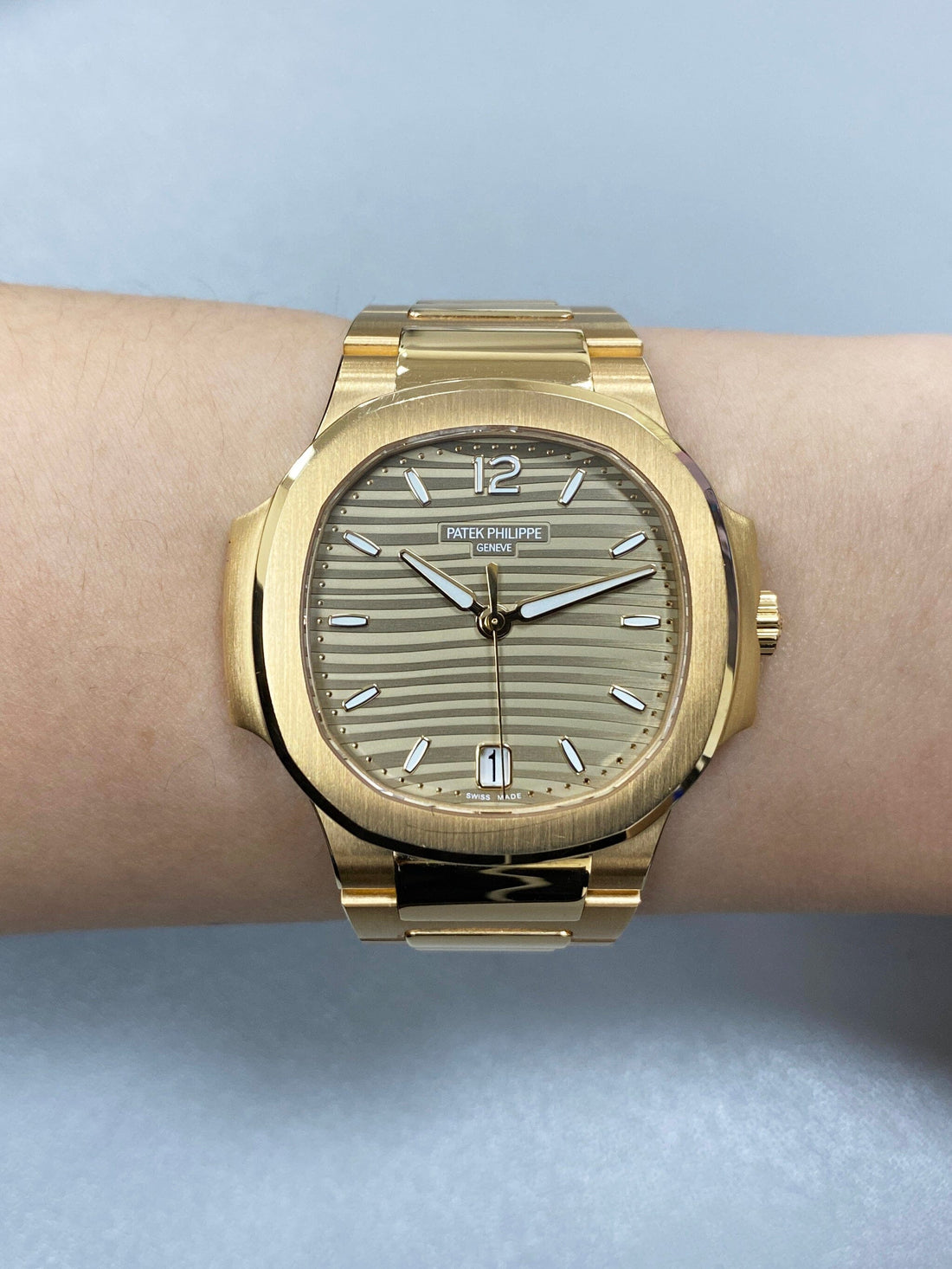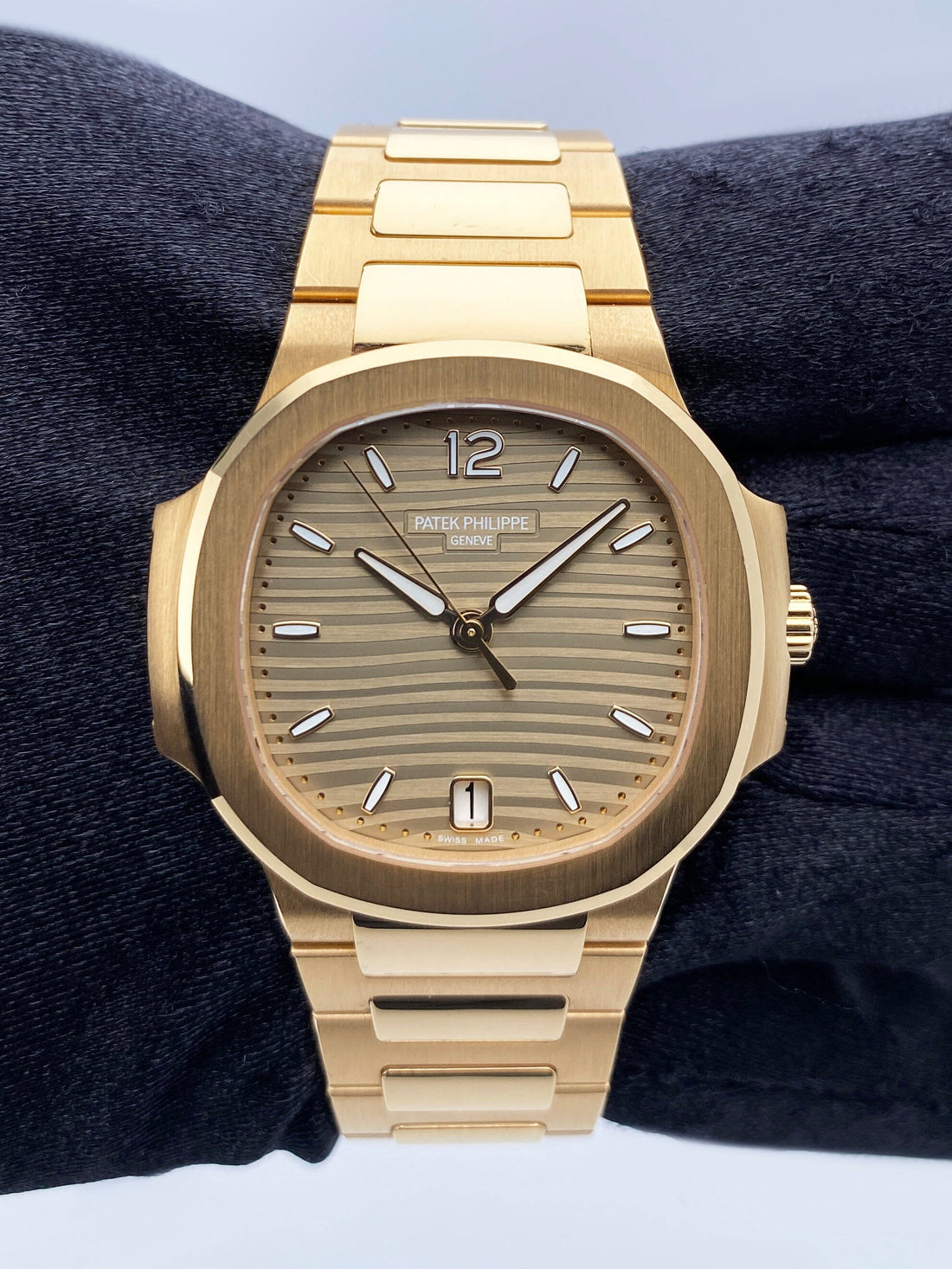 Patek Philippe Nautilus 7118/1R-010 Ladies Watch. 35.2mm 18K rose gold case. 18K rose gold bezel. Golden brown opaline dial with luminous rose gold hands and index hour markers. The date is displayed at 6 o'clock. Rose gold bracelet with hidden butterfly clasp push button. Will fit up to a 6-inch wrist. Sapphire crystal. Transparent sapphire crystal case back. Caliber 324 S C automatic self-winding movement. This watch comes with original Box and Papers.