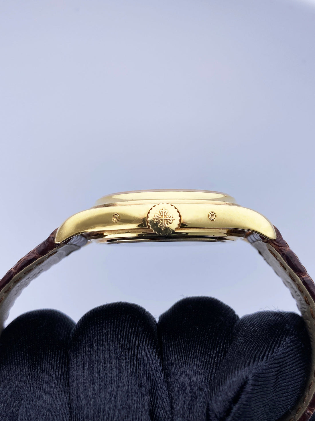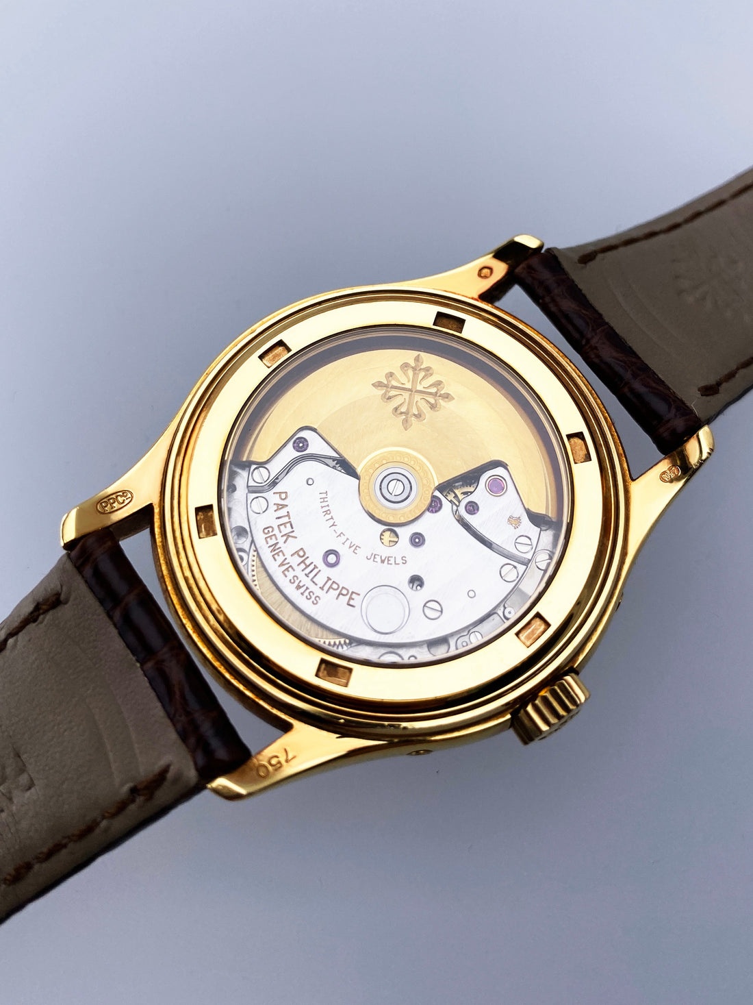 Patek Philippe Annual Calendar 5035J-011 Mens Watch. 37mm 18K yellow gold case and 18K yellow gold bezel. Cream dial with luminous gold hands and gold Roman numeral hour markers. Annual calendar. Day display at 9 o'clock. Month display at 3 o'clock. 24-hour counter at 6 o'clock. Date display at a 6 o'clock position. Brown leather strap with 18K yellow gold buckle. Will fit up to a 7-inch wrist. Sapphire crystal. Transparent sapphire crystal case back. Calibre 315 automatic self-winding movement.
