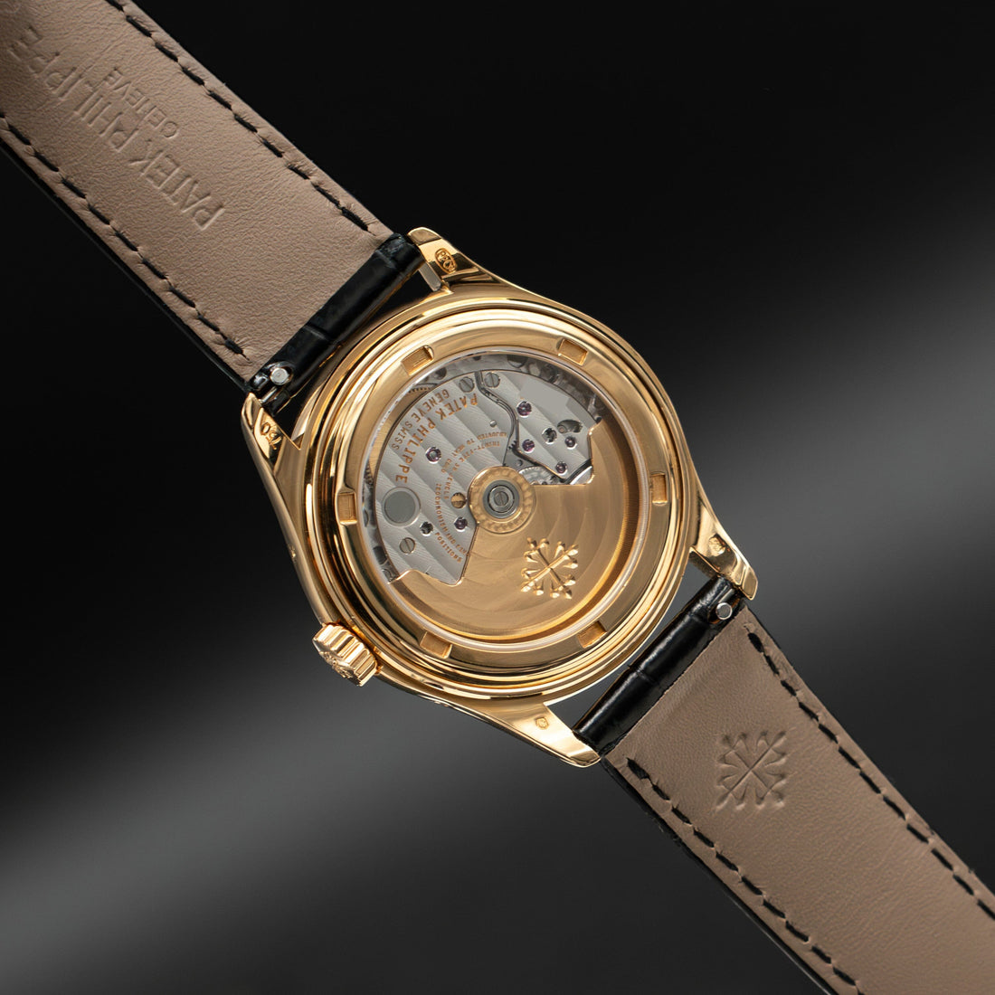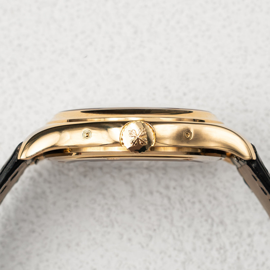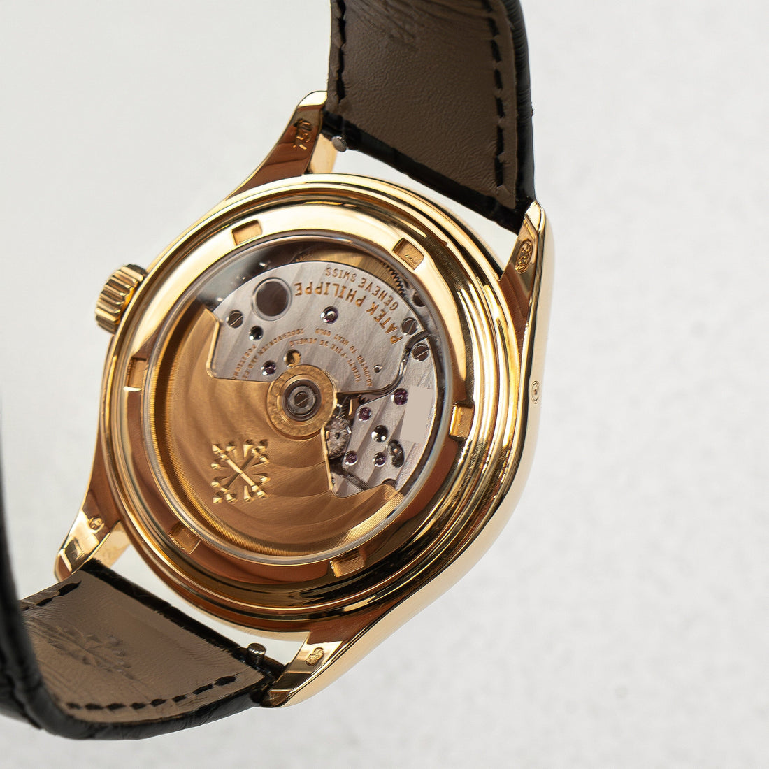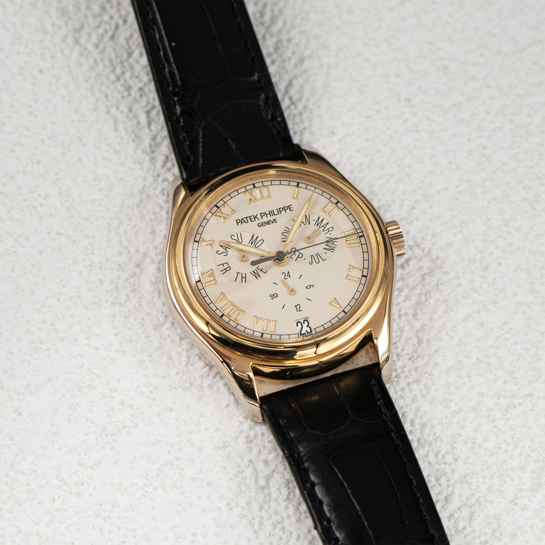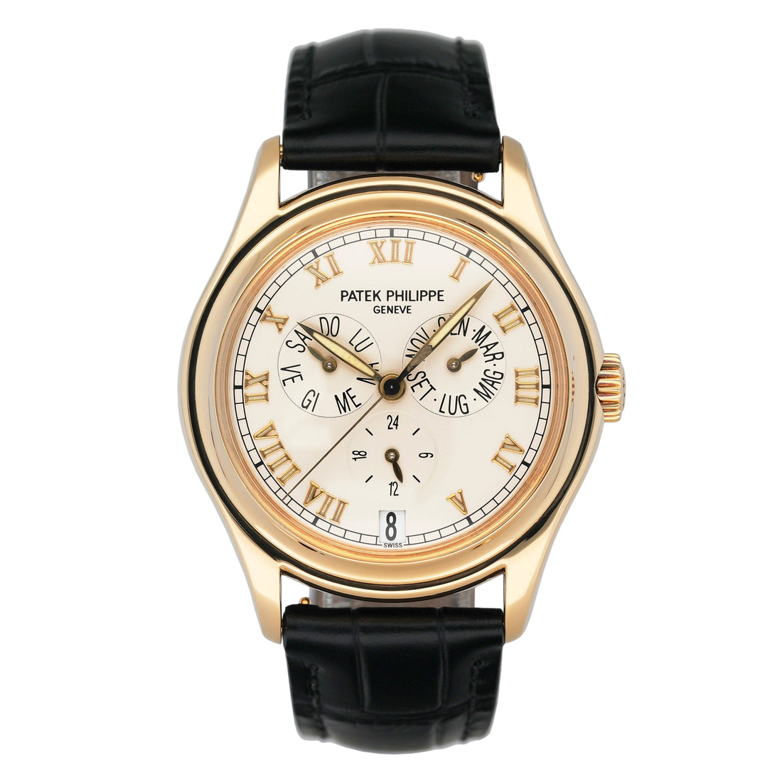 Patek Philippe Annual Calendar 5035J-011 Mens Watch. 37mm 18K yellow gold case and 18K yellow gold bezel. Cream dial with luminous gold hands and gold Roman numeral hour markers. Annual calendar. Day display at 9 o'clock. Month display at 3 o'clock. 24-hour counter at 6 o'clock. Date display at a 6 o'clock position. Day and Date written in Italian. Black leather strap with 18K yellow gold buckle. Will fit up to a 7.5-inch wrist. Sapphire crystal. Transparent sapphire crystal case back. Calibre 315 automatic self-winding movement.