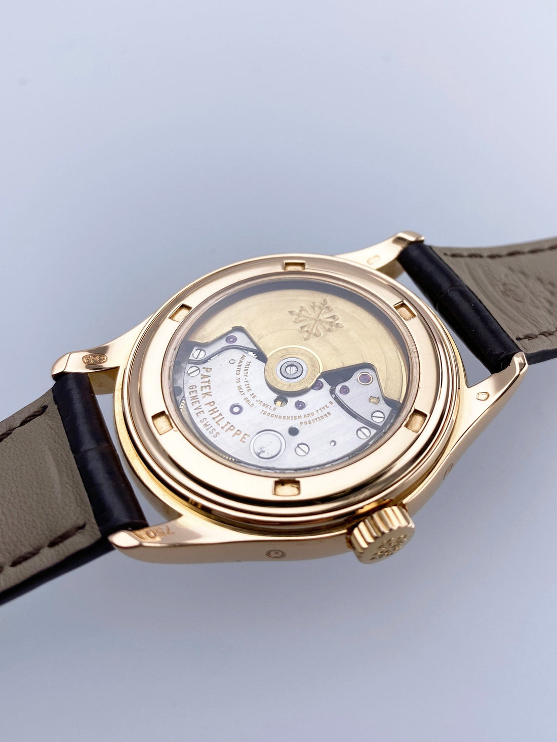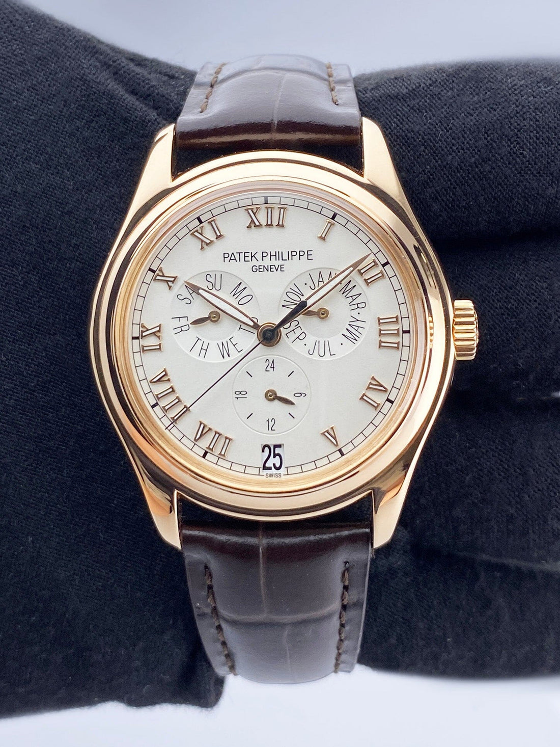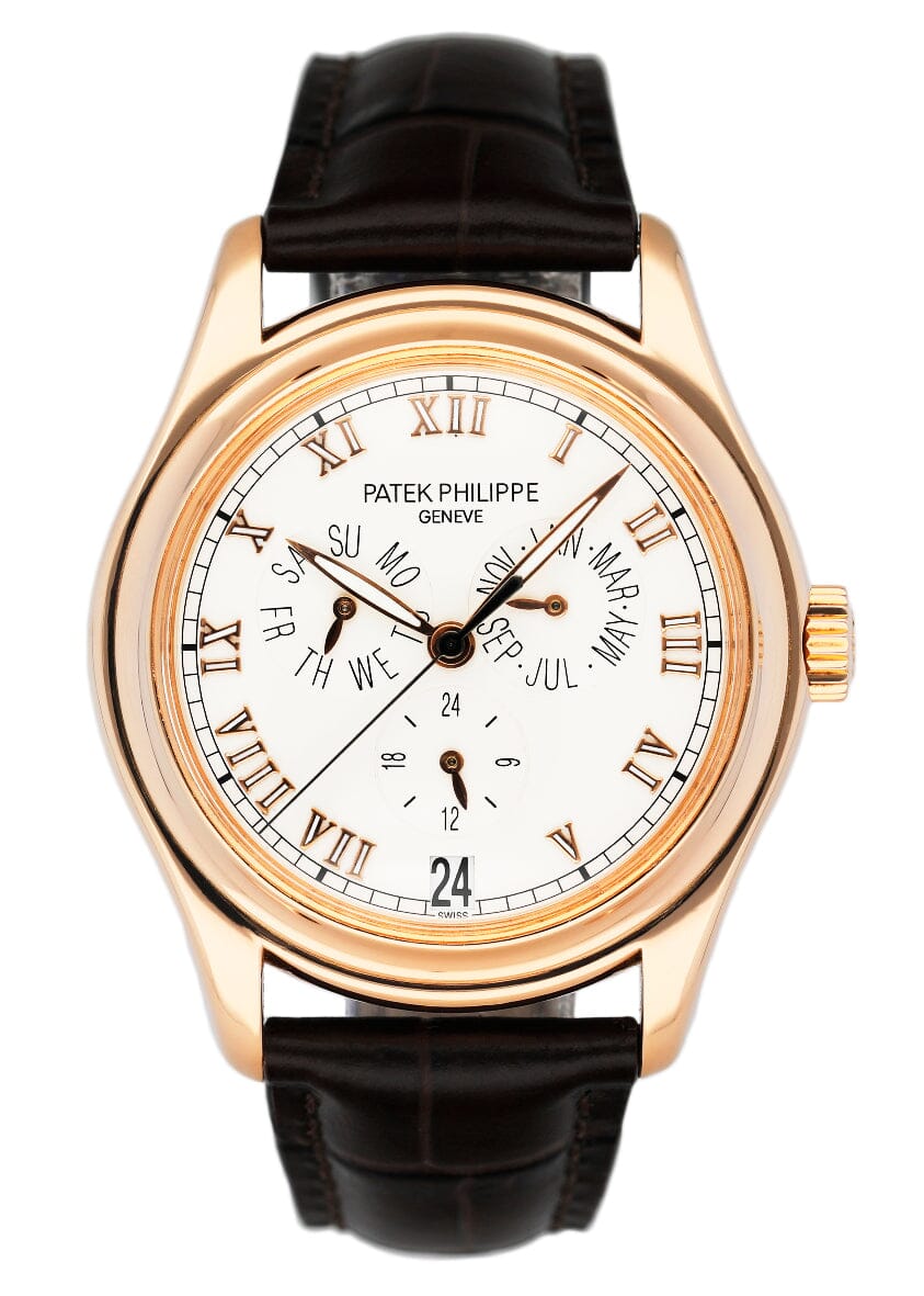 Patek Philippe Annual Calendar 5035R Mens Watch. 37mm 18K rose gold case and 18K rose gold bezel. Cream dial with luminous gold hands and gold Roman numeral hour markers. Annual calendar. Day display at 9 o'clock. Month display at 3 o'clock. 24-hour counter at 6 o'clock. Date display at a 6 o'clock position. Brown leather strap with 18K rose gold buckle. Will fit up to a 7.5-inch wrist. Sapphire crystal. Transparent sapphire crystal case back. Calibre 315 automatic self-winding movement.