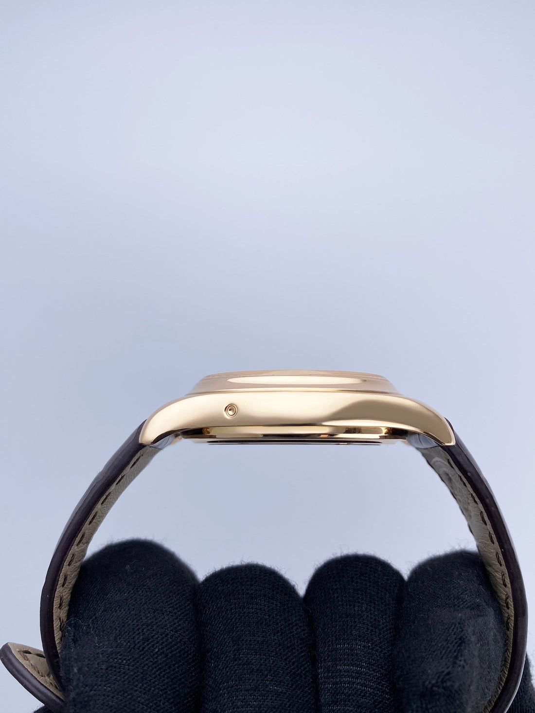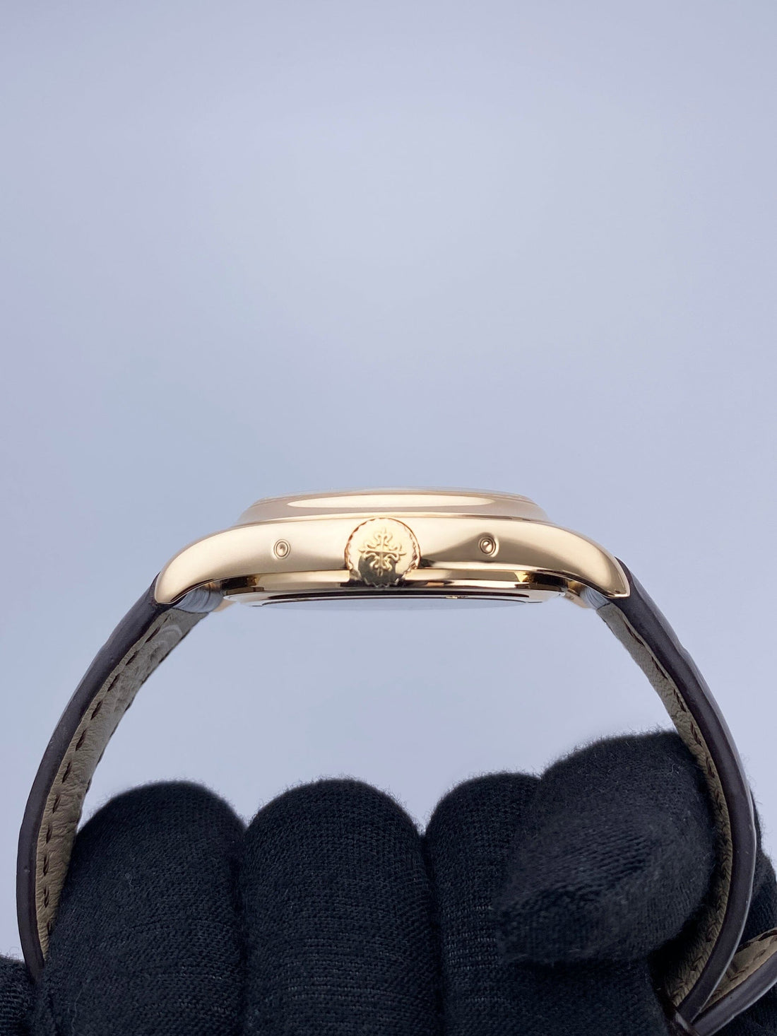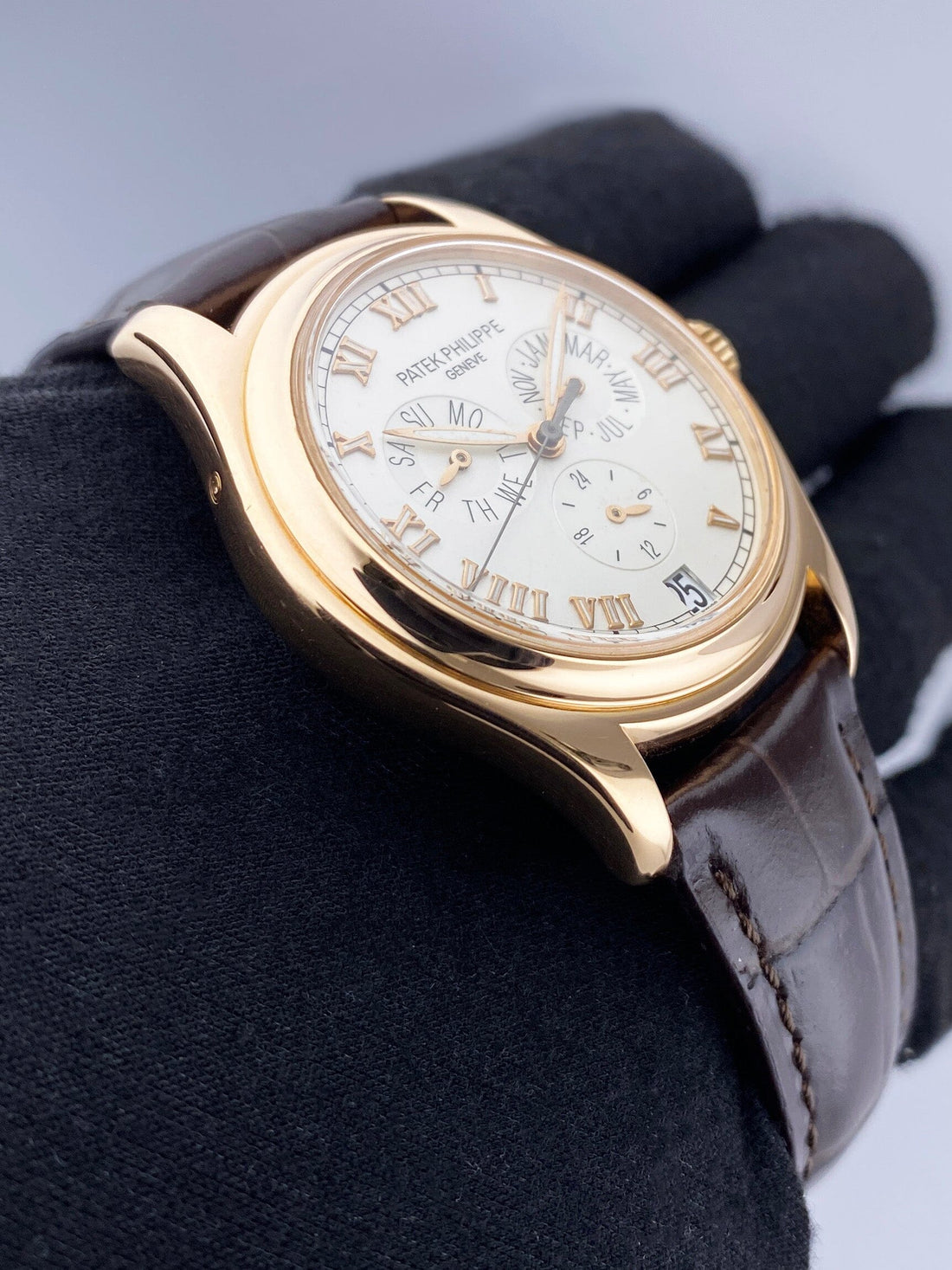 Patek Philippe Annual Calendar 5035R Mens Watch. 37mm 18K rose gold case and 18K rose gold bezel. Cream dial with luminous gold hands and gold Roman numeral hour markers. Annual calendar. Day display at 9 o'clock. Month display at 3 o'clock. 24-hour counter at 6 o'clock. Date display at a 6 o'clock position. Brown leather strap with 18K rose gold buckle. Will fit up to a 7.5-inch wrist. Sapphire crystal. Transparent sapphire crystal case back. Calibre 315 automatic self-winding movement.