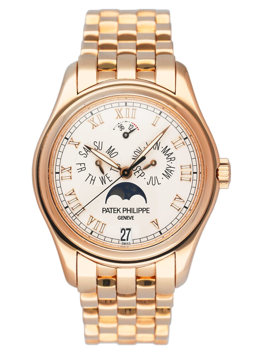 Patek Philippe Annual Calendar 5036/1R-001 Mens Watch. 37mm 18K rose gold case. 18K rose gold bezel. White dial with rose gold hands and Roman numeral hour markers. Annual calendar displays with a moon phase indicator. Power reserve indicator at 12 o'clock. 18K rose gold bracelet with hidden butterfly clasp with safety. Will fit up to a 6.75-inch wrist. Sapphire crystal. Transparent sapphire crystal case back. Automatic self-winding movement. This watch is comes with original Box and Papers.