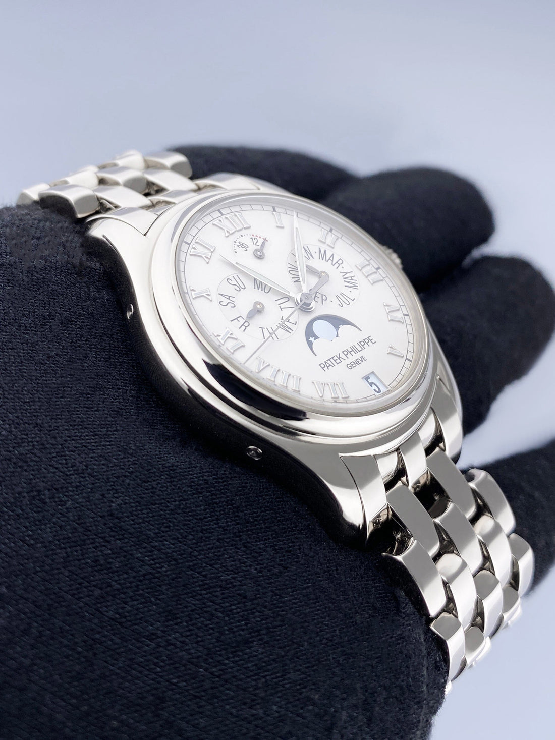 Patek Philippe Annual Calendar 5036/1G-017 Mens Watch. 37mm 18K white gold case. 18K white gold bezel. Cream dial with white gold hands and Roman numeral hour markers. Annual calendar displays with a moon phase indicator. Power reserve indicator at 12 o'clock. 18K white gold bracelet with hidden butterfly clasp with safety. Will fit up to a 7-inch wrist. Sapphire crystal. Transparent sapphire crystal case back. Automatic self-winding movement.