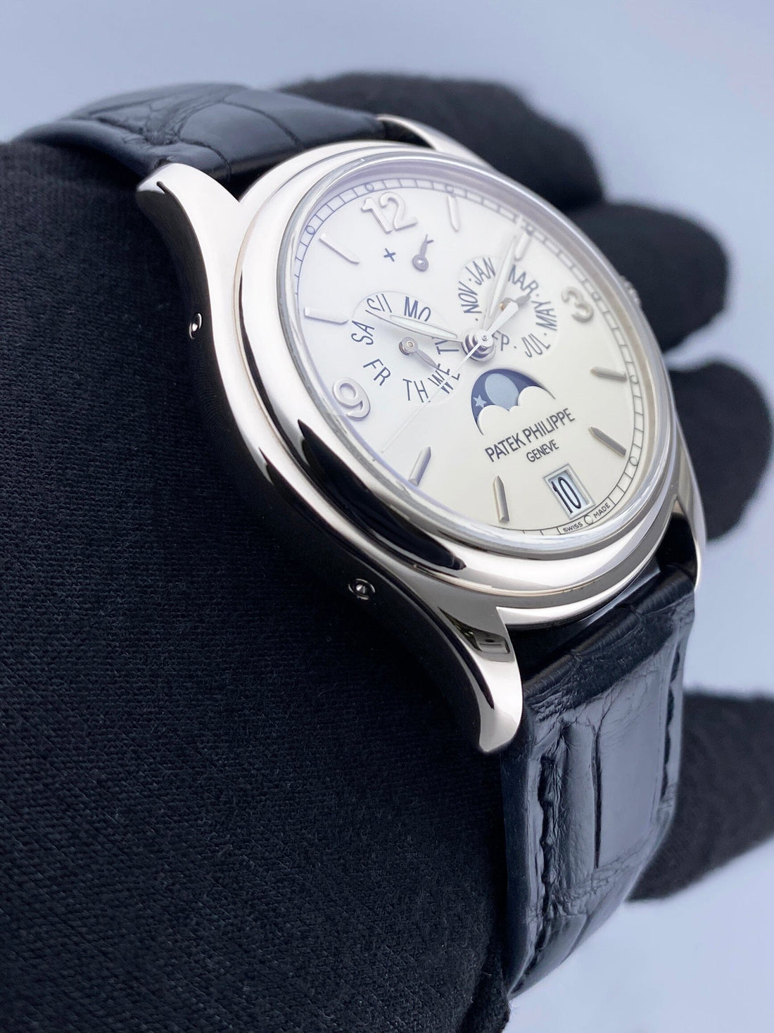 Patek Philippe Annual Calendar 5146G-001 Mens Watch. 39mm 18K white gold case and 18K white gold bezel. Cream dial with luminous white gold hands and white gold index & Arabic numeral hour markers. Annual calendar displays with a moon phase indicator. Black leather strap with 18K white gold deployment buckle. Will fit up to a 7.5-inch wrist. Sapphire crystal. Transparent sapphire crystal case back. Automatic self-winding movement.