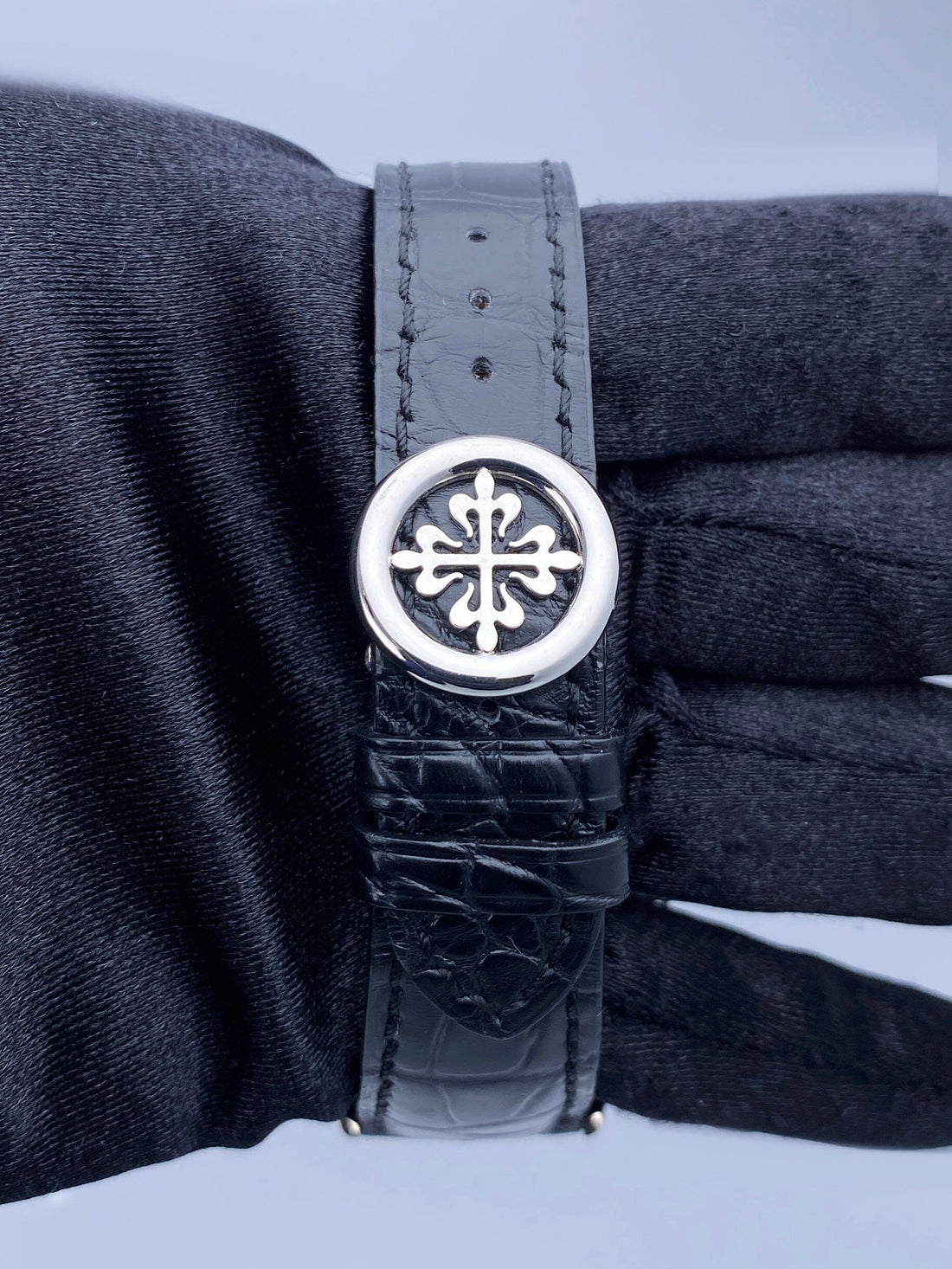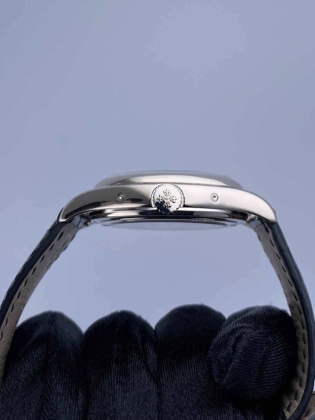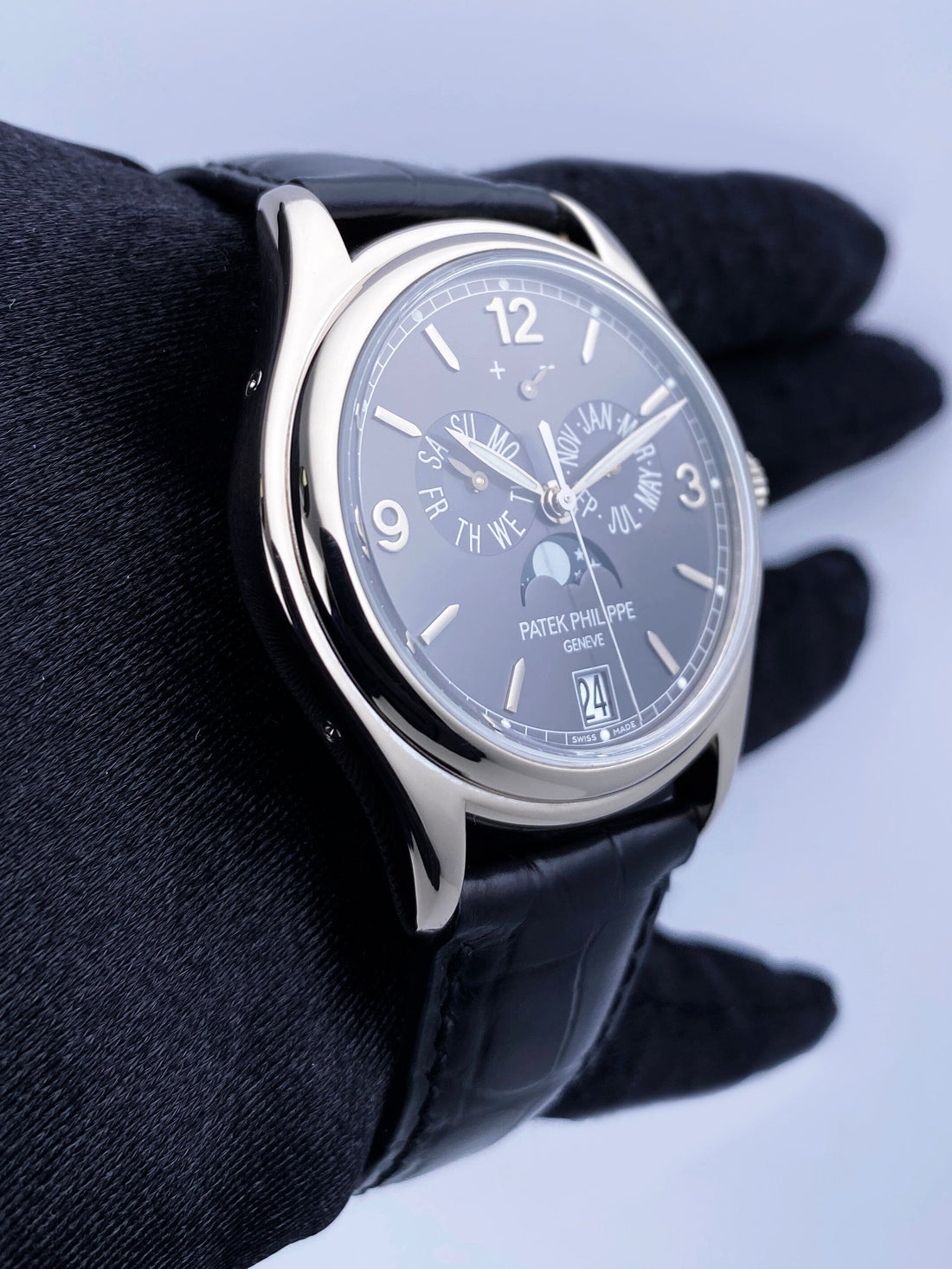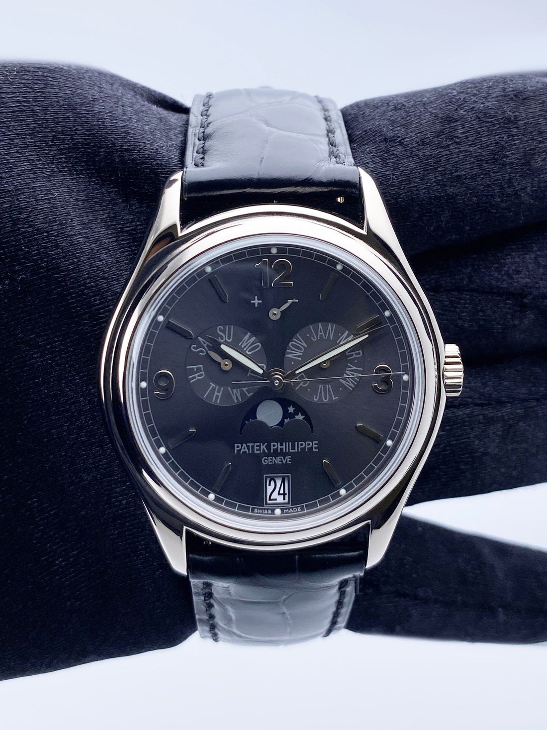 Patek Philippe Annual Calendar 5146G-010 Mens Watch. 39mm 18K white gold case and 18K white gold bezel. Gray dial with luminous white gold hands and white gold index & Arabic numeral hour markers. Annual calendar displays with a moon phase indicator. Black leather strap with 18K white gold deployment buckle. Will fit up to a 7.5-inch wrist. Sapphire crystal. Transparent sapphire crystal case back. Automatic self-winding movement. This watch comes with original Box and Papers.