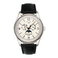 Patek Philippe Annual Calendar 5146G-001 Mens Watch. 39mm 18K white gold case and 18K white gold bezel. Cream dial with luminous white gold hands and white gold index & Arabic numeral hour markers. Annual calendar displays with a moon phase indicator. Black leather strap with 18K white gold deployment buckle. Will fit up to a 7-inch wrist. Sapphire crystal. Transparent sapphire crystal case back. Automatic self-winding movement. This watch comes with original Box and Papers.