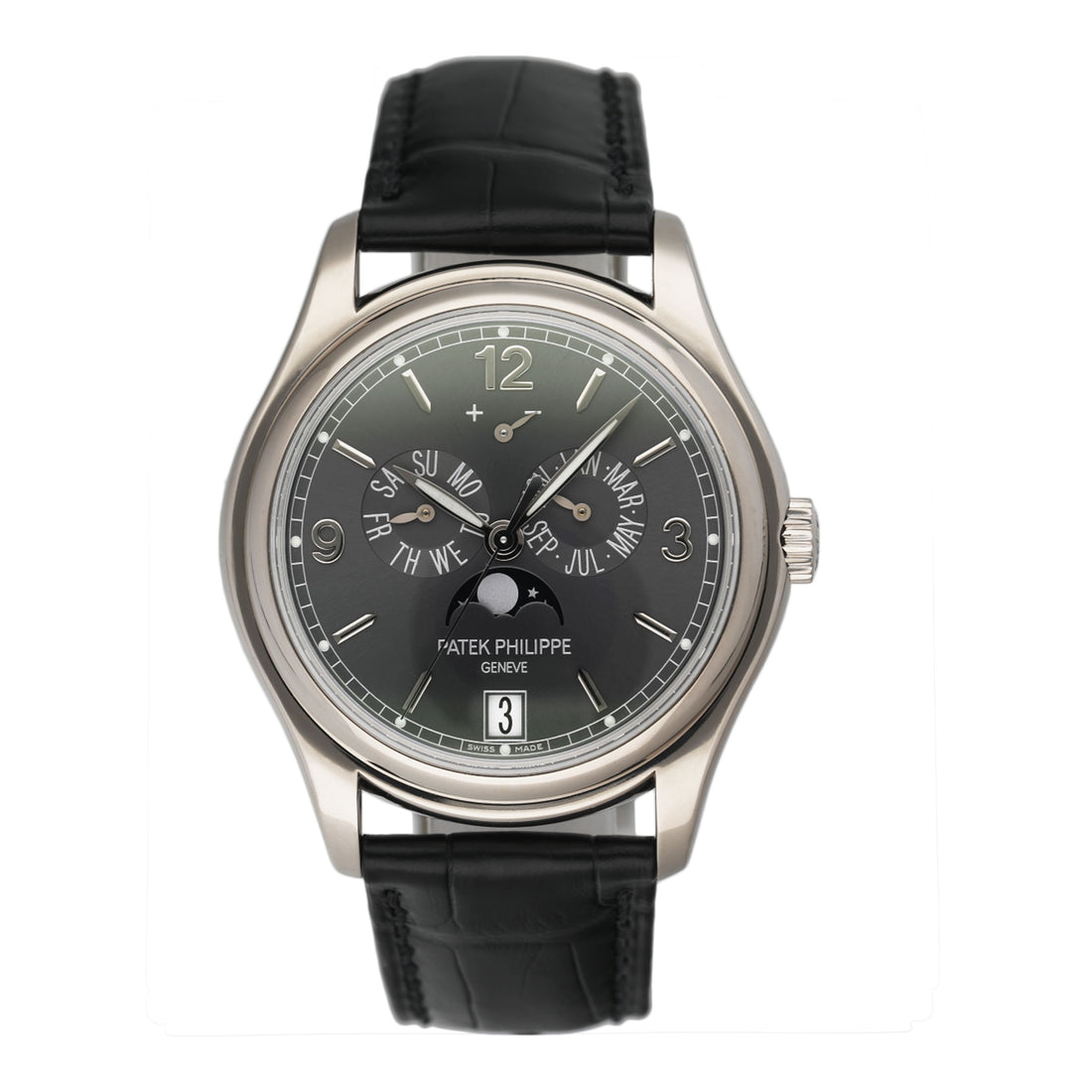 Patek Philippe Annual Calendar 5146G-010 Mens Watch. 39mm 18K white gold case and 18K white gold bezel. Gray dial with luminous white gold hands and white gold index & Arabic numeral hour markers. Annual calendar displays with a moon phase indicator. Black leather strap with 18K white gold deployment buckle. Will fit up to a 7.5-inch wrist. Sapphire crystal. Transparent sapphire crystal case back. Automatic self-winding movement. This watch comes with original Box and Papers.