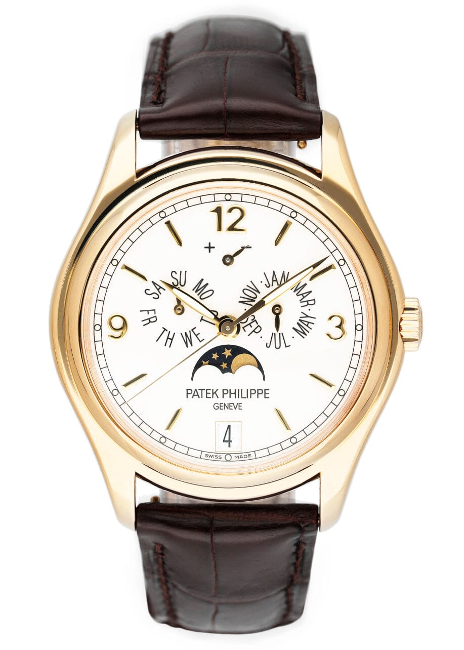 Patek Philippe Annual Calendar 5146J-001 Mens Watch. 39mm 18K yellow gold case and 18K yellow gold bezel. Cream dial with luminous gold hands and gold index & Arabic numeral hour markers. Annual calendar displays with a moon phase indicator. Brown leather strap with 18K yellow gold deployment buckle. Will fit up to a 7.5-inch wrist. Sapphire crystal. Transparent sapphire crystal case back. Automatic self-winding movement. This watch comes with original Box and Papers.