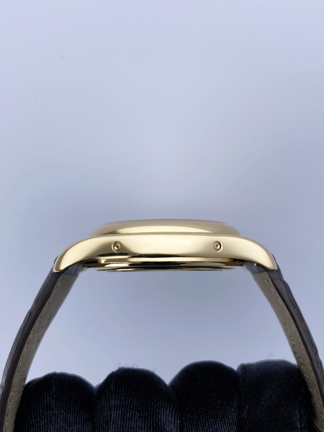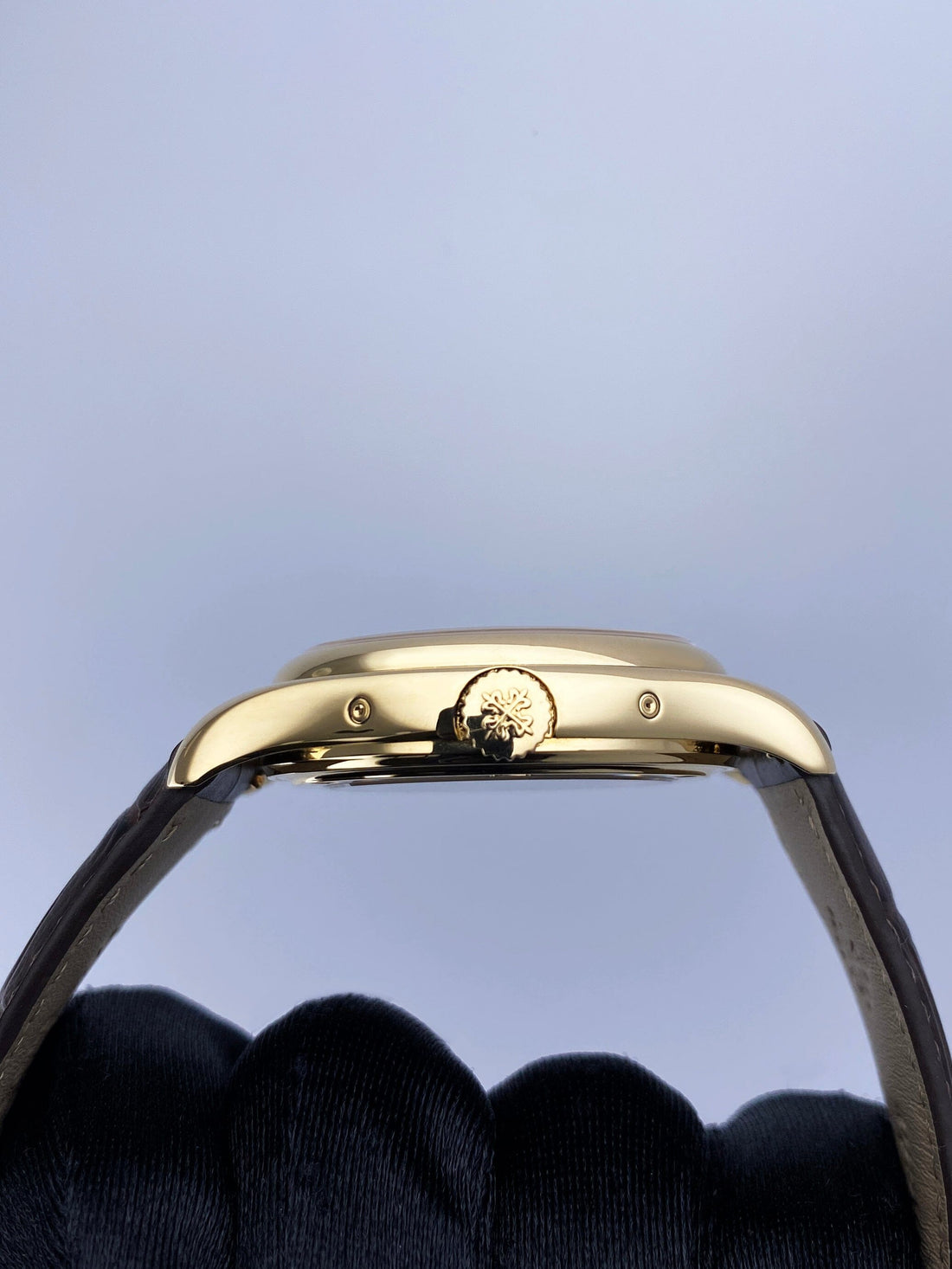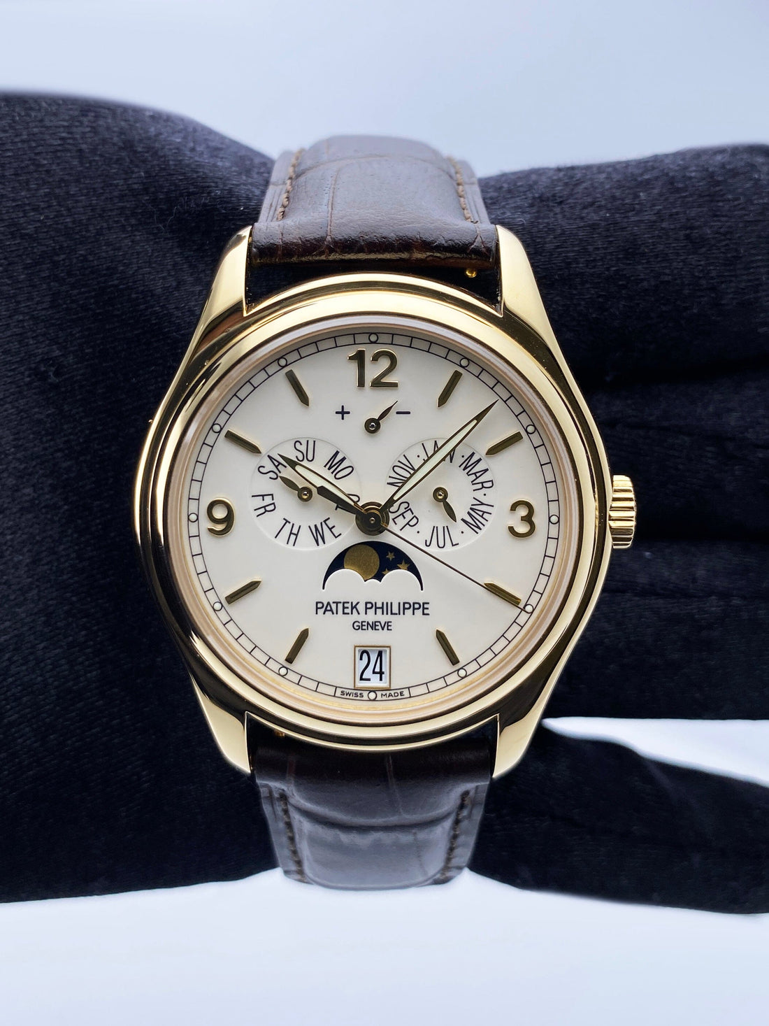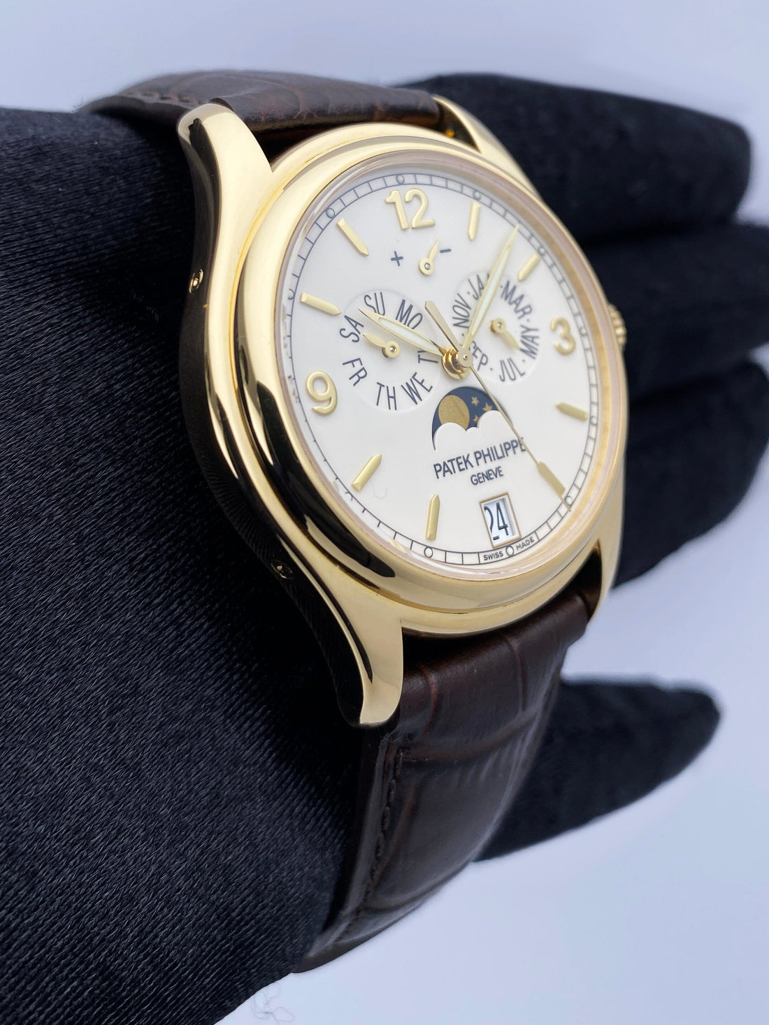 Patek Philippe Annual Calendar 5146J-001 Mens Watch. 39mm 18K yellow gold case and 18K yellow gold bezel. Cream dial with luminous gold hands and gold index & Arabic numeral hour markers. Annual calendar displays with a moon phase indicator. Brown leather strap with 18K yellow gold deployment buckle. Will fit up to a 7.5-inch wrist. Sapphire crystal. Transparent sapphire crystal case back. Automatic self-winding movement. This watch comes with original Box and Papers.