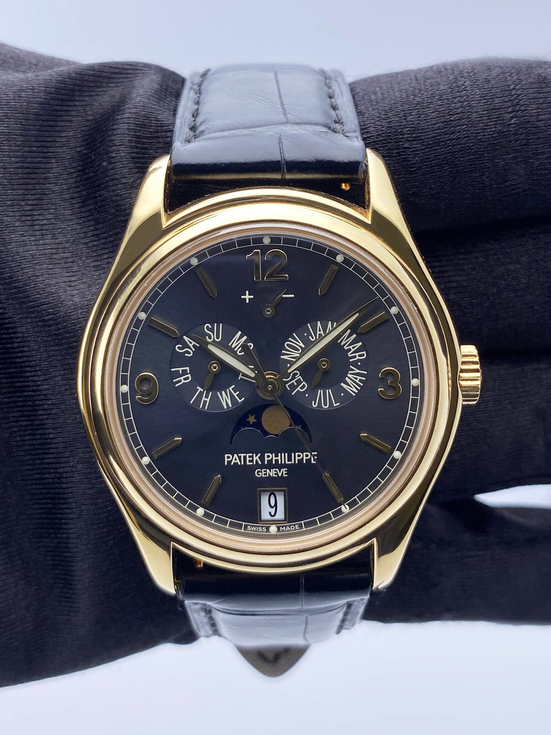 Patek Philippe Annual Calendar 5146J-010 Mens Watch. 39mm 18K yellow gold case and 18K yellow gold bezel. Slate dial with luminous gold hands and gold index & Arabic numeral hour markers. Annual calendar displays with a moon phase indicator. Black leather strap with 18K yellow gold deployment buckle. Will fit up to a 7.5-inch wrist. Sapphire crystal. Transparent sapphire crystal case back. Automatic self-winding movement. This watch comes with original Box and Papers.