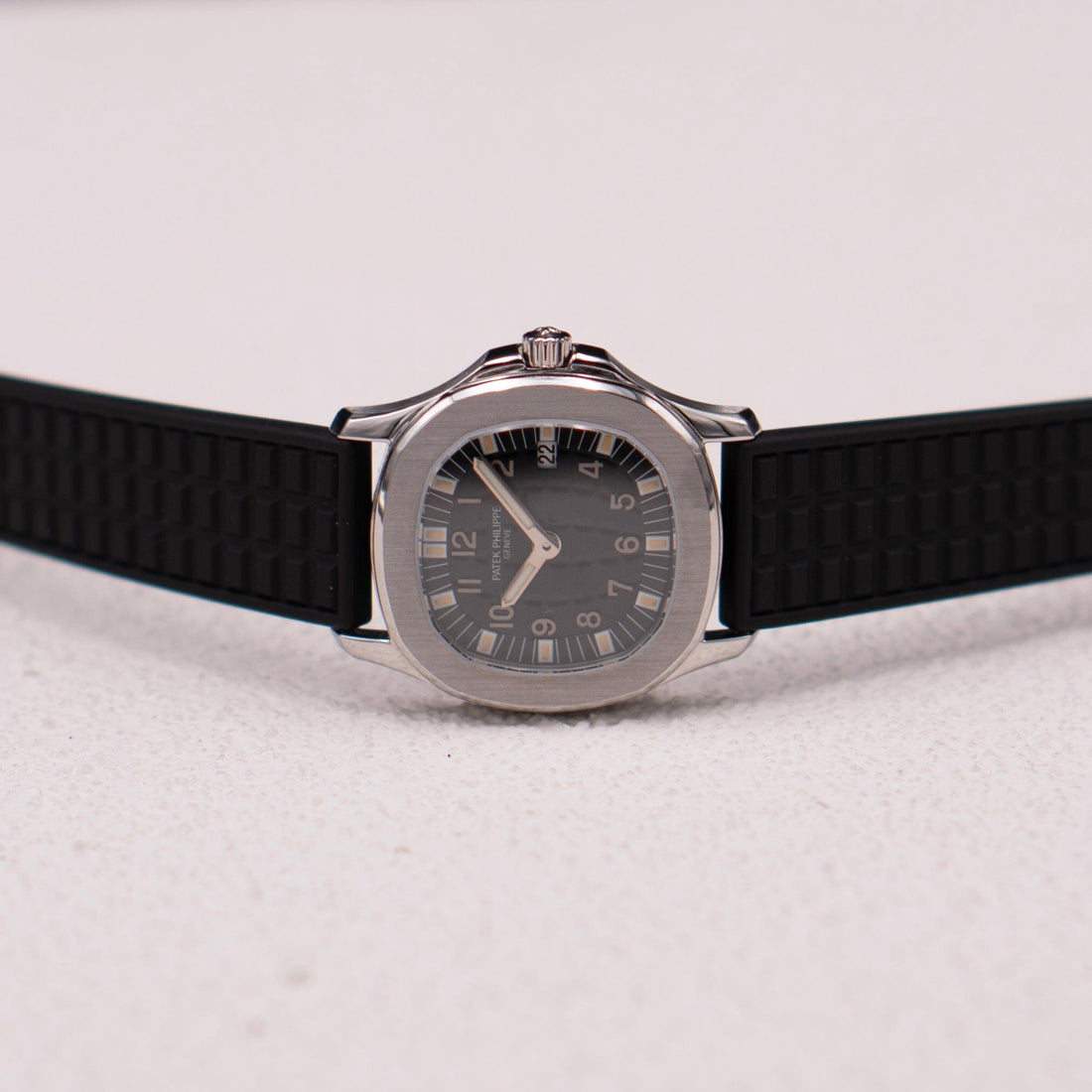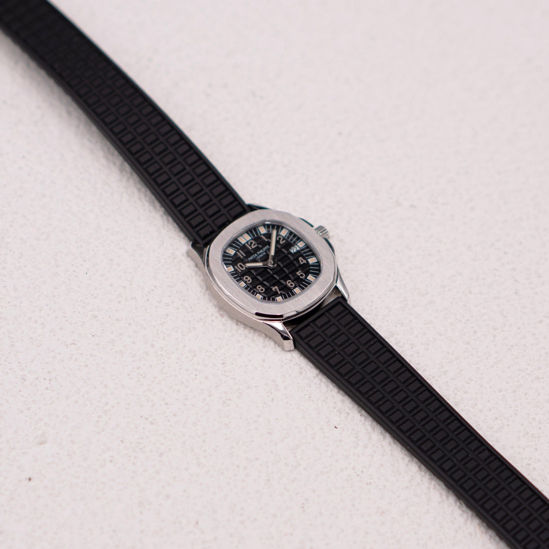 Patek Philippe Aquanaut 4960A Ladies Watch. 29.00mm stainless steel case. stainless steel bezel. Black dial and arabic numeral hour markers. Date Indicator. Black rubber strap with stainless steel deployments clasp. Will fit up to 6.00-inch wrist. Sapphire crystal. Stainless steel case back. Quartz movement.