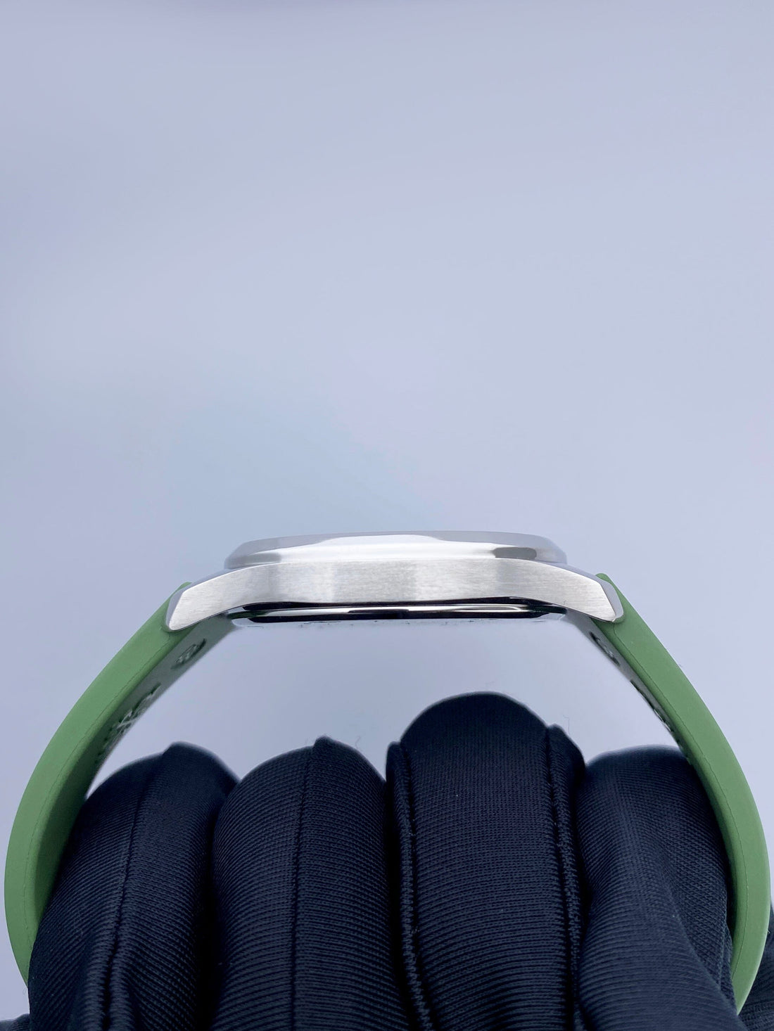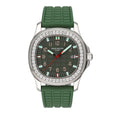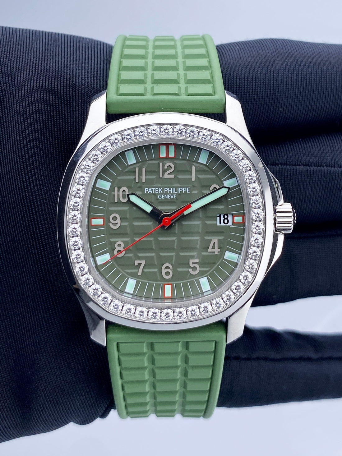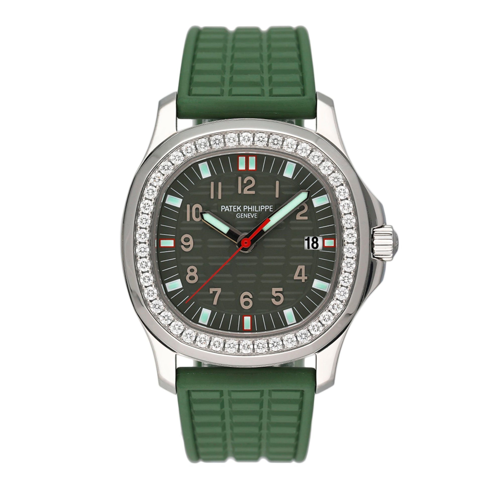 Patek Philippe Aquanaut 5067A-013 Ladies Watch. 35.6mm Stainless Steel case. Stainless steel bezel set with factory diamonds. Green dial with luminous steel hands and Arabic numeral hour markers. Minute markers on the outer dial. Date display at the 3 o'clock position. Green rubber strap with hidden butterfly clasp. Will fit up to a 6-inch wrist. Sapphire crystal Stainless steel case back. Calibre E23 SC Quartz: Battery powered movement. This watch comes with Archives.