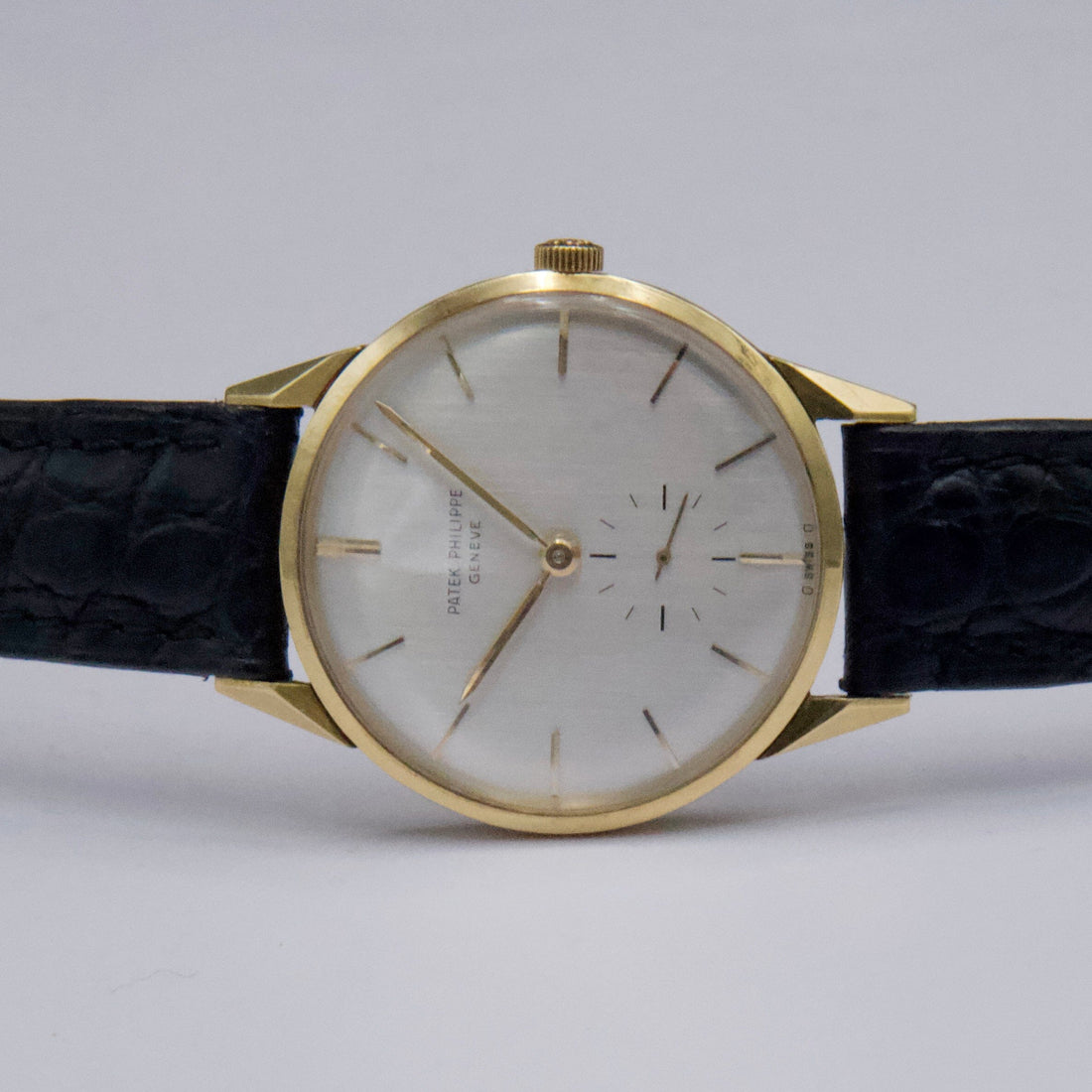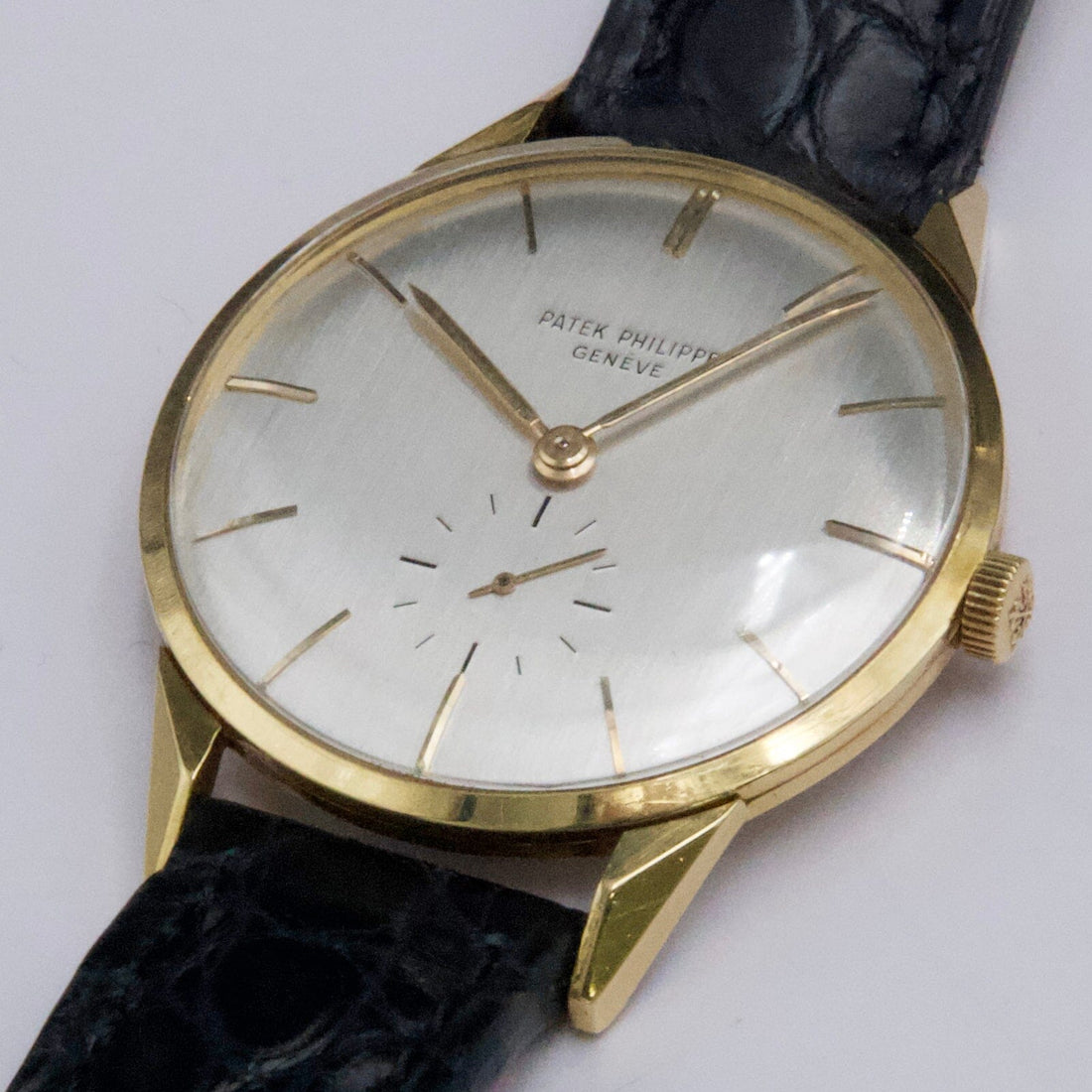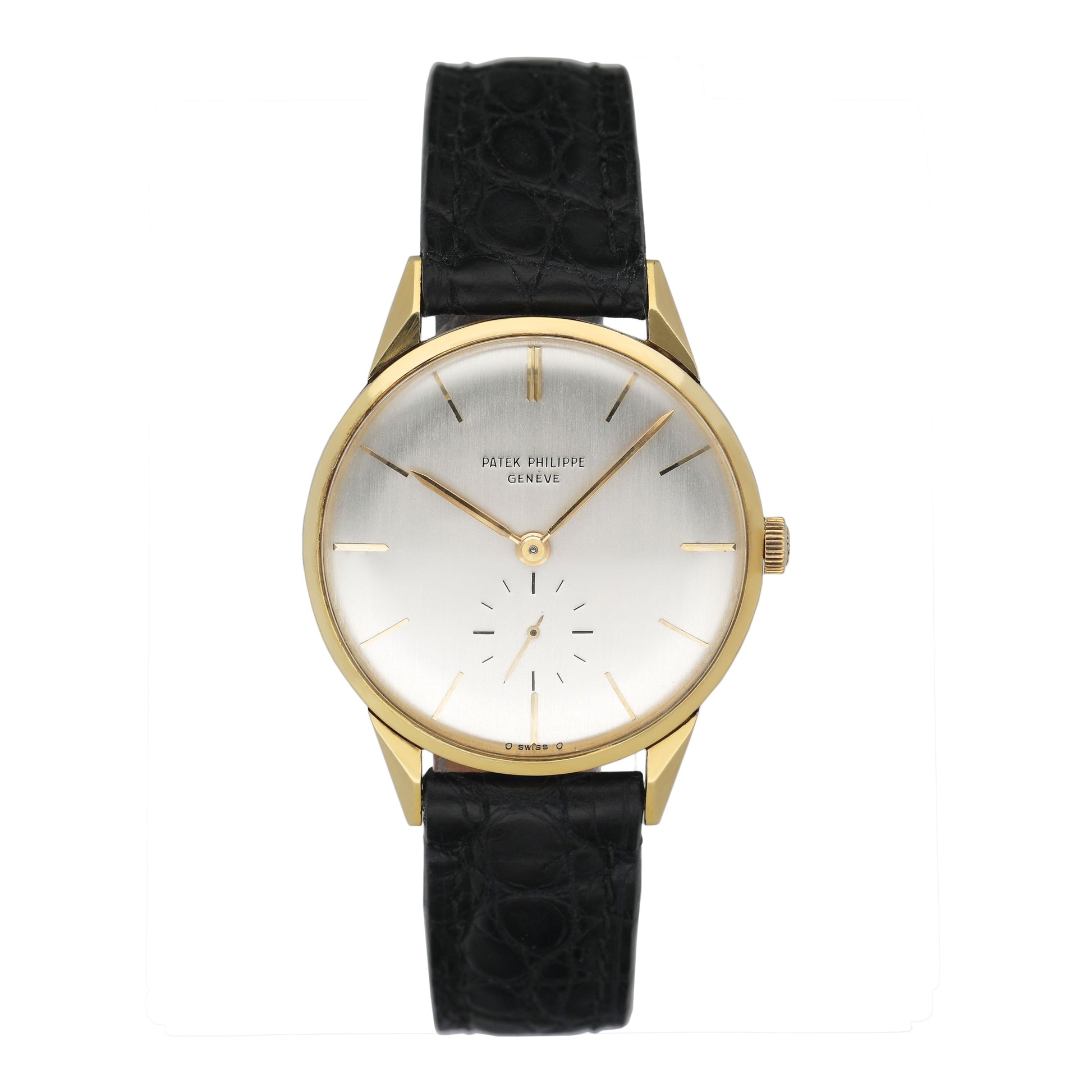 Patek Philippe Calatrava 2568/1J Mens Watch. 33mm 18K yellow gold case. 18K yellow gold bezel. Silver dial with gold hands and gold index hour markers. Small second sub-dial. Black After market leather strap with 18K yellow gold buckle. Will fit up to 7.5-inch wrist. Acrylic crystal. 18K yellow gold case back. Mechanical hand-winding movement. This watch comes with Archives.