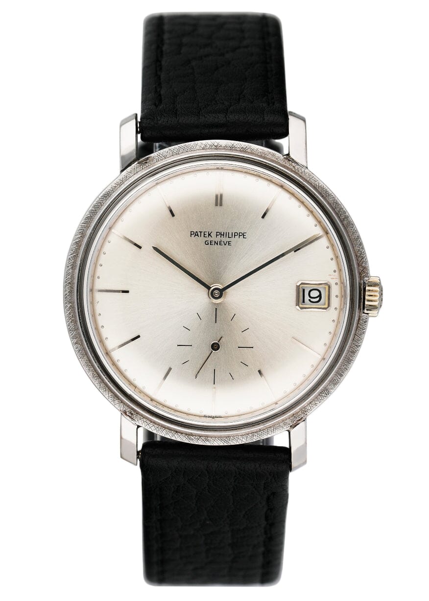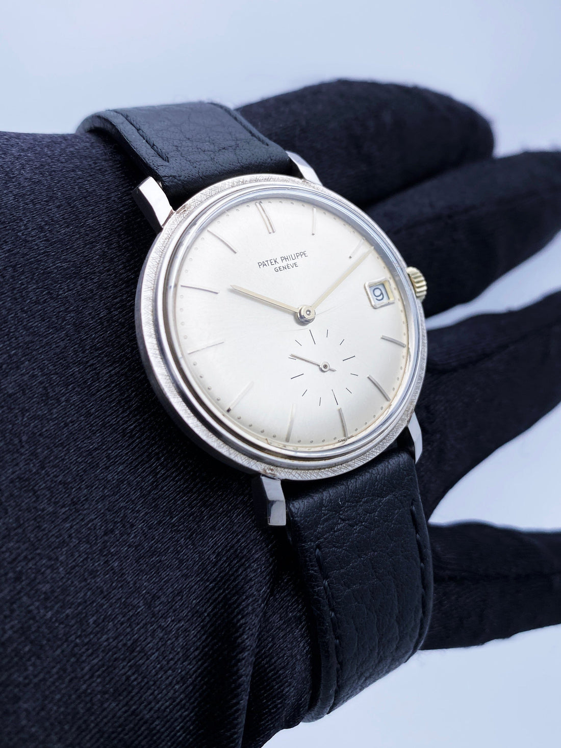 Patek Philippe Calatrava 3445G Mens Watch. 35mm 18K white gold case. 18K white gold bezel. Silver dial with gold hands and index hour markers. Small second dial display at 6 o'clock position. Date display at 3 o'clock position. Black leather after market strap with buckle. Will fit up to a 7-inch wrist. Acrylic crystal. 18K white gold case back. Automatic self-winding movement.