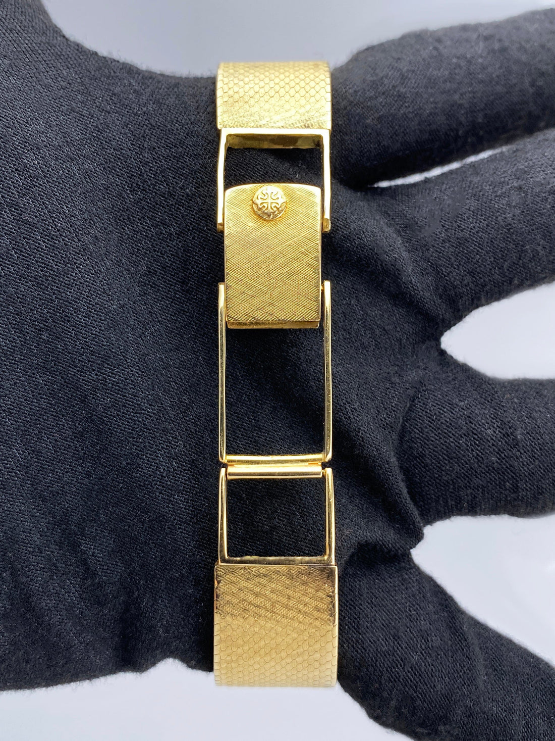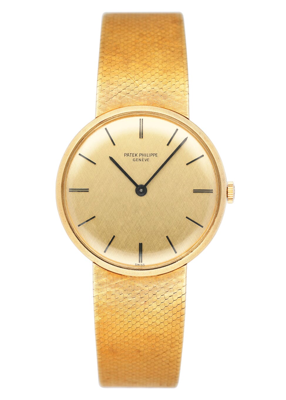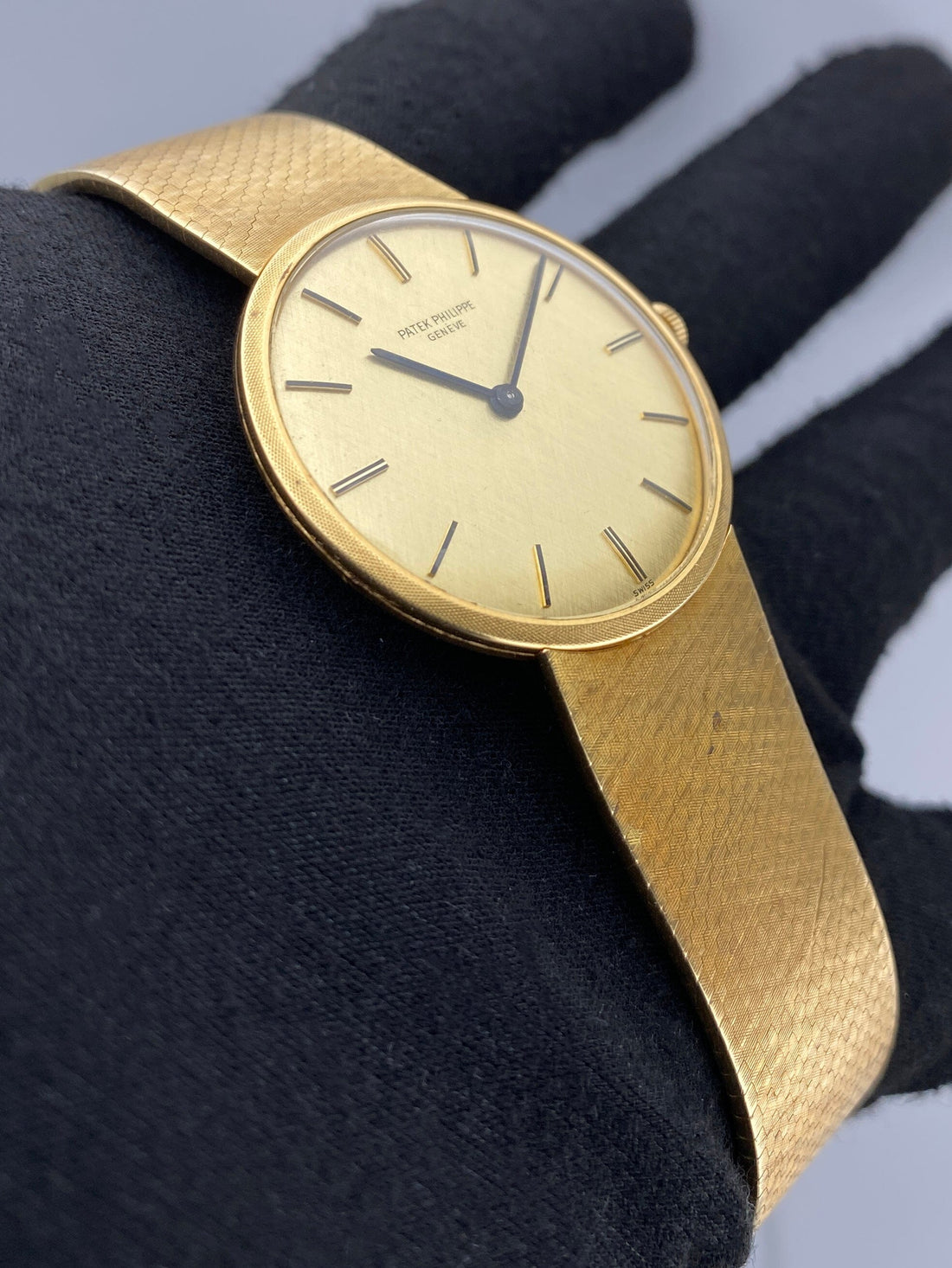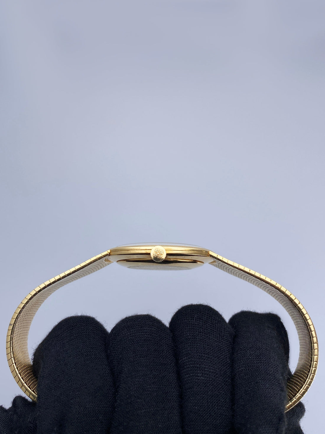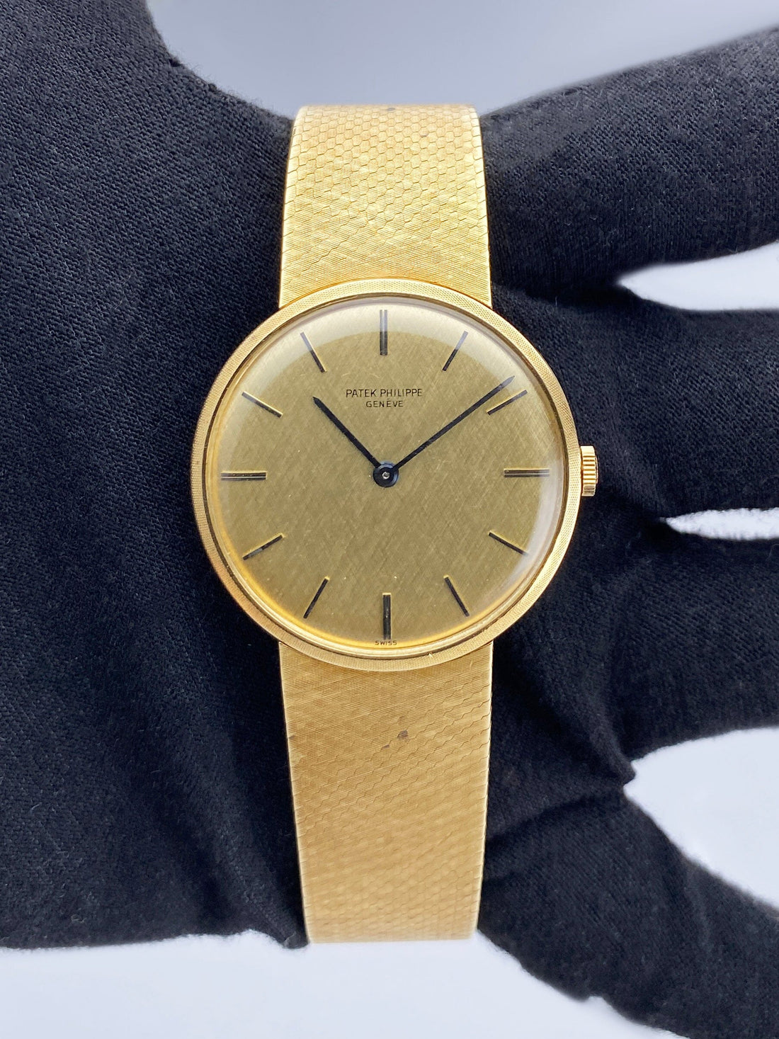 Patek Philippe Calatrava 3468/5 Mens Watch. 33mm 18K yellow gold case. 18K yellow gold bezel. Champagne dial with gold hands and index hour markers. 18K yellow gold mesh bracelet with 18K yellow gold jewelry clasp. Will fit up to a 7.5-inch wrist. Acrylic crystal. 18K yellow case back. Mechanical hand-winding movement.