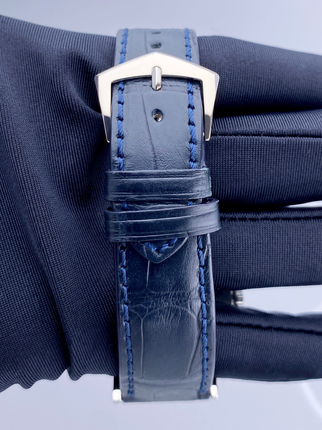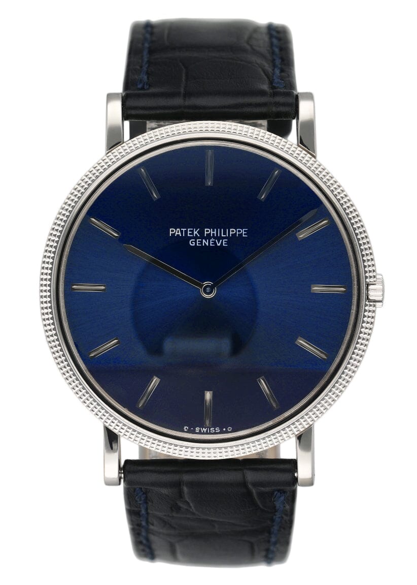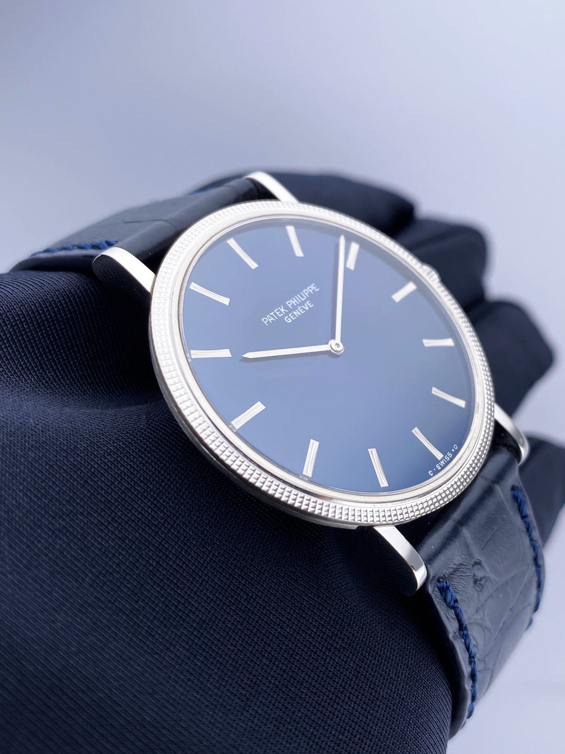 Patek Philippe Calatrava 3588/1G Mens Watch. 35.5mm 18K white gold case. 18K white gold hobnail patterned bezel. White dial with silver-tone hands and index hour markers. Blue leather Patek strap with 18K white gold buckle. Will fit up to a 7.5-inch wrist. Sapphire crystal. 18K white gold case back. Automatic self-winding movement.