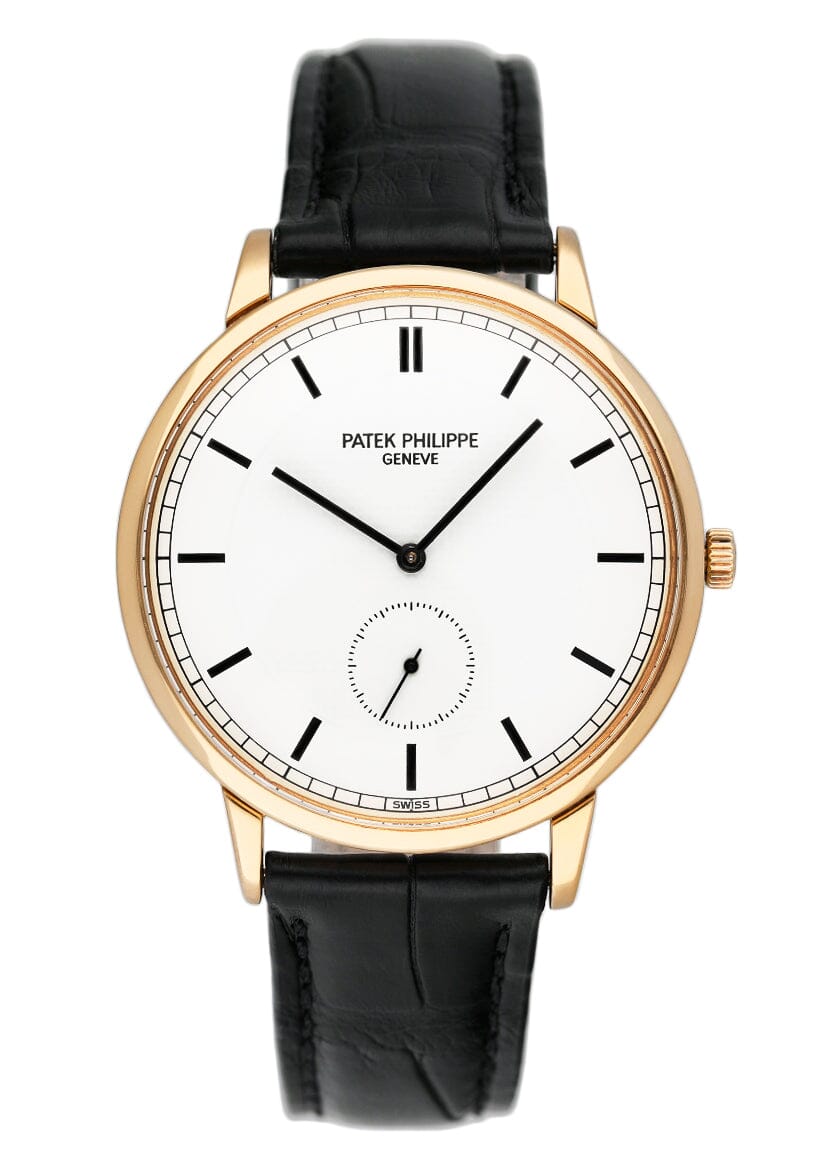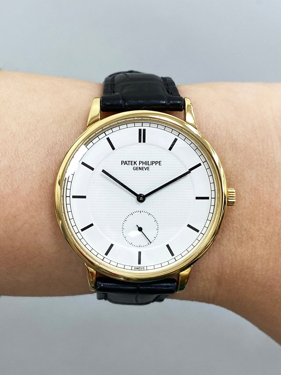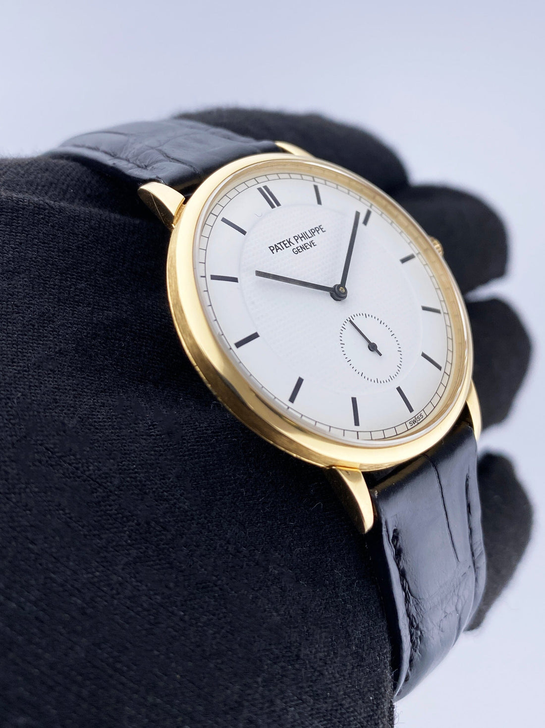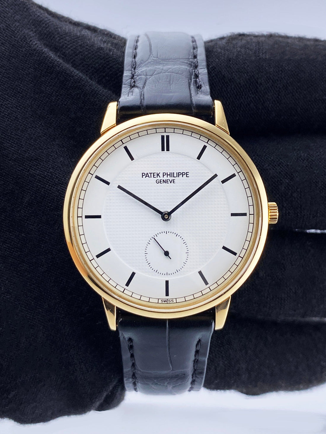 Patek Philippe Calatrava 3893J Mens Watch. 33mm 18K yellow gold case. 18K yellow gold bezel. White dial with black steel hands and index hour markers. Small second sub-dial. Black Leather strap with 18K yellow gold buckle. Will fit up to 7-inch wrist. Sapphire crystal. 18K yellow gold case back. Calibre 215 mechanical hand-winding movement.