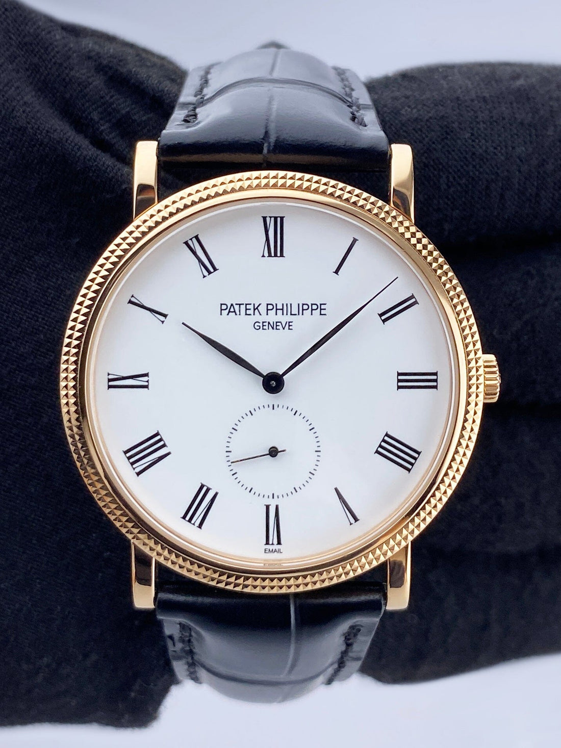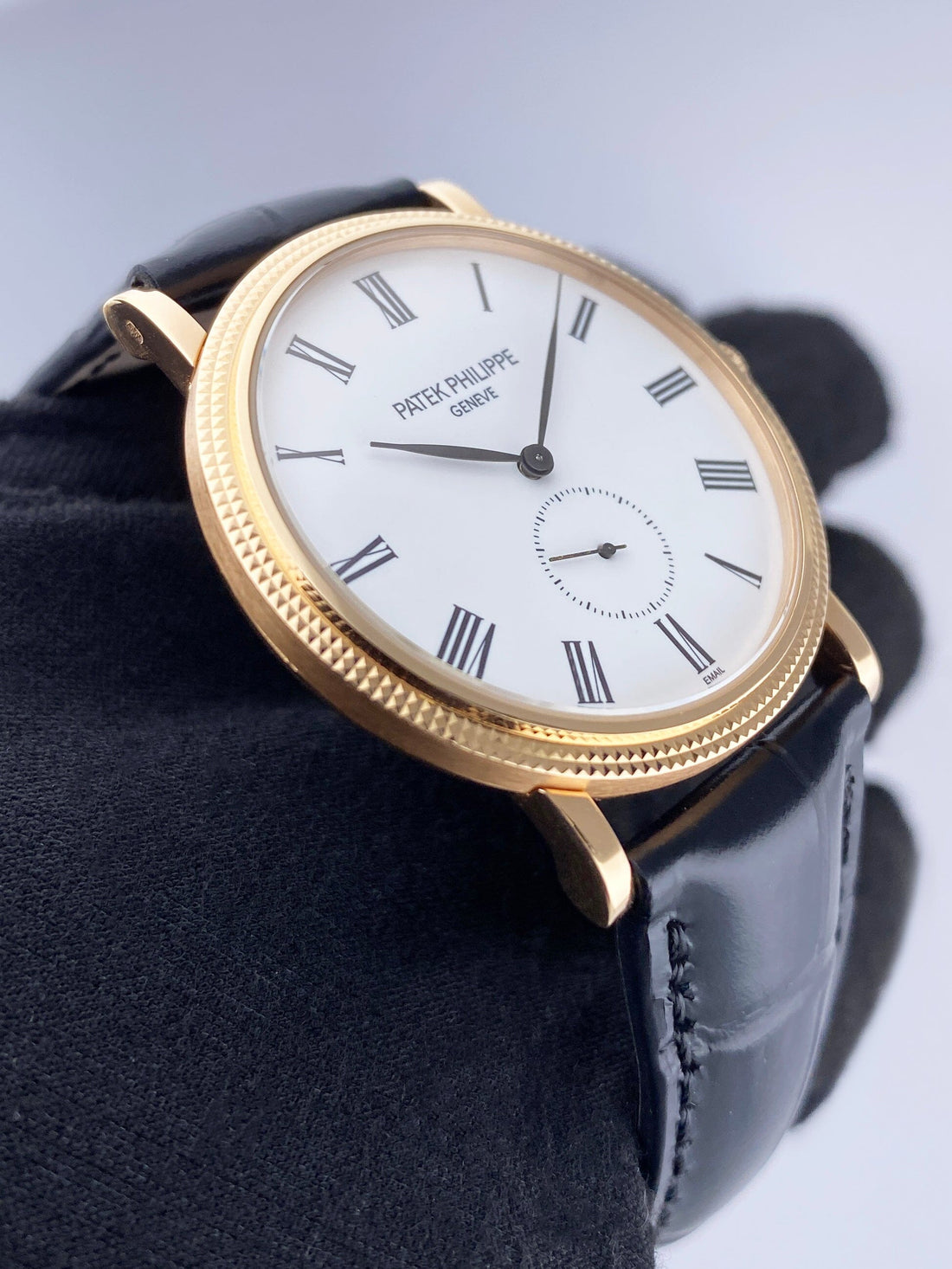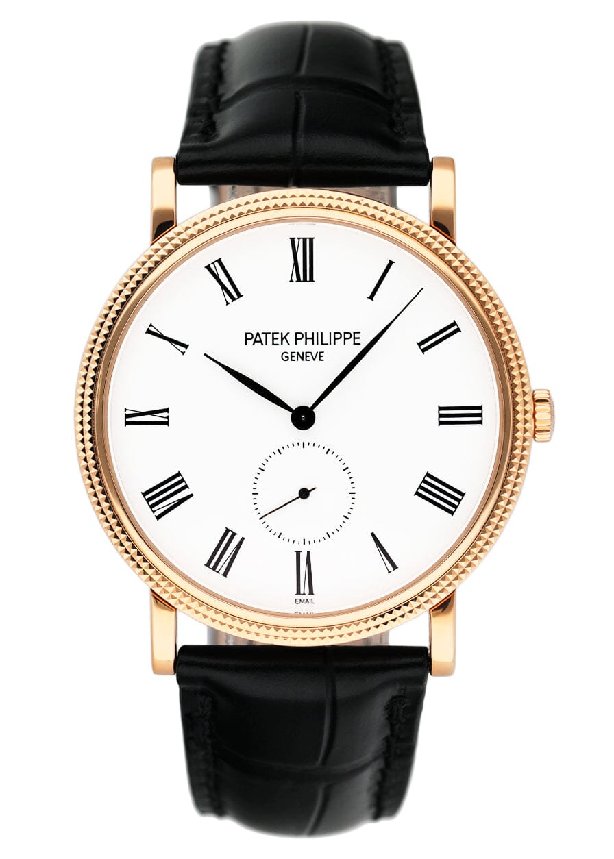 Patek Philippe Calatrava 5116R-001 Mens Watch. 36mm 18K rose gold case with Hobnail patterned bezel. White Enamel dial with black steel hands and Roman numeral hour markers. Small second sub-dial. Black leather strap with 18K rose gold buckle. Will fit up to 7.5-inch wrist. Sapphire crystal. Transparent sapphire case back. Calibre 215 PS mechanical hand wind movement with a 44-hour power reserve.