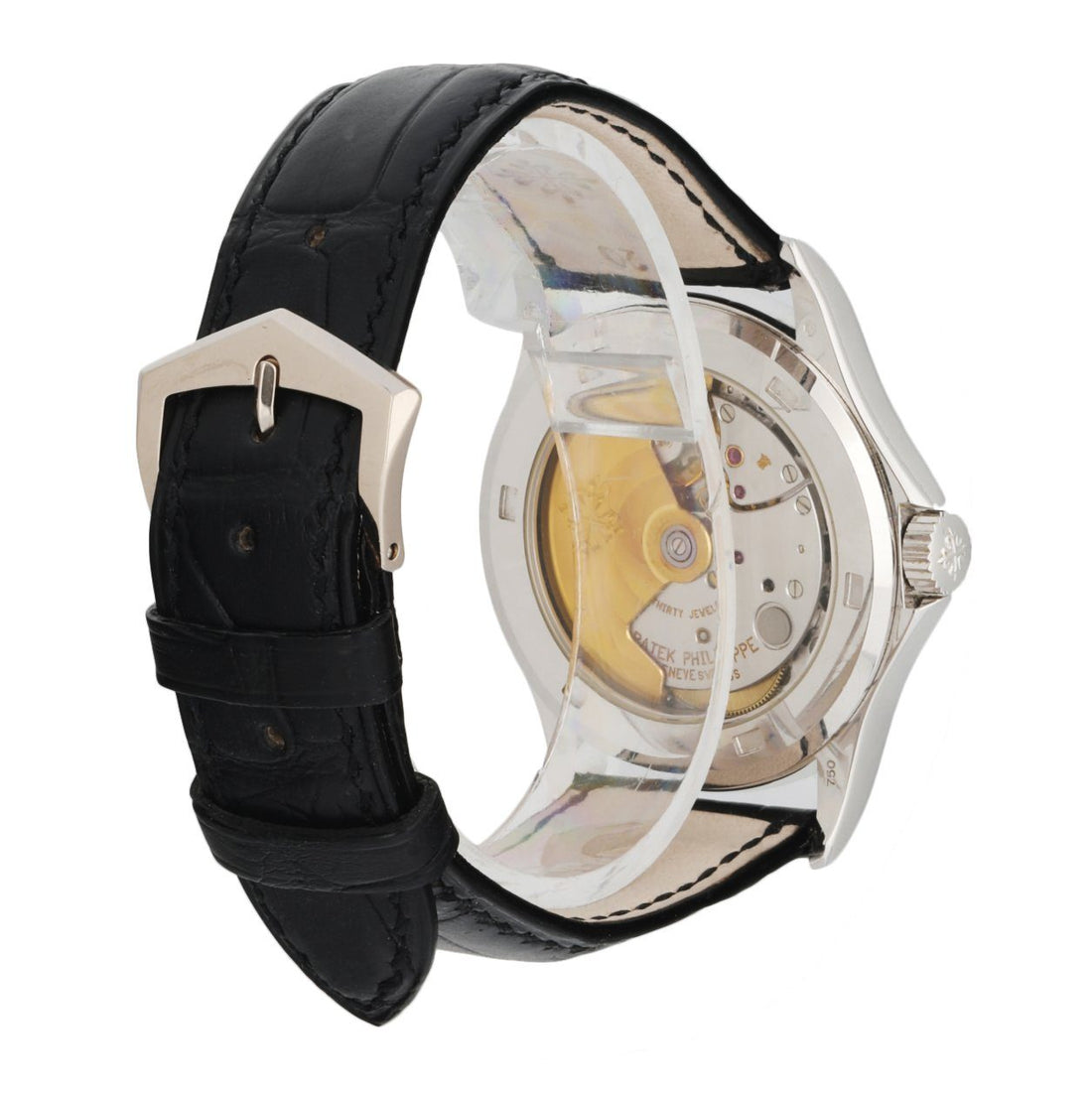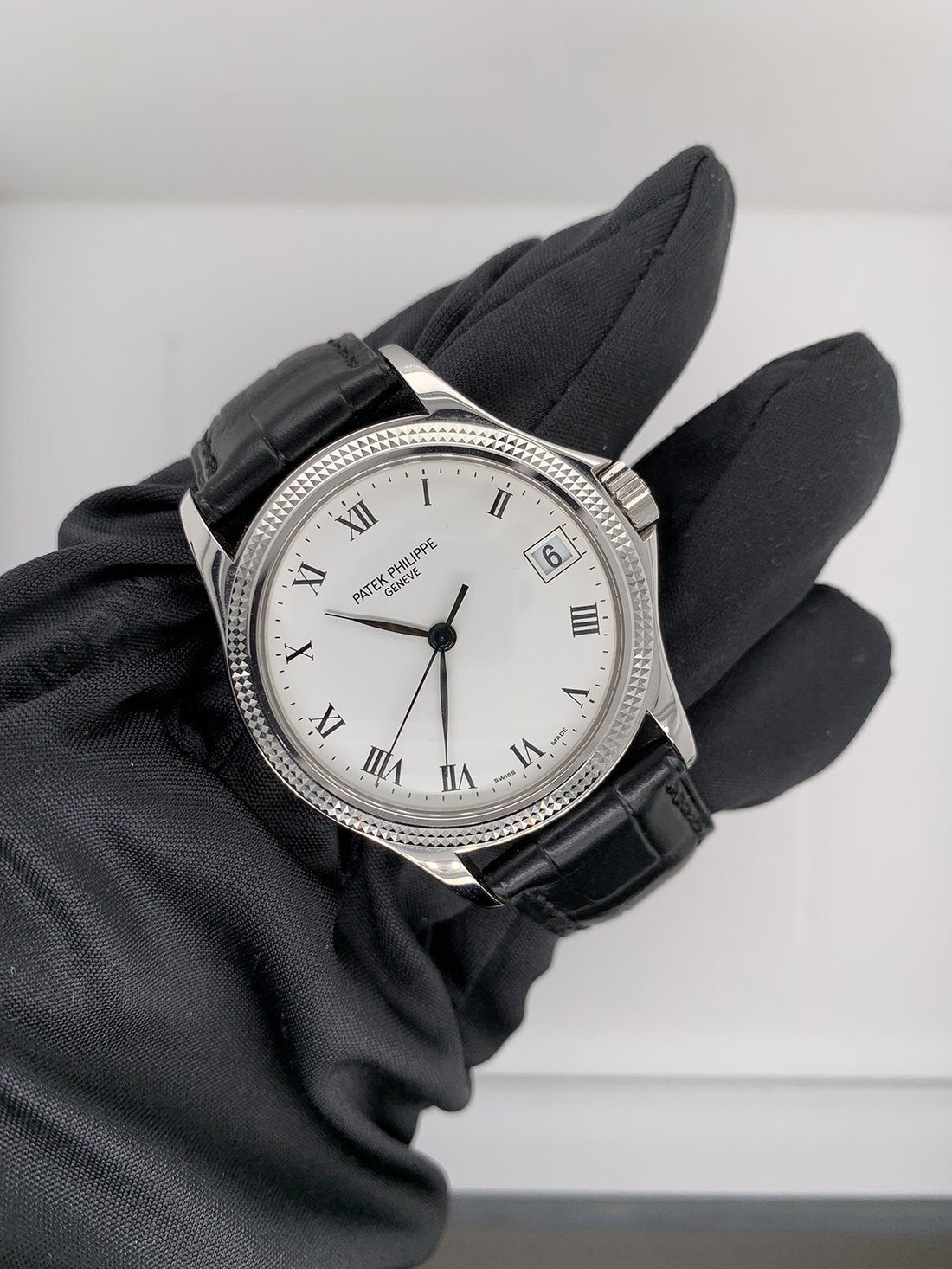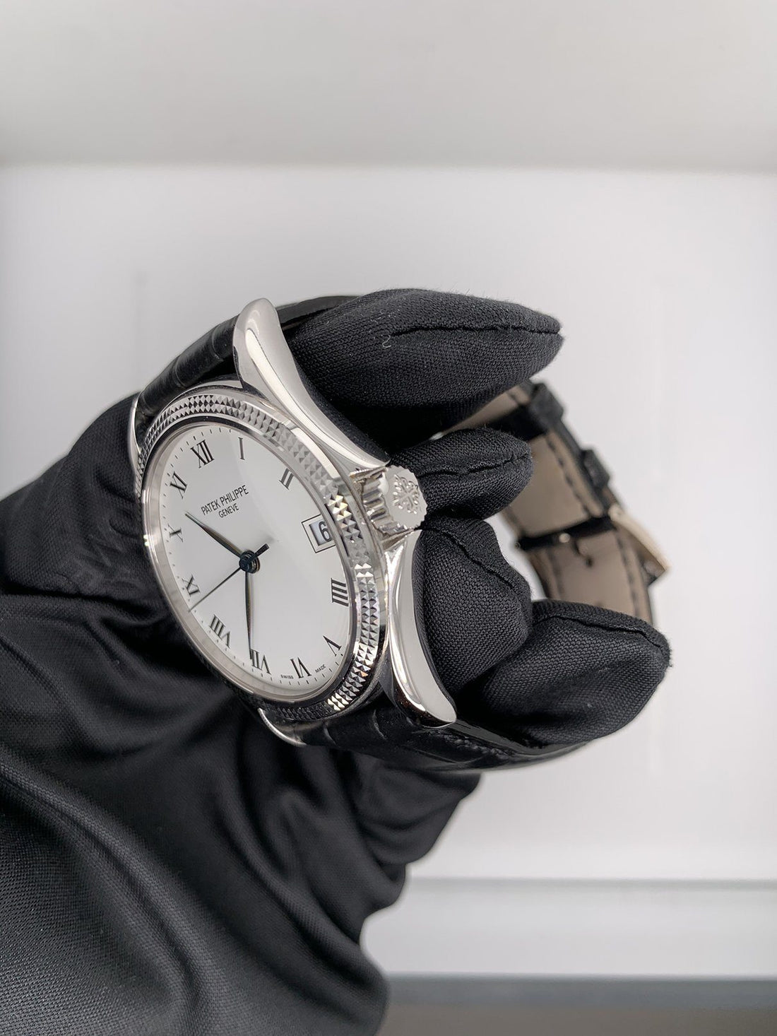 Patek Philippe Calatrava 5117G Men's Watch. 36mm 18K white gold case with 18K white gold Hobnail patterned bezel. White dial with black steel hands and black Roman numeral hour markers. Date display at 3 o'clock position. Black Alligator Leather strap with 18K white gold buckle. Will fit up to 7.75-Inch wrist. Sapphire crystal and transparent sapphire case back. Automatic self winding movement. This watch comes with original box & Papers.
