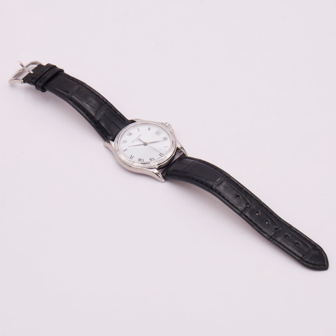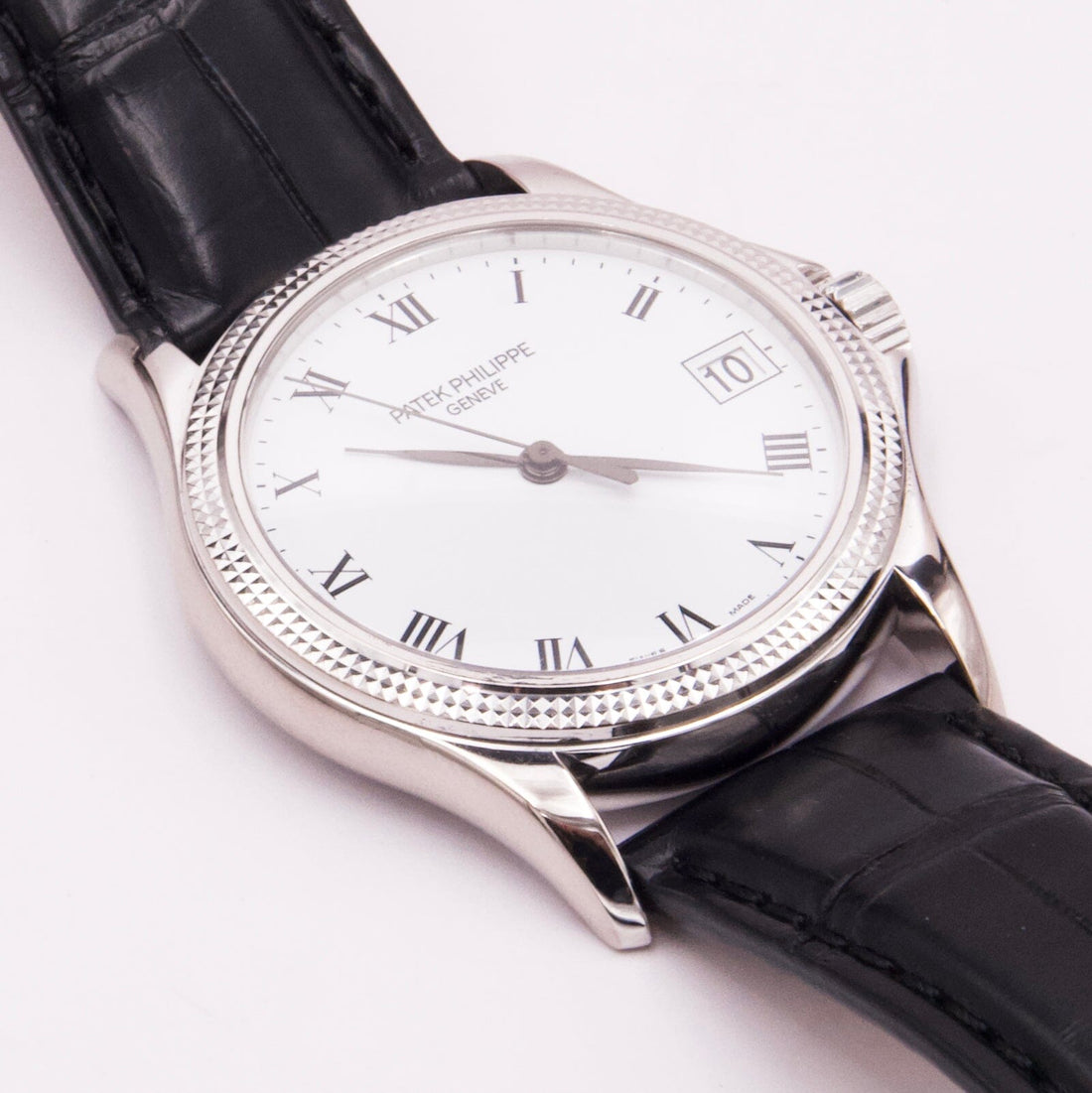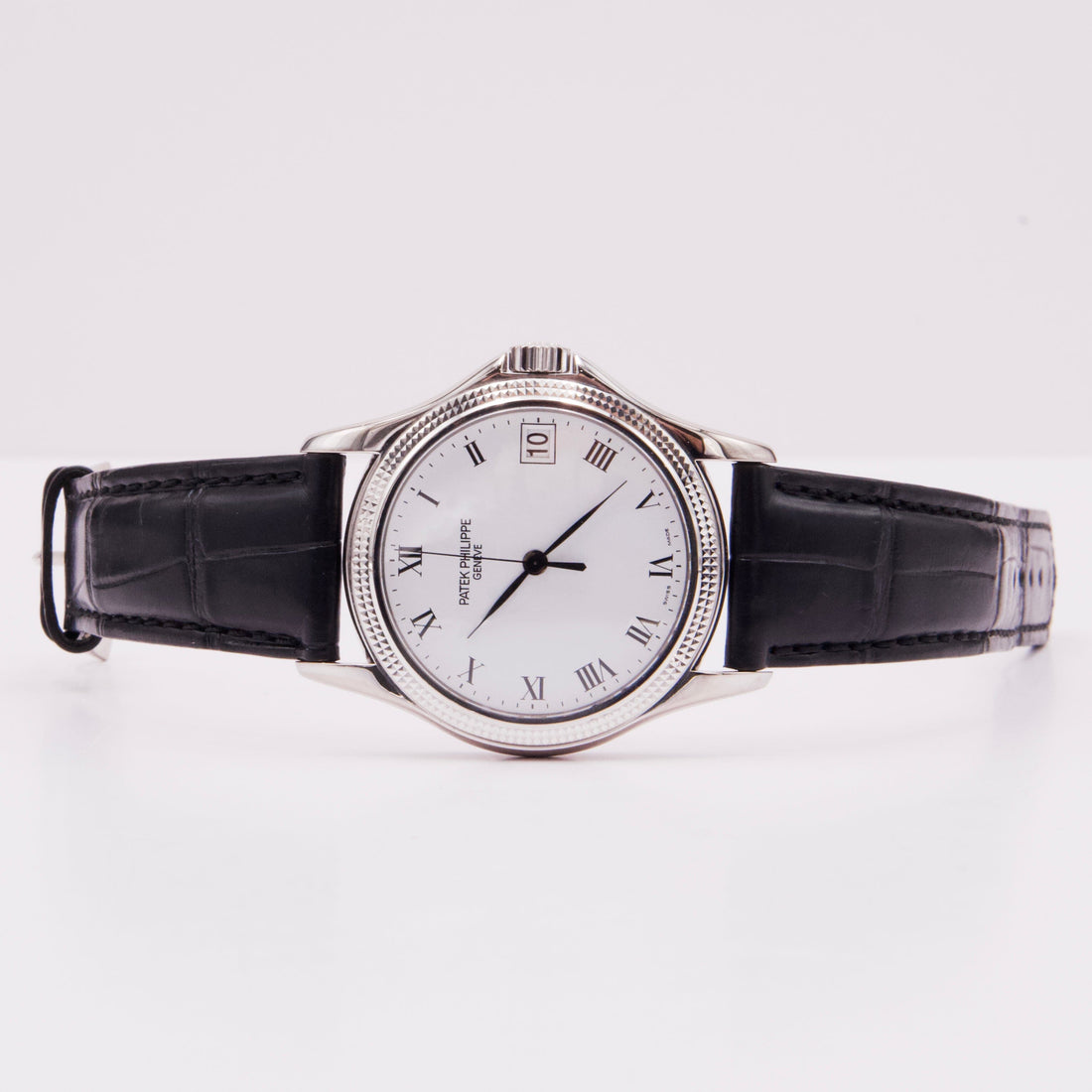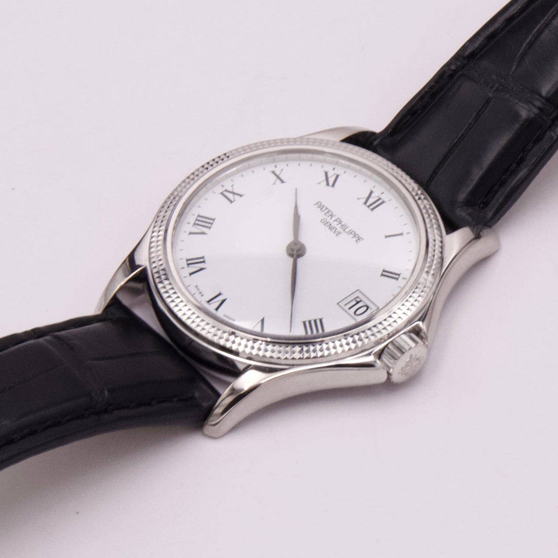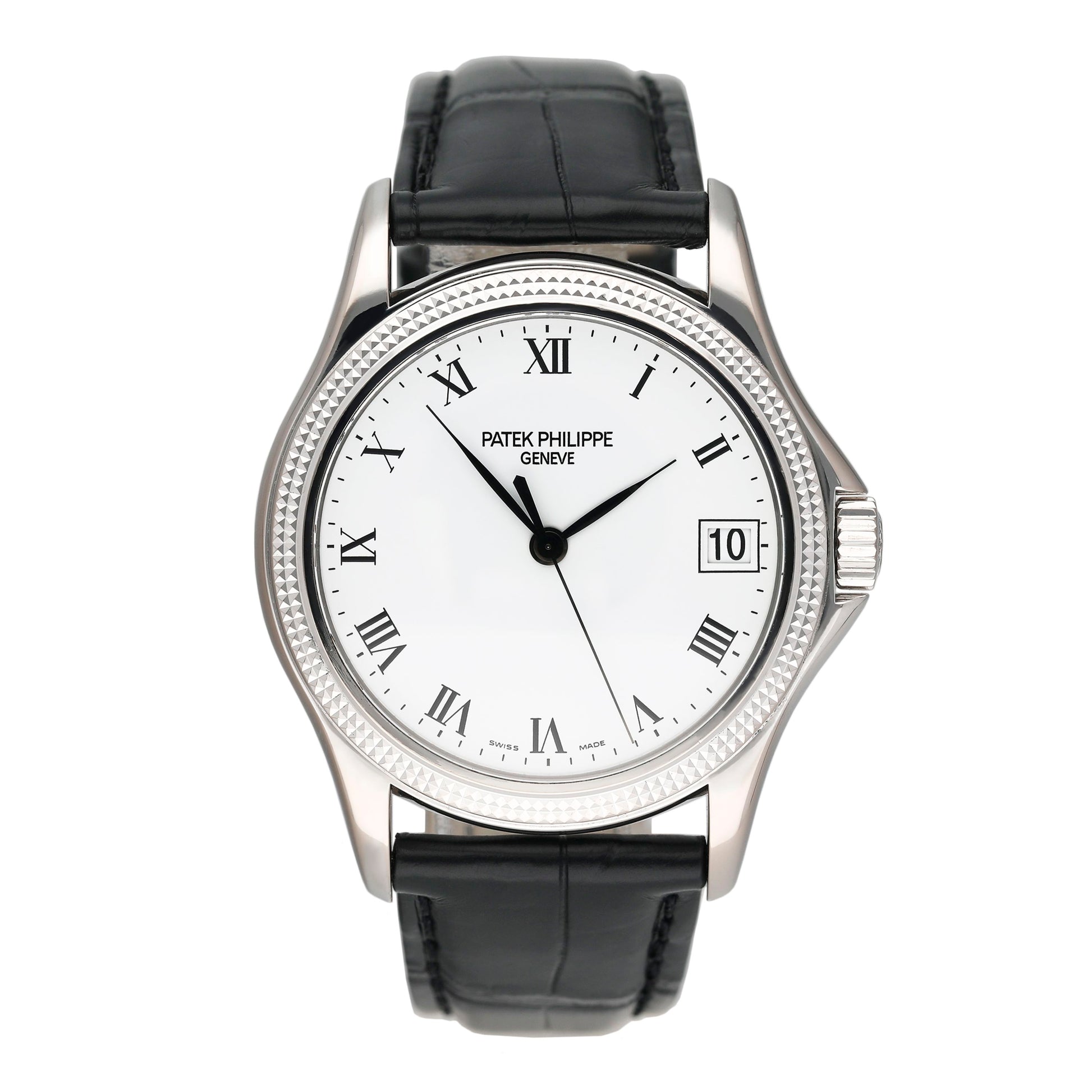 Patek Philippe Calatrava 5117G Mens Watch. 37mm 18K white gold case. 18K white gold hobnail patterned bezel. White dial with black hands and black Roman numeral hour markers. Date is displayed at 3 o'clock position. Black leather Patek strap with 18K white gold buckle. Will fit up to a 7.5-inch wrist. Sapphire crystal. Transparent sapphire crystal case back. Automatic self-winding movement. This watch comes with original Papers.