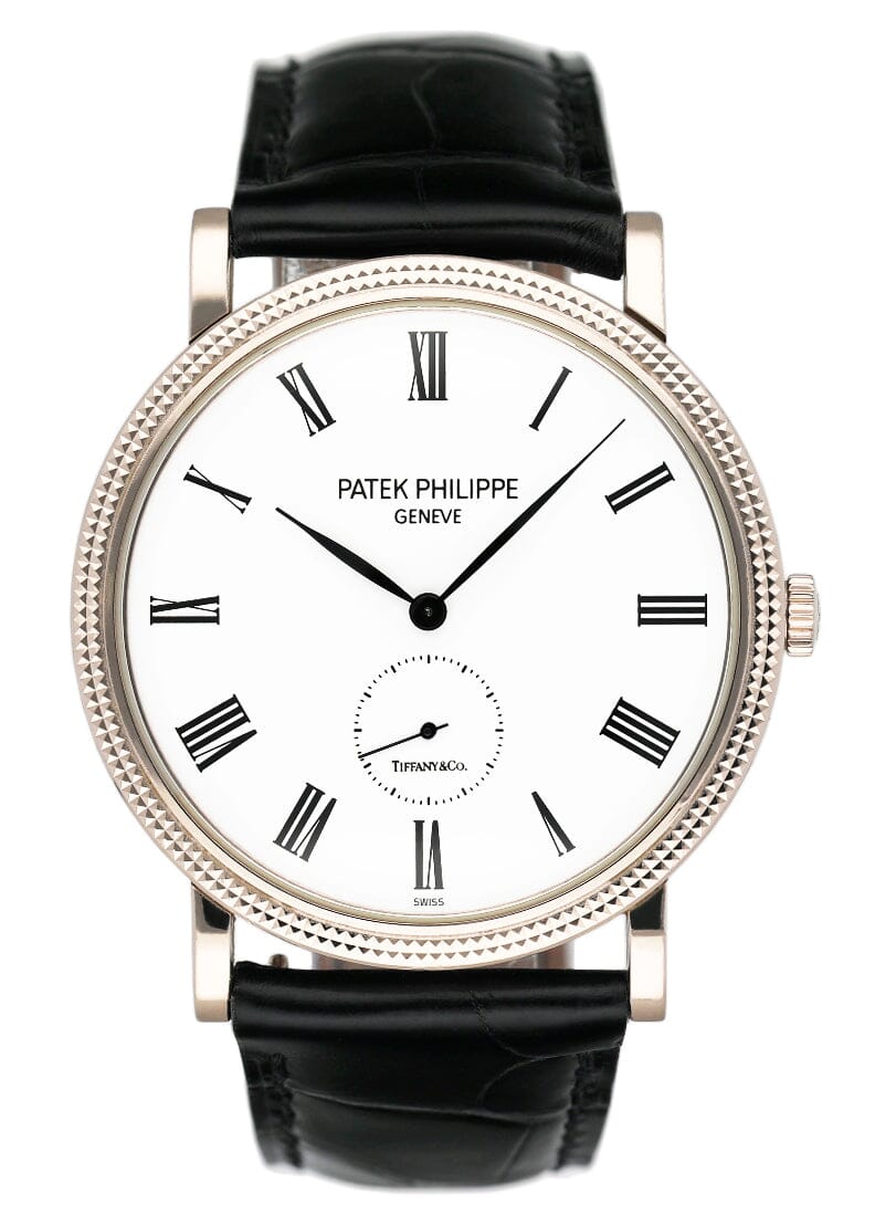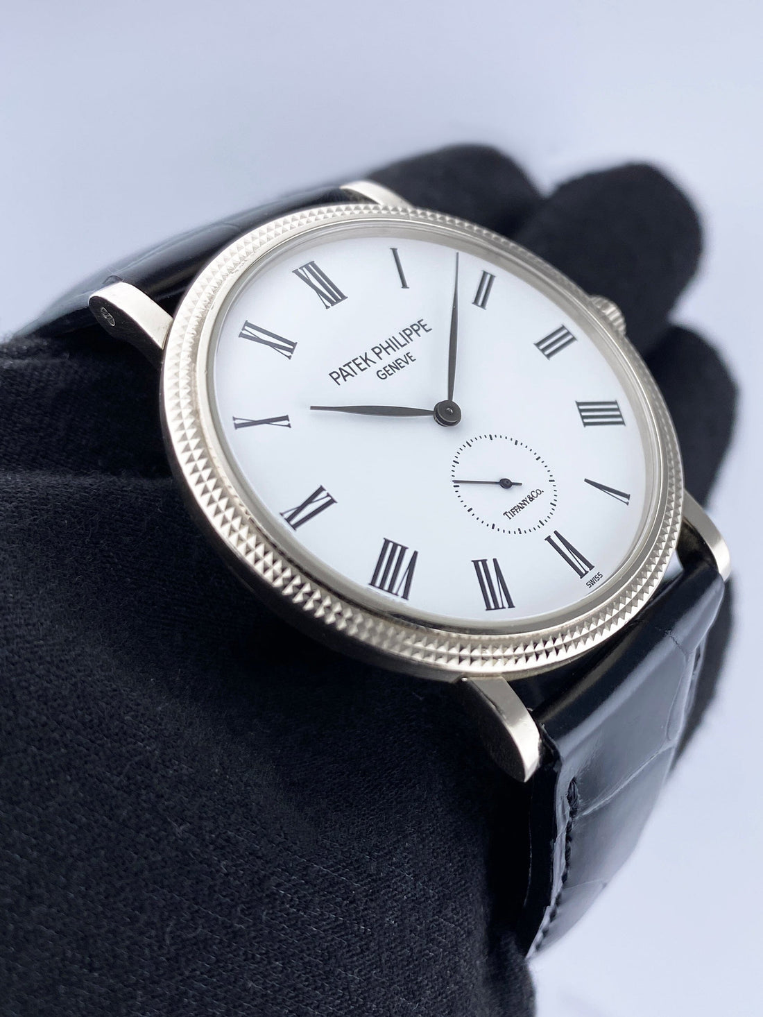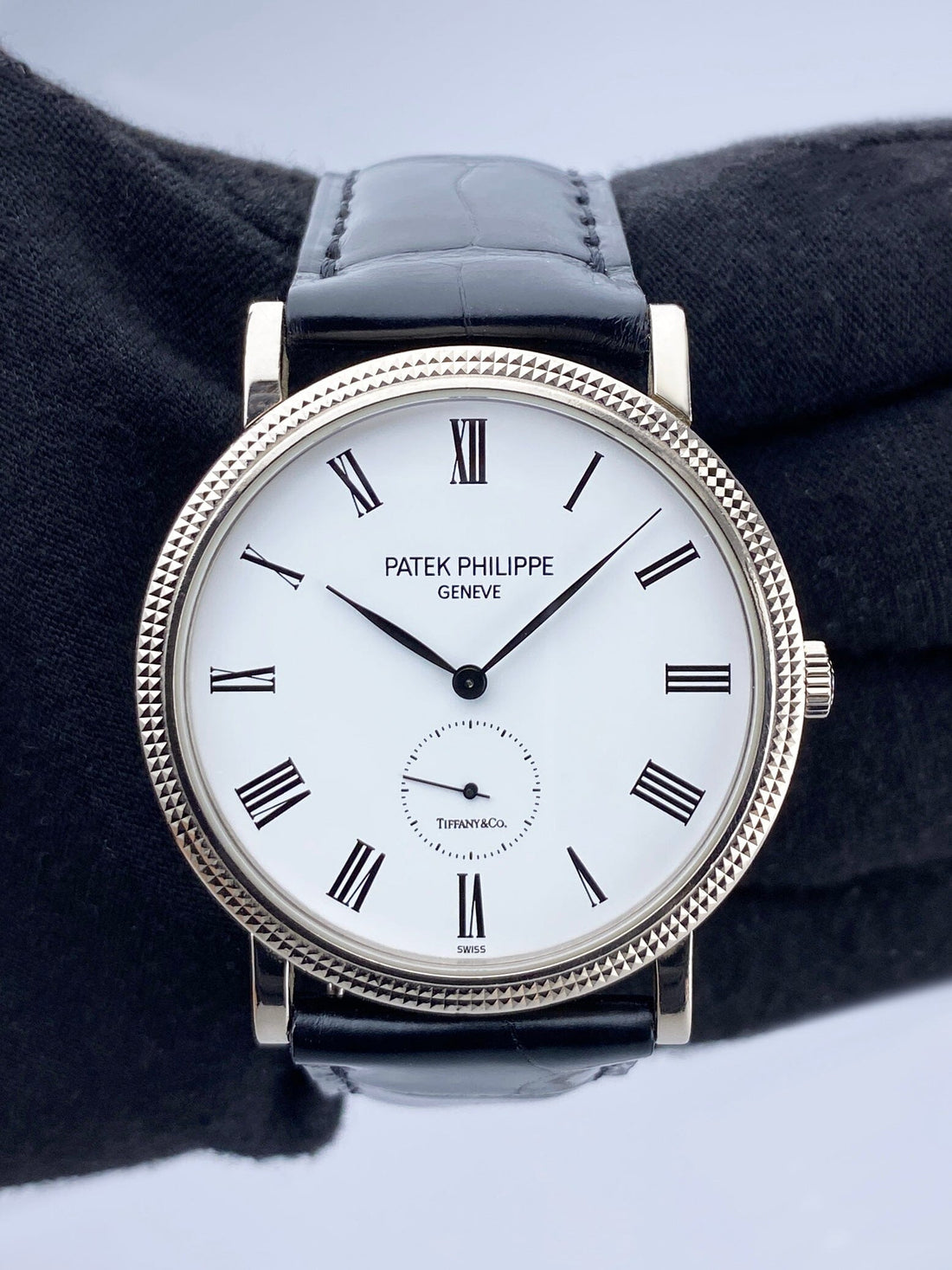 Patek Philippe Calatrava 5119G-001 Mens Watch. 36mm 18K white gold case. 18K white gold hobnail patterned bezel. White dial with Tiffany& Co. stamped. Black hands and black Roman numeral hour markers. Small second dial display at 6 o'clock position. Black leather Patek strap with 18K white gold buckle. Will fit up to a 7.5-inch wrist. Sapphire crystal. Transparent sapphire crystal case back. Calibre 215 mechanical hand-winding movement.