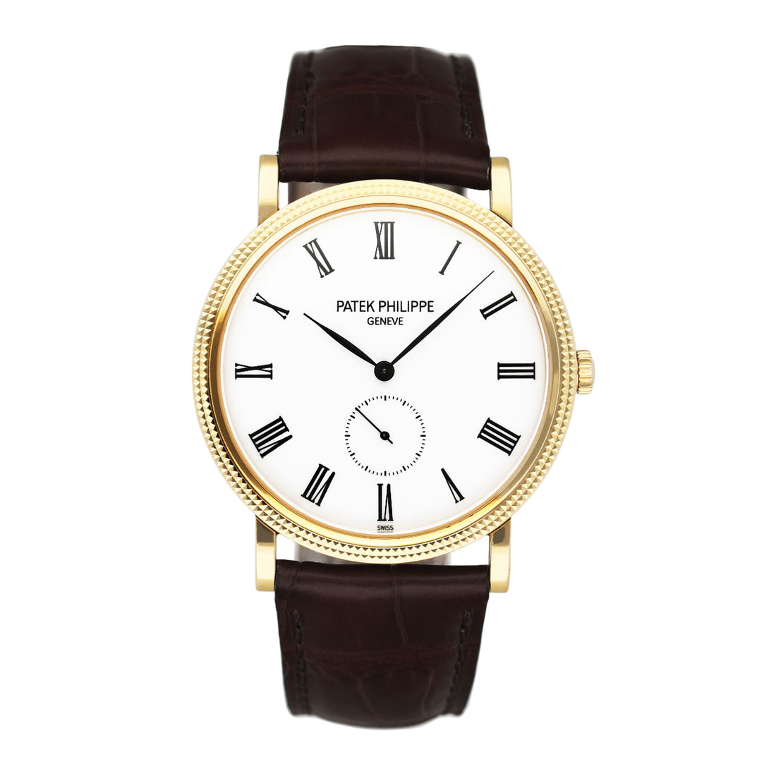 Patek Philippe Calatrava 5119J-001 Mens Watch. 36mm 18K yellow gold case with Hobnail patterned bezel. White dial with black steel hands and Roman numeral hour markers. Small second sub-dial. Brown Leather strap with 18K yellow gold buckle. Will fit up to 7.5-inch wrist. Sapphire crystal. Transparent sapphire crystal case back. Calibre 215 PS mechanical hand-winding movement.