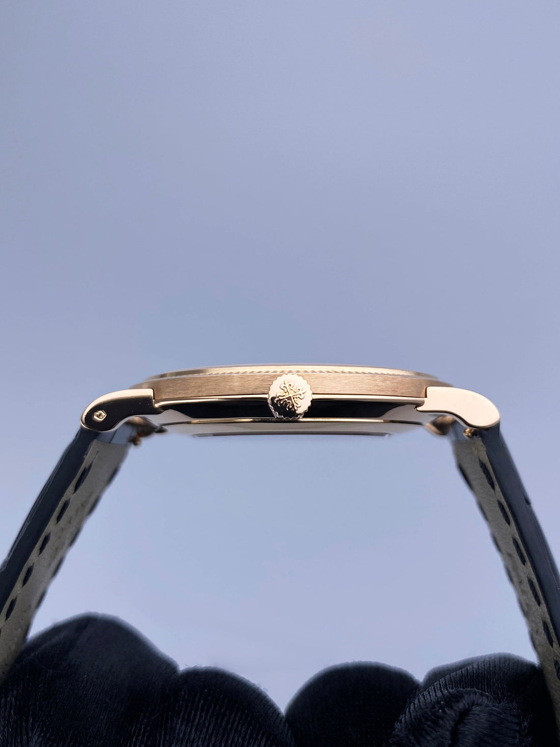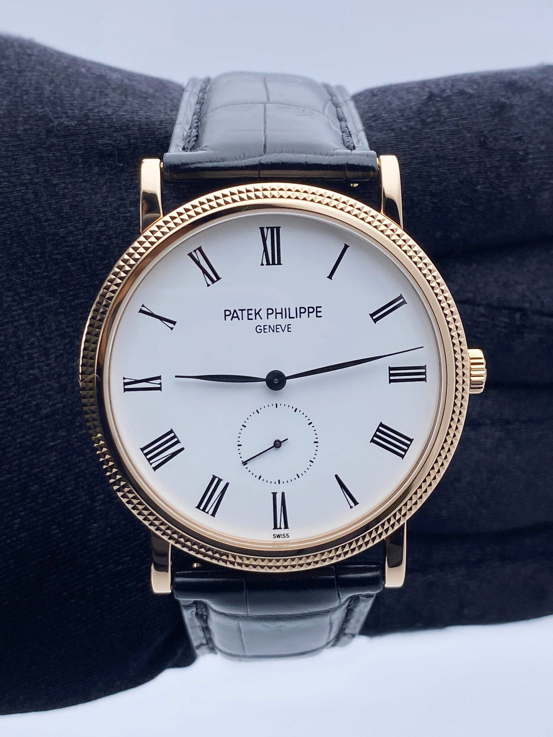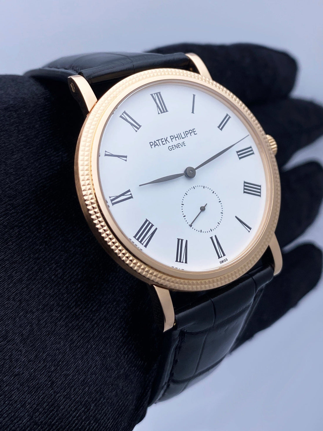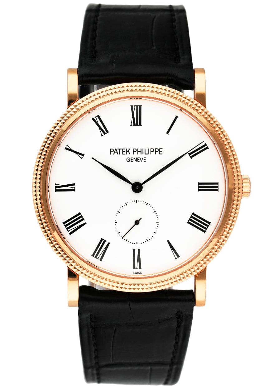 Patek Philippe Calatrava 5119R-001 Mens Watch. 36mm 18K rose gold case with Hobnail patterned bezel. White dial with black steel hands and Roman numeral hour markers. Small second sub-dial. Black leather strap with 18K rose gold buckle.Will fit up to a 7.5-inch wrist. Sapphire crystal. Transparent sapphire case back. Calibre 215 PS mechanical hand-winding movement with a 44-hour power reserve.