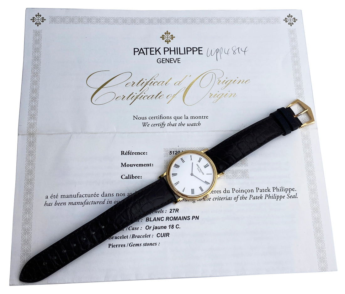 Patek Philippe Calatrava 5120J-001 Mens Watch. 35mm 18K yellow Gold case. 18K yellow gold stationary bezel. White dial with black steel hands and Roman numeral hour markers. Brown leather strap with yellow gold buckle. Will fit up to a 7-inch wrist. Sapphire crystal. Transparent sapphire case back. Calibre 240 Automatic self-winding movement with a 48-hour power reserve. This watch comes with original Box and Papers.
