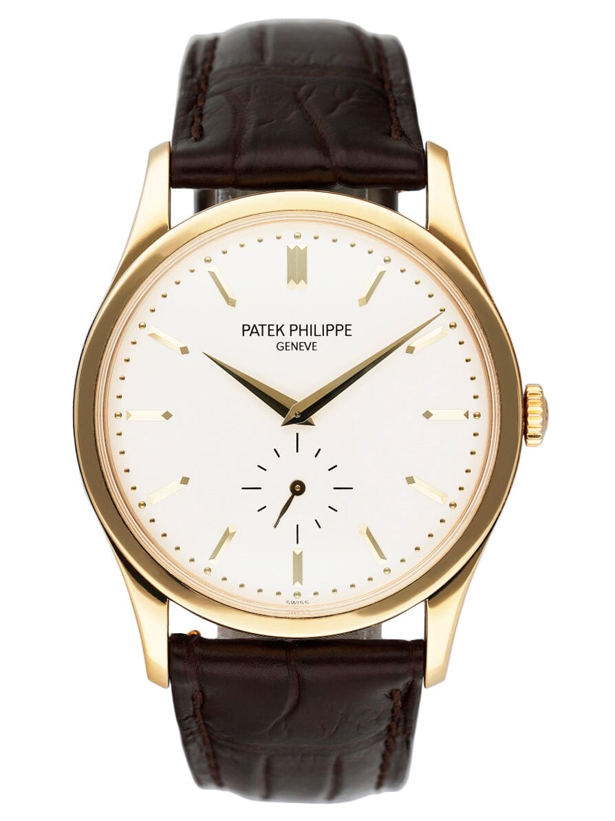 Patek Philippe Calatrava 5196J Mens Watch. 37mm 18K yellow gold case. 18K yellow gold smoothed bezel. Silver dial with gold hands and index hour markers. Small second dial display at 6 o'clock position. Brown leather Patek strap with 18K yellow gold buckle. Will fit up to a 7-inch wrist. Sapphire crystal. 18K yellow gold case back. Mechanical hand-winding movement.