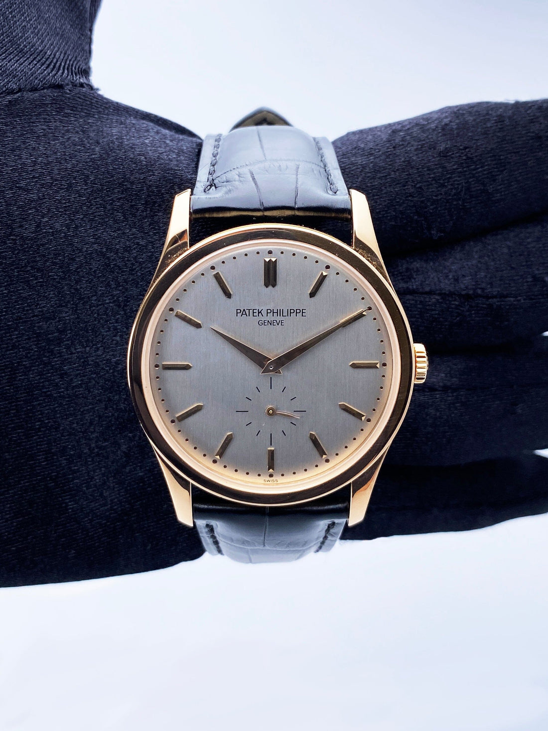 Patek Philippe Calatrava 5196R-001 Mens Watch. 37mm 18K rose gold case with 18K rose gold smooth bezel. Silver dial with rose gold hands and rose gold index hour marker. Small second sub-dial display between 5 & 7 o'clock position. Black leather strap with 18K rose gold buckle. Will fit up to a 7-inch wrist. Sapphire crystal. 18K rose gold case back. Calibre 215 PS mechanical hand winding movement up to 48 hours power reserve.