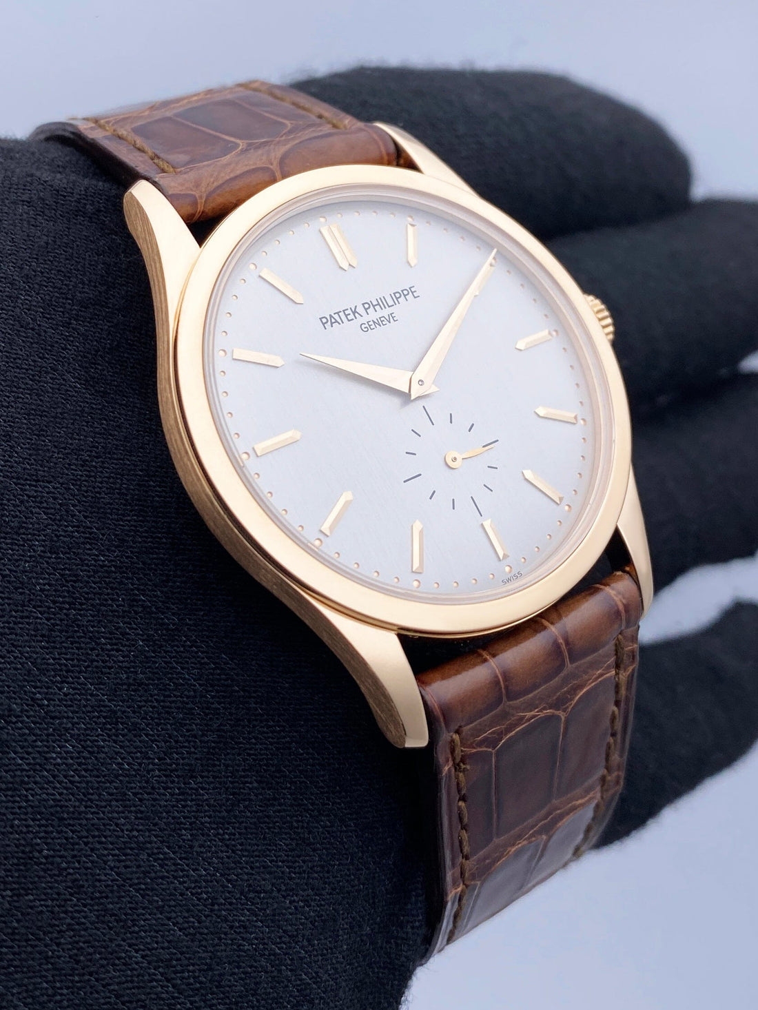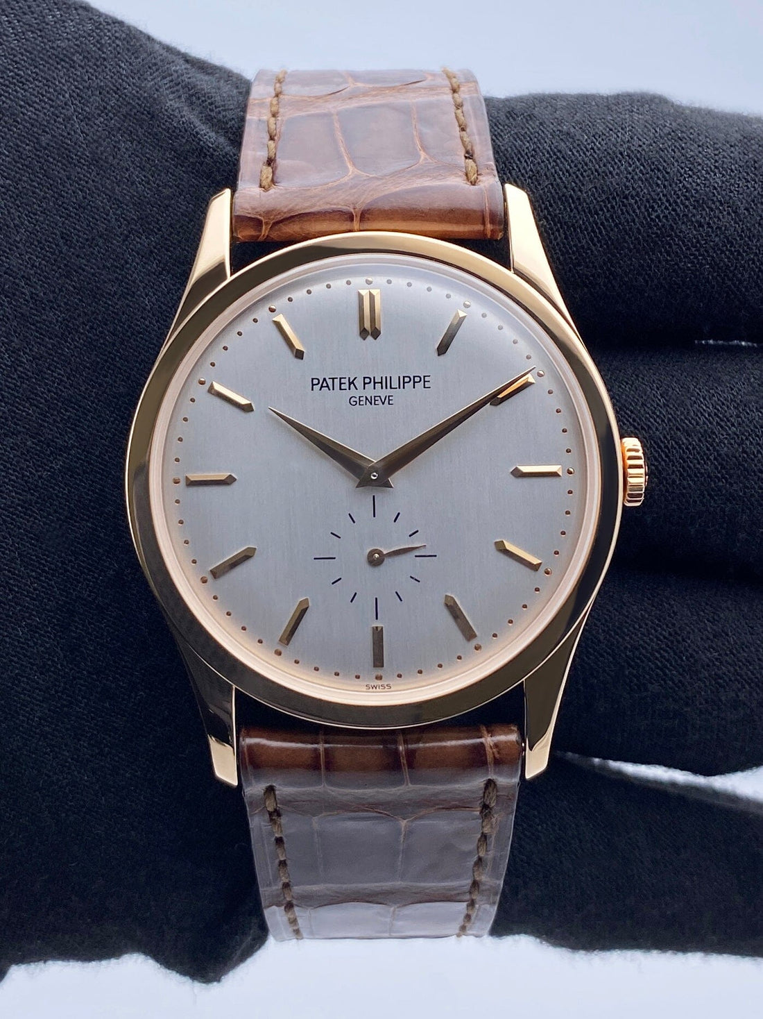 Patek Philippe Calatrava 5196R-001 Mens Watch. 37mm 18K rose gold case with 18K rose gold smoothed bezel. Silver dial with rose gold hands and rose gold index hour marker. Small second sub-dial display between 5 & 7 o'clock position. Brown leather strap with 18K rose gold buckle. Will fit up to 7.5-inch wrist. Sapphire crystal. 18K rose gold case back. Calibre 215 PS mechanical hand winding movement up to 48 hours power reserve.