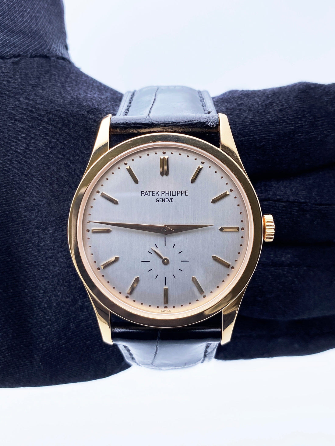 Patek Philippe Calatrava 5196R-001 Mens Watch. 37mm 18K rose gold case. Grey dial with rose gold hands and rose gold index hour marker. Small second sub-dial display between 5 & 7 o'clock position. Black leather strap with 18K rose gold buckle. Will fit up to 7-inch wrist. Sapphire crystal. 18K rose gold case back. Calibre 215 PS mechanical hand winding movement up to 48 hours power reserve. This watch comes with original box and Papers.
