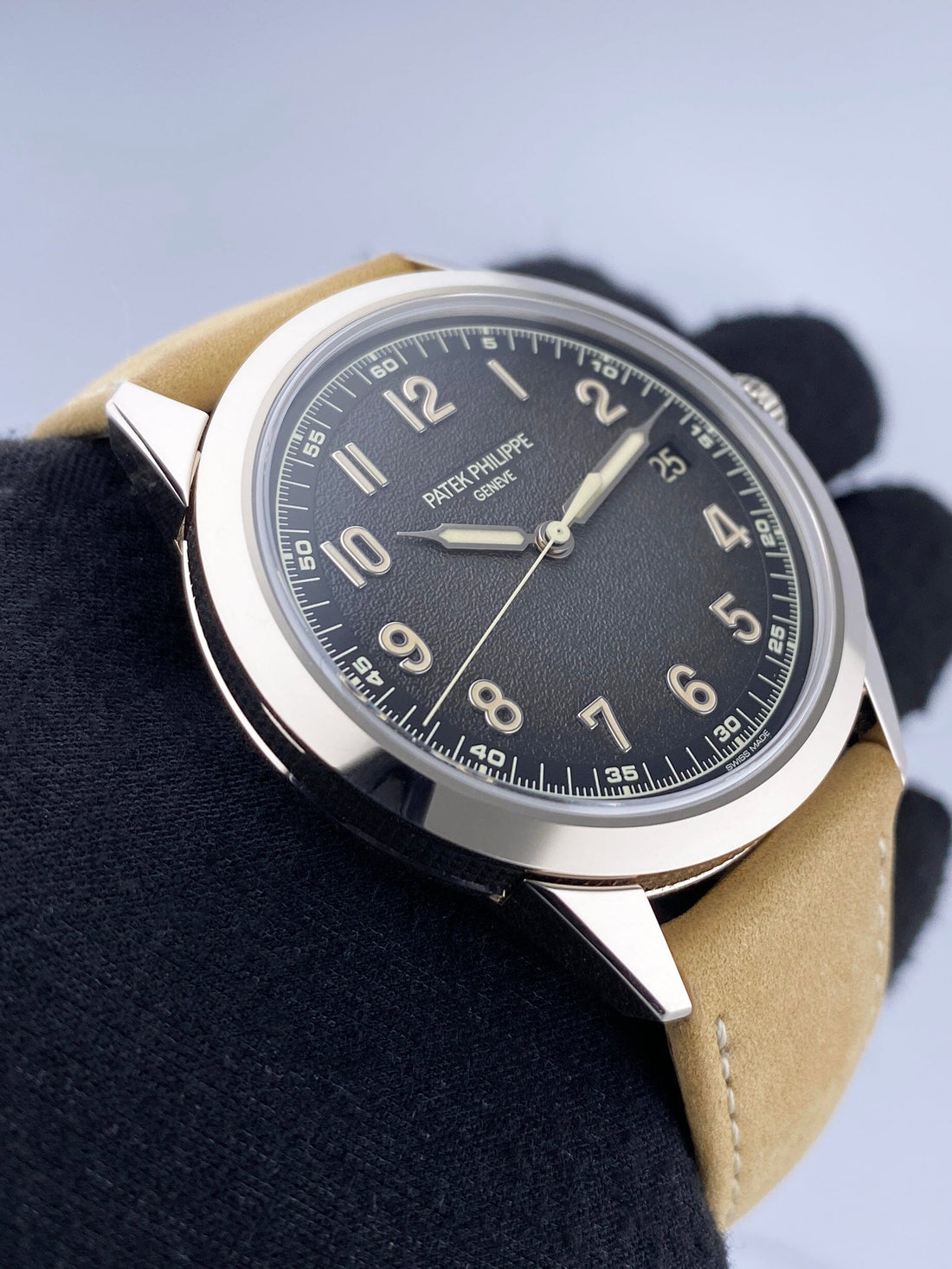 Patek Philippe Calatrava 5226G-001 Mens Watch. 40mm 18K white gold case. 18K white gold smoothed bezel. Textured charcoal gray, black gradient rim dial with Silver-tone hands and Arabic numeral hour markers. The date is displayed at 3 o'clock position. Brown leather Patek strap with 18K white gold buckle. Will fit up to a 7.5-inch wrist. Sapphire crystal. Transparent sapphire crystal case back. Automatic self-winding movement. This watch comes with original Box and Papers.