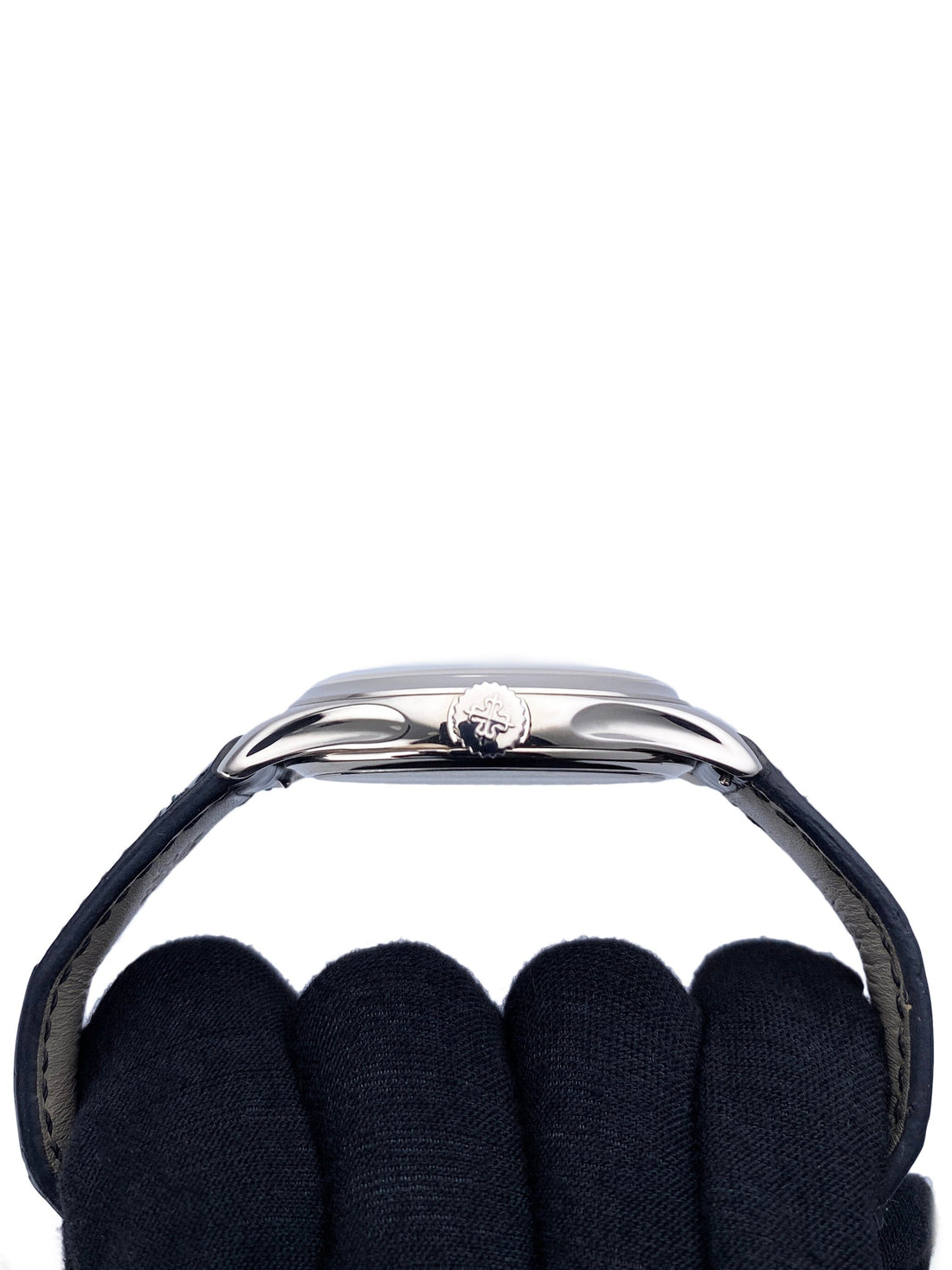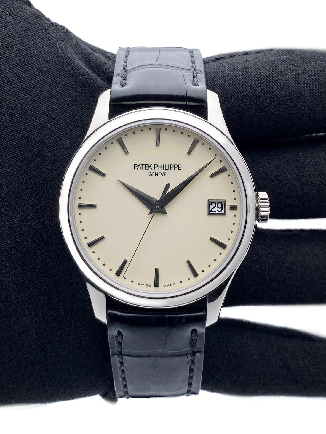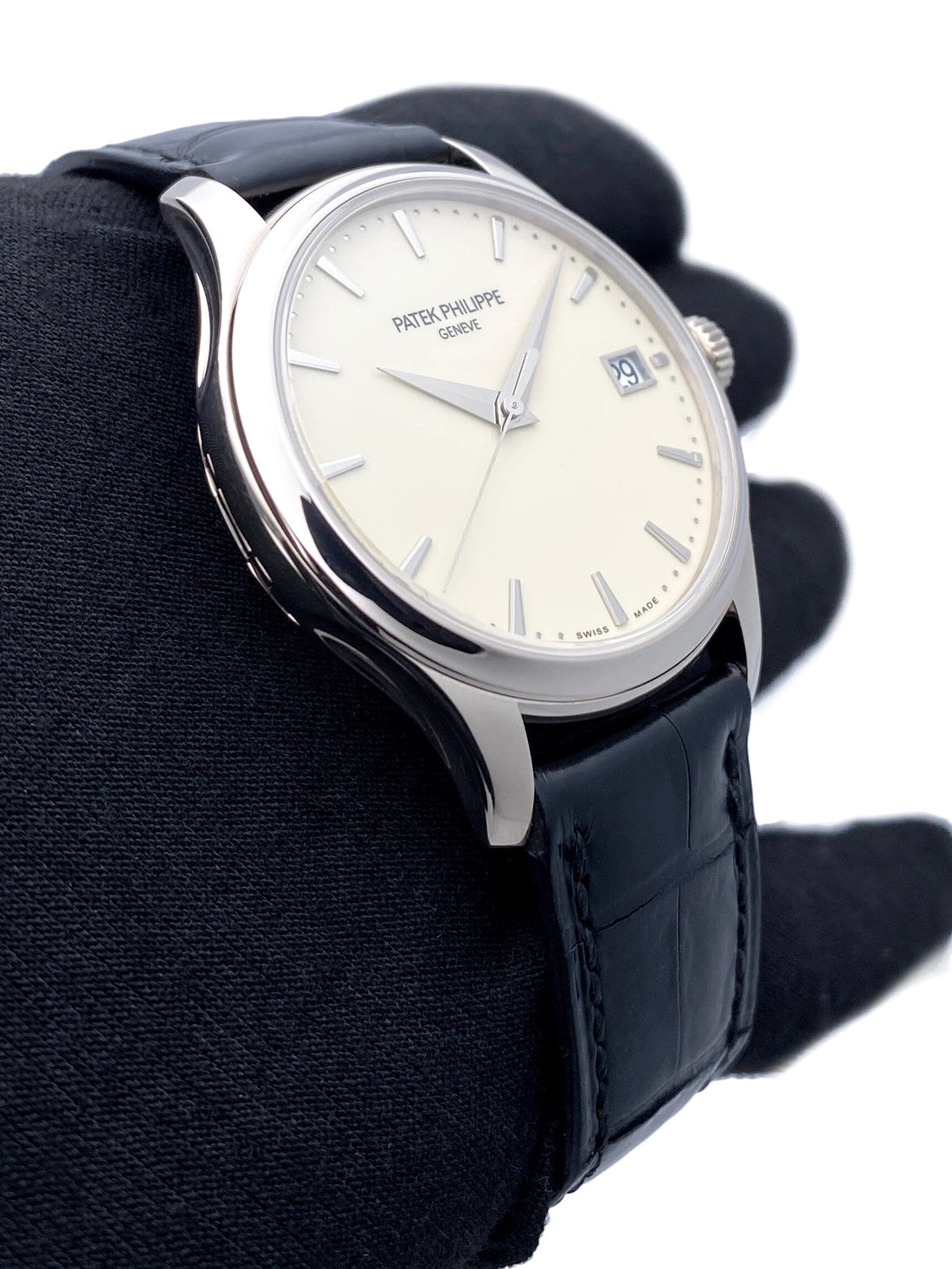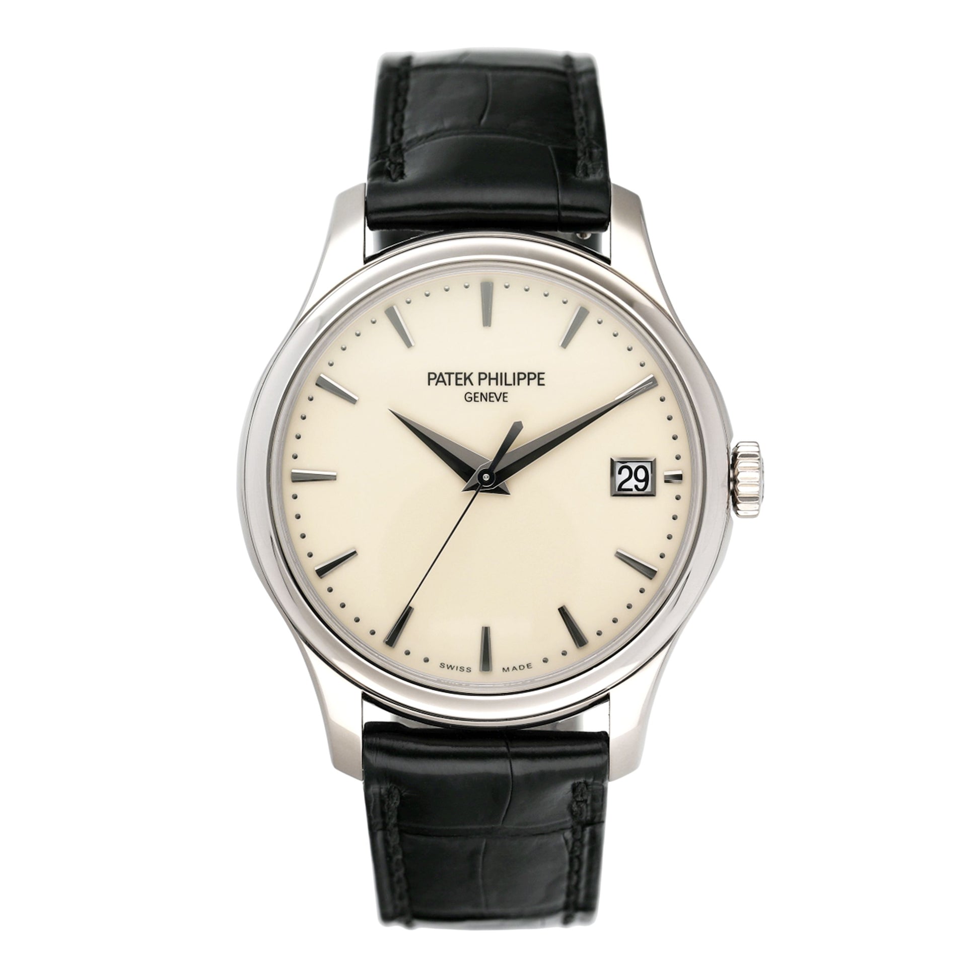 Patek Philippe Calatrava 5227G-001 Mens Watch. 39mm 18K white gold case. 18K white gold smoothed bezel. Ivory dial with gold hands and index hour markers. The date is displayed at 3 o'clock position. Black leather Patek strap with 18K yellow gold buckle. Will fit up to a 7.5-inch wrist. Sapphire crystal. 18K white gold case back. Automatic self-winding movement.