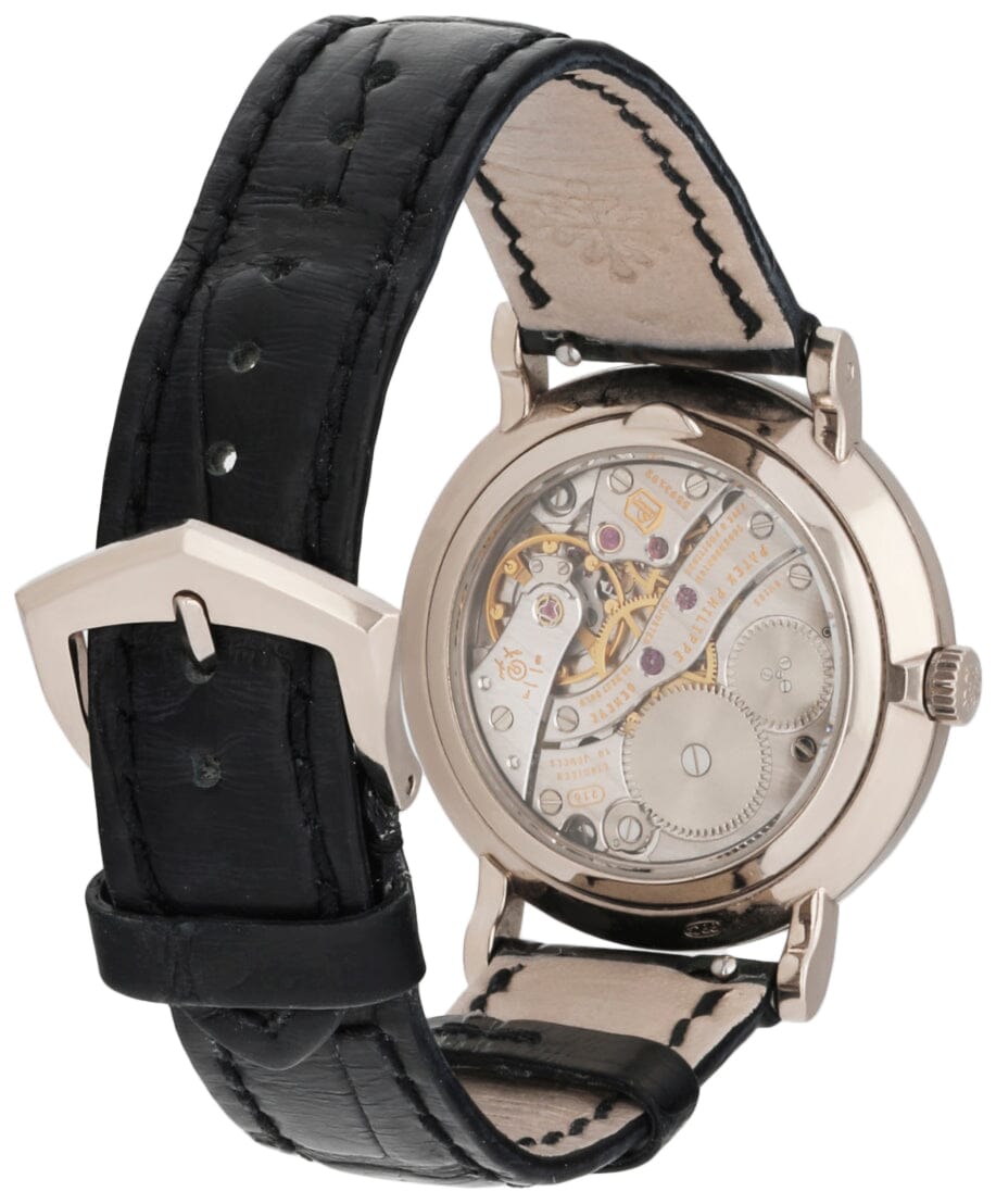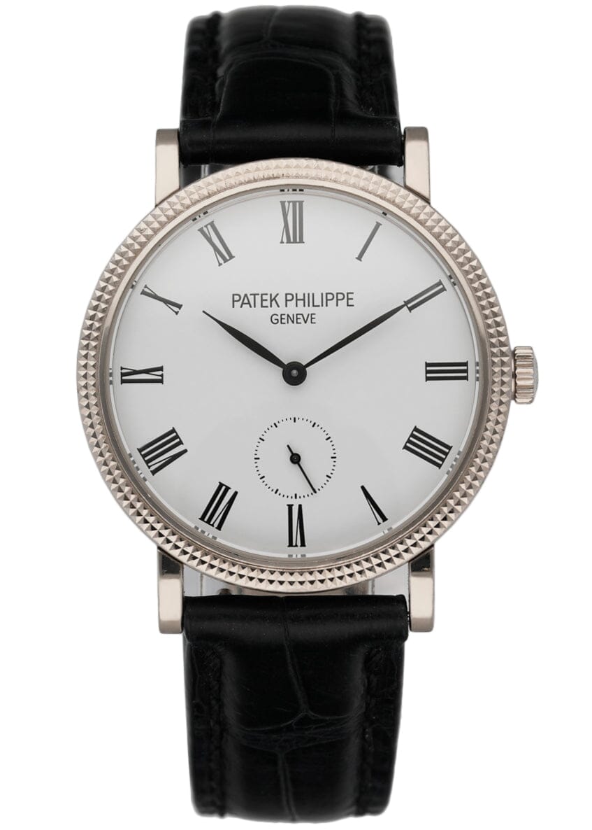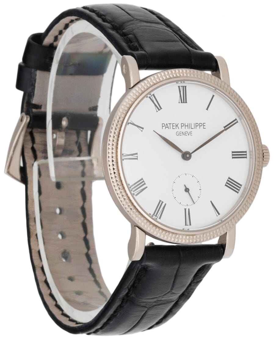 Patek Philippe Calatrava 7119G Ladies Watch. 31.00mm 18k white gold case. 18k white gold bezel. White dial and roman numeral hour markers. Small Second. Black leather strap with 18k white gold buckle. Will fit up to 6.50-inch wrist. Sapphire crystal. Transparent case back. Mechanical movement. Original Box & Papers.