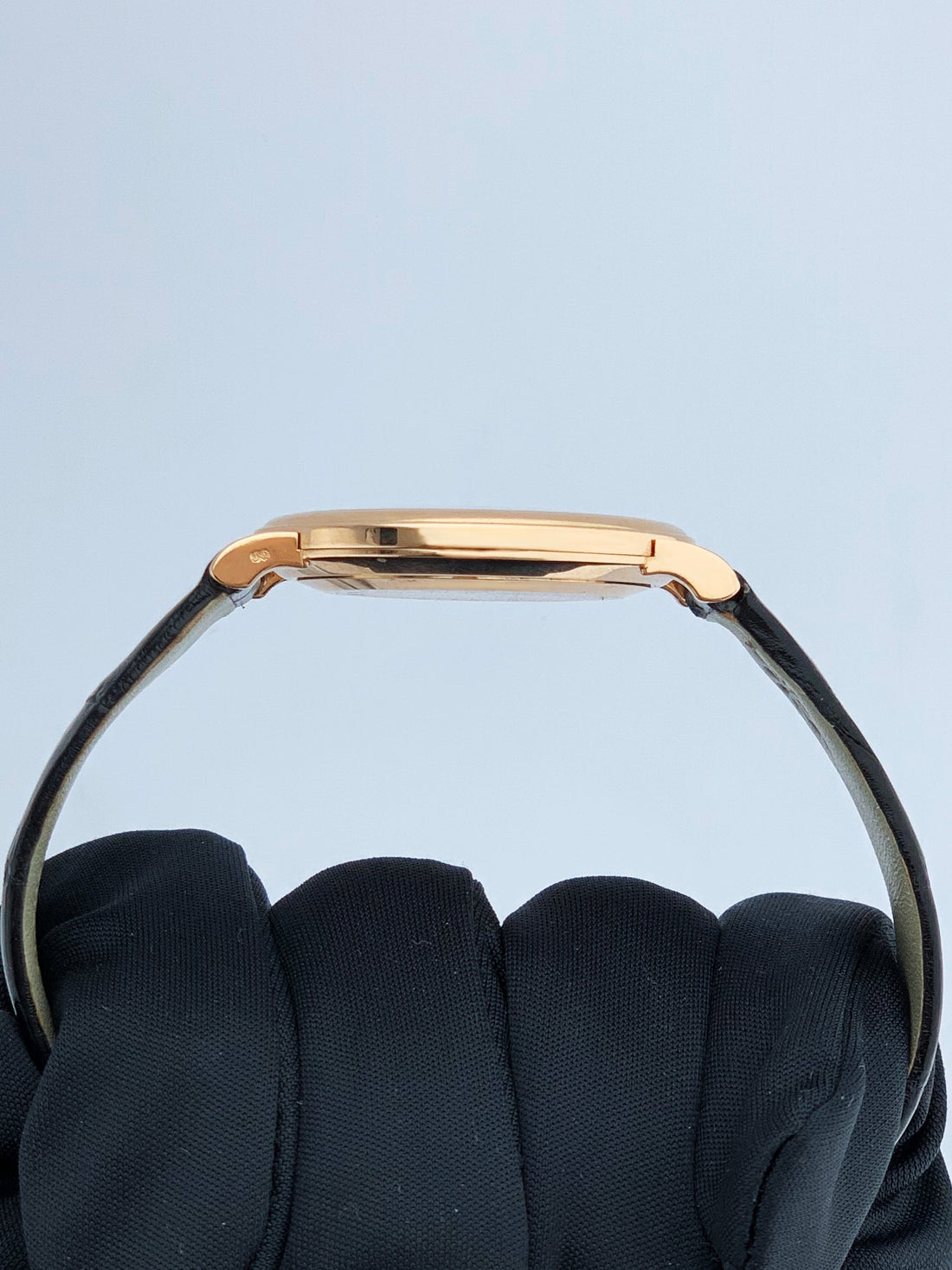 Patek Philippe Calatrava 5022R Mens Watch. 34mm 18K rose gold case and bezel. White Officer dial with black hands and Arabic numeral hour marker. Small second sub-dial display between 5 & 7 o'clock position. Black Patek Philippe leather strap with 18K rose gold buckle. Will fit up to 8-inch wrist. Sapphire crystal. 18K rose gold case back. Mechanical hand-winding movement .