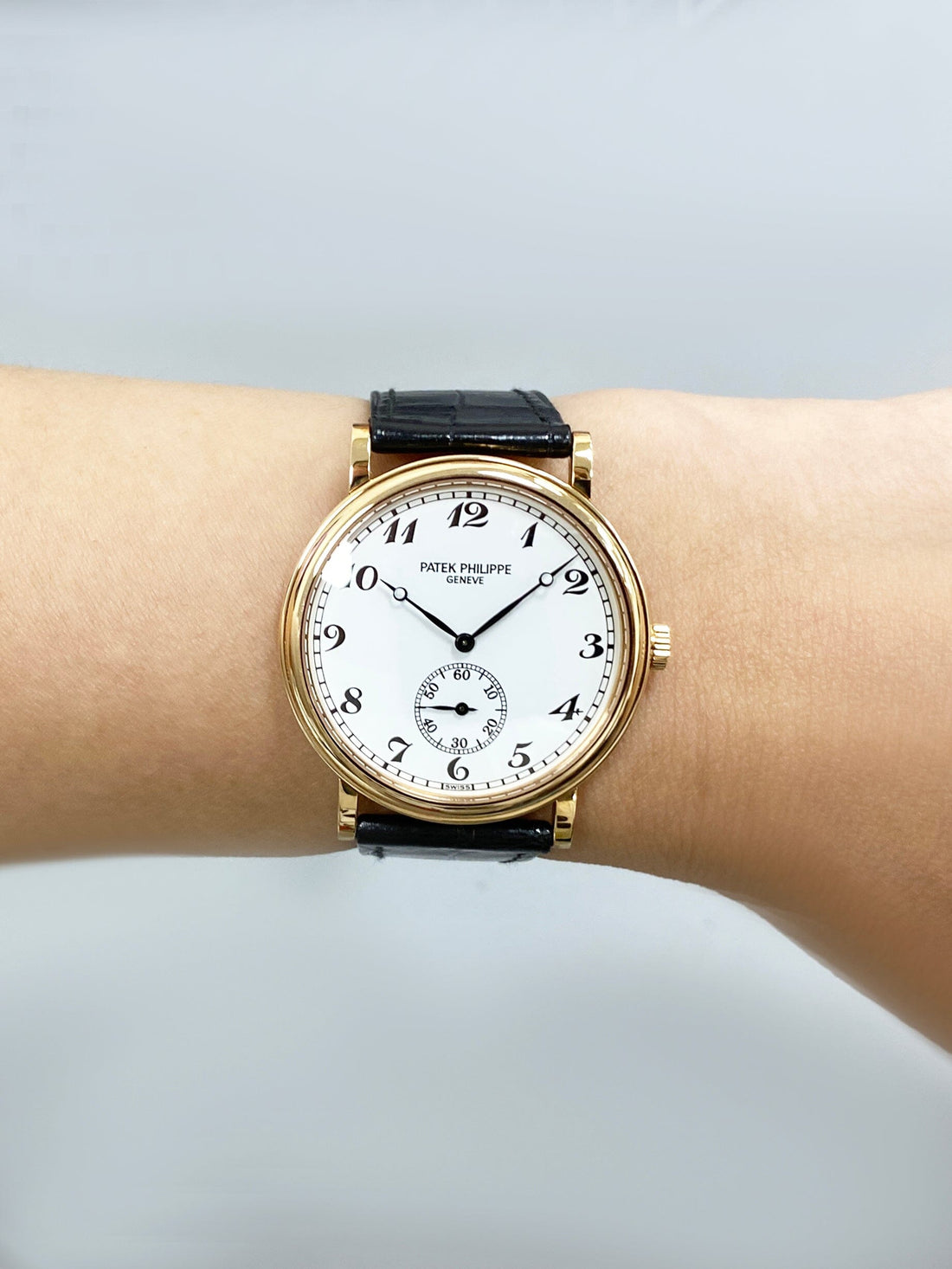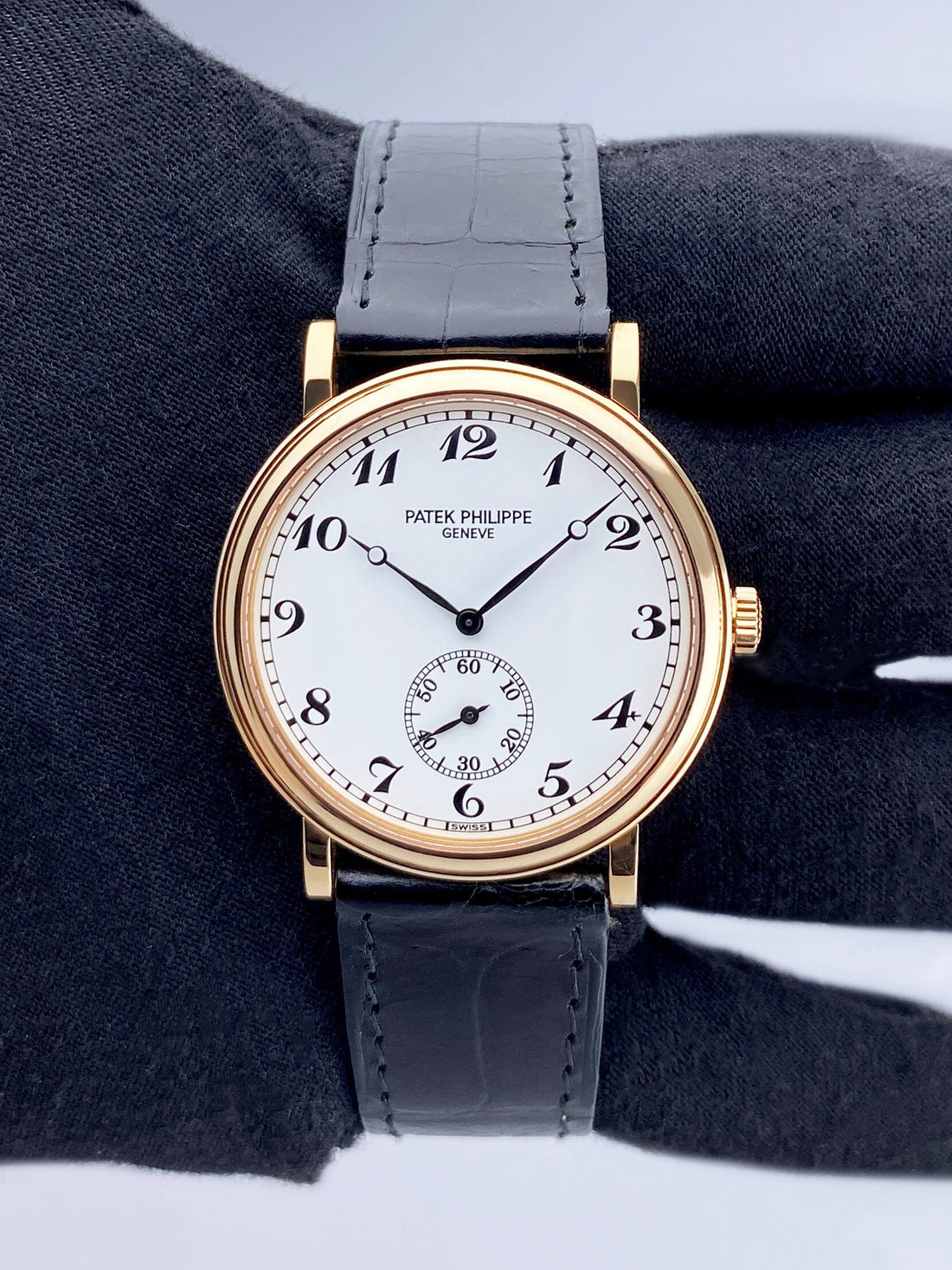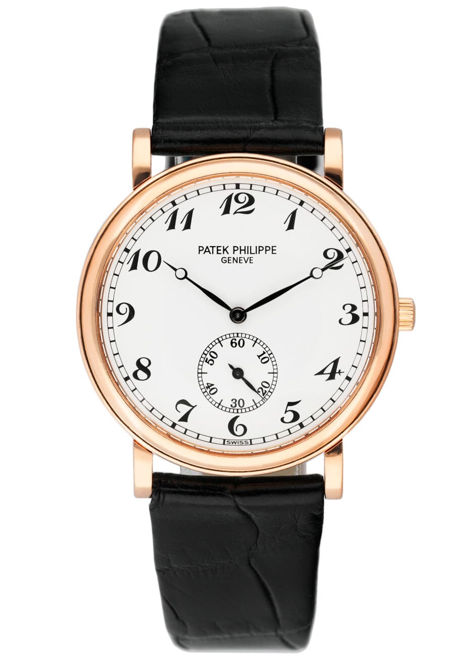 Patek Philippe Calatrava 5022R-010 Mens Watch. 34mm 18K rose gold case and bezel. White Officer dial with black hands and Arabic numeral hour marker. Small second sub-dial display between 5 & 7 o'clock position. Black Patek Philippe leather strap with 18K rose gold buckle. Will fit up to 7-inch wrist. Sapphire crystal. 18K rose gold case back. Mechanical hand-winding movement. This watch comes with original Box and Papers.
