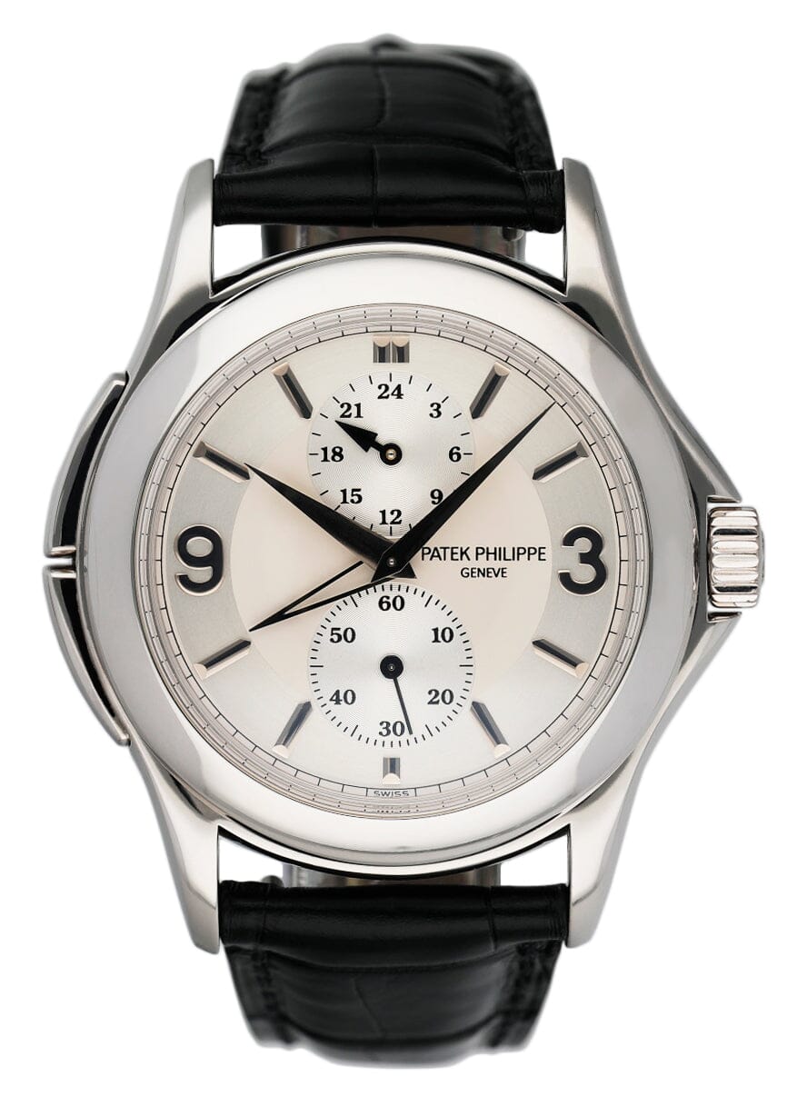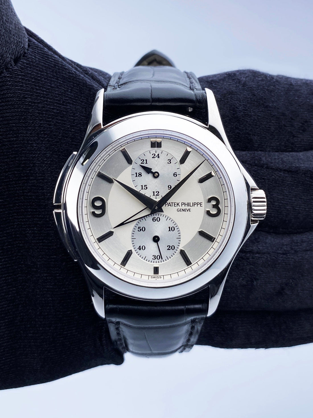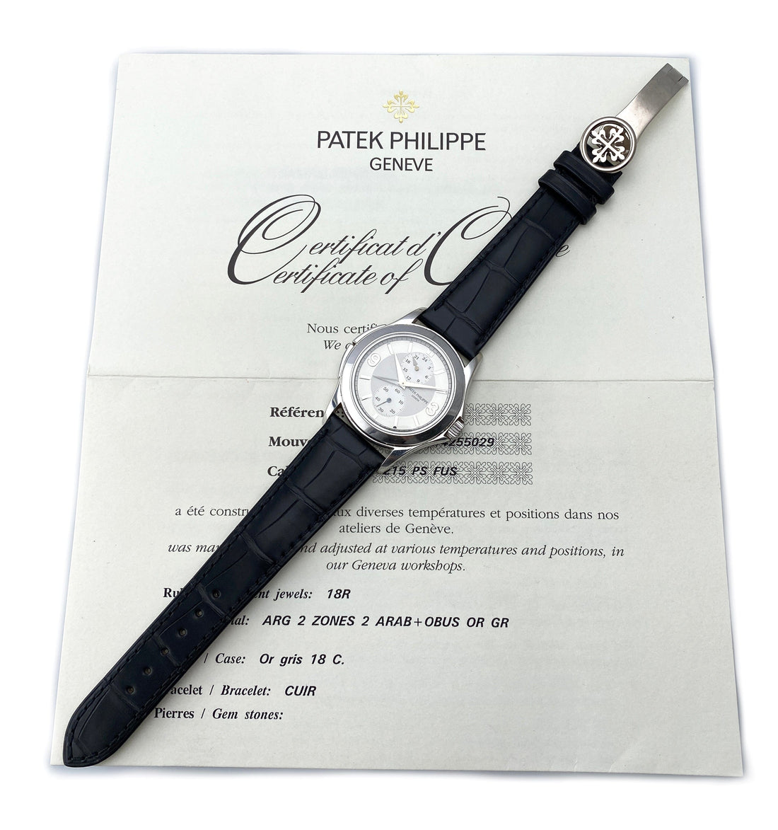 Patek Philippe Calatrava Travel Time 5134G-011 Mens Watch. 37mm 18K white gold case. 18K white gold smoothed bezel. Silver dial with silver-tone and black hands. Arabic numeral & index hour markers. Dual time. Small second sub-dial between 5 and 6 o'clock. 24-hour counter between 11 and 1 o'clock. Black leather strap with 18K white gold deployment buckle. Will fit up to 7.5-inch wrist. Sapphire crystal. Transparent sapphire case back. Calibre 215 PS mechanical hand winding movement. This watch comes with original Box and Papers.