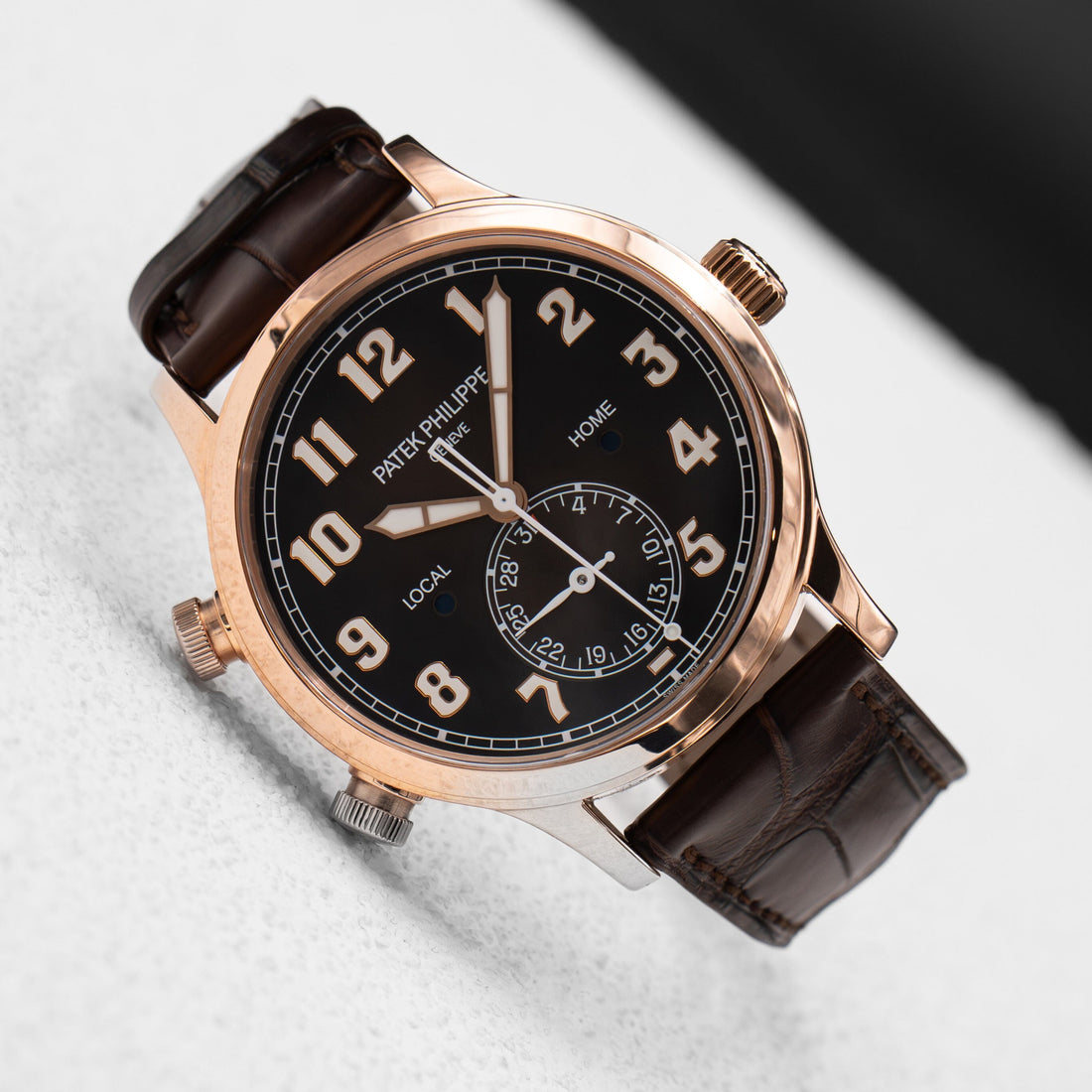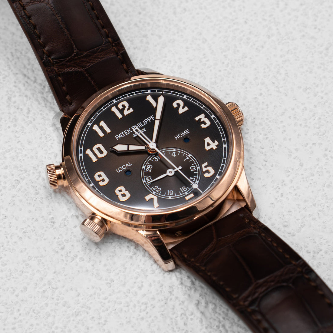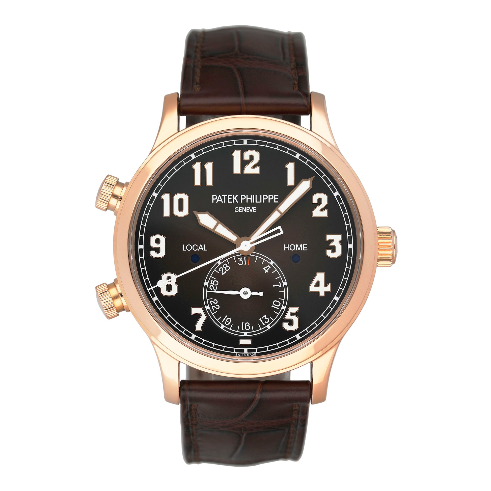 Patek Philippe Complication Calatrava Pilot Travel Time 5524R-001 Mens Watch. 42mm 18K rose gold case. 18K rose gold bezel. Brown sunburst dial with pink hands and Arabic numeral hour markers. Date dial display at 6 o'clock position. Dual time zone mechanism indicating local and home time. Local and home day/night indication in apertures. Brown Patek leather strap with buckle. Will fit up to a 7.5-inch wrist. Sapphire crystal. Transparent sapphire crystal case back. Automatic self-winding movement. This watch comes with original Box and Papers