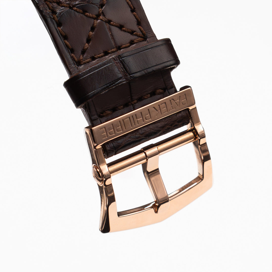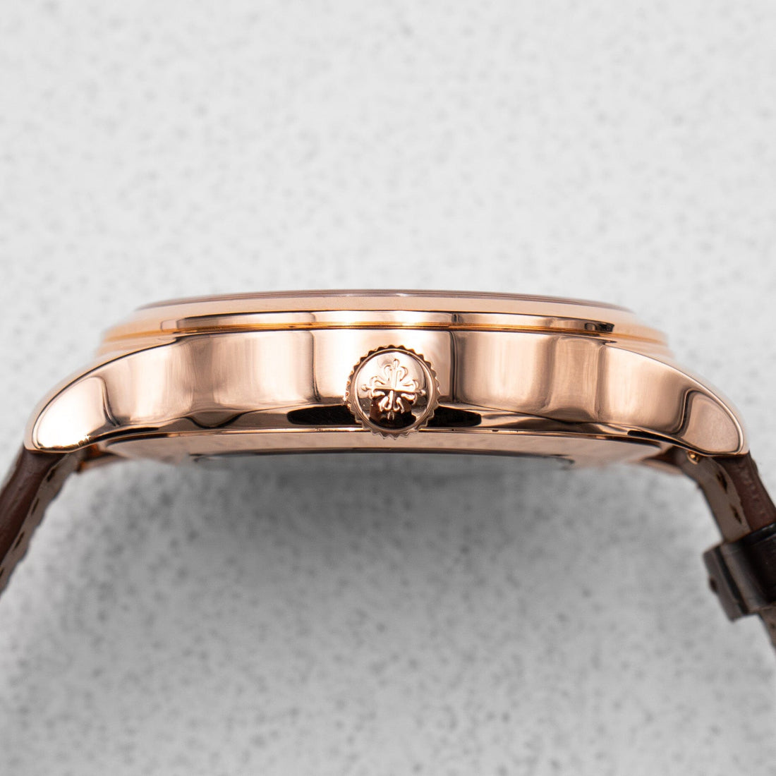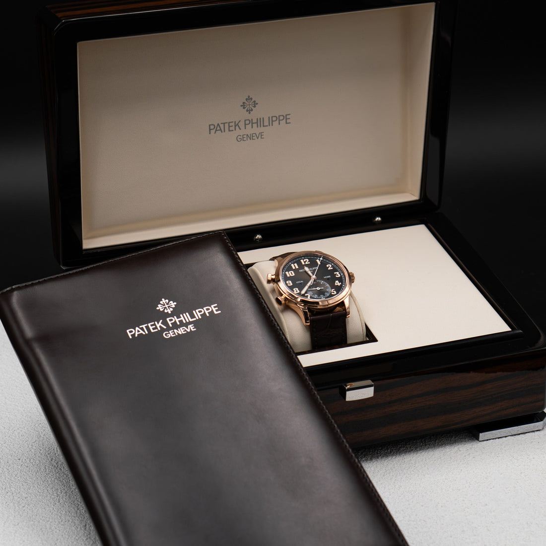Patek Philippe Complication Calatrava Pilot Travel Time 5524R-001 Mens Watch. 42mm 18K rose gold case. 18K rose gold bezel. Brown sunburst dial with pink hands and Arabic numeral hour markers. Date dial display at 6 o'clock position. Dual time zone mechanism indicating local and home time. Local and home day/night indication in apertures. Brown Patek leather strap with buckle. Will fit up to a 7.5-inch wrist. Sapphire crystal. Transparent sapphire crystal case back. Automatic self-winding movement. This watch comes with original Box and Papers