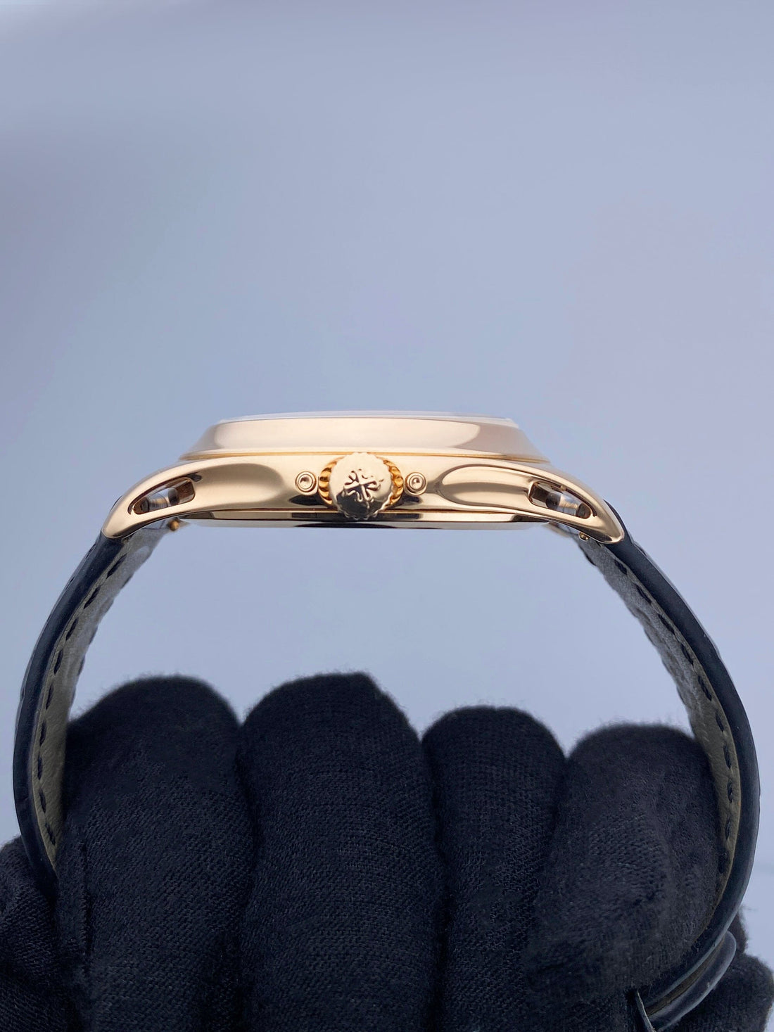 Patek Philippe Complications 5205R-001 Mens Watch. 40mm 18K rose gold case. 18K rose gold bezel. Silver dial with rose gold hands and index hour markers. The day/date/month apertures in the upper part ensure perfect readability of the Annual Calendar indications. Black leather Patek strap with 18K rose gold buckle. Will fit up to a 7.5-inch wrist. Sapphire crystal. Transparent sapphire crystal case back. Caliber 324 automatic self-winding movement.
