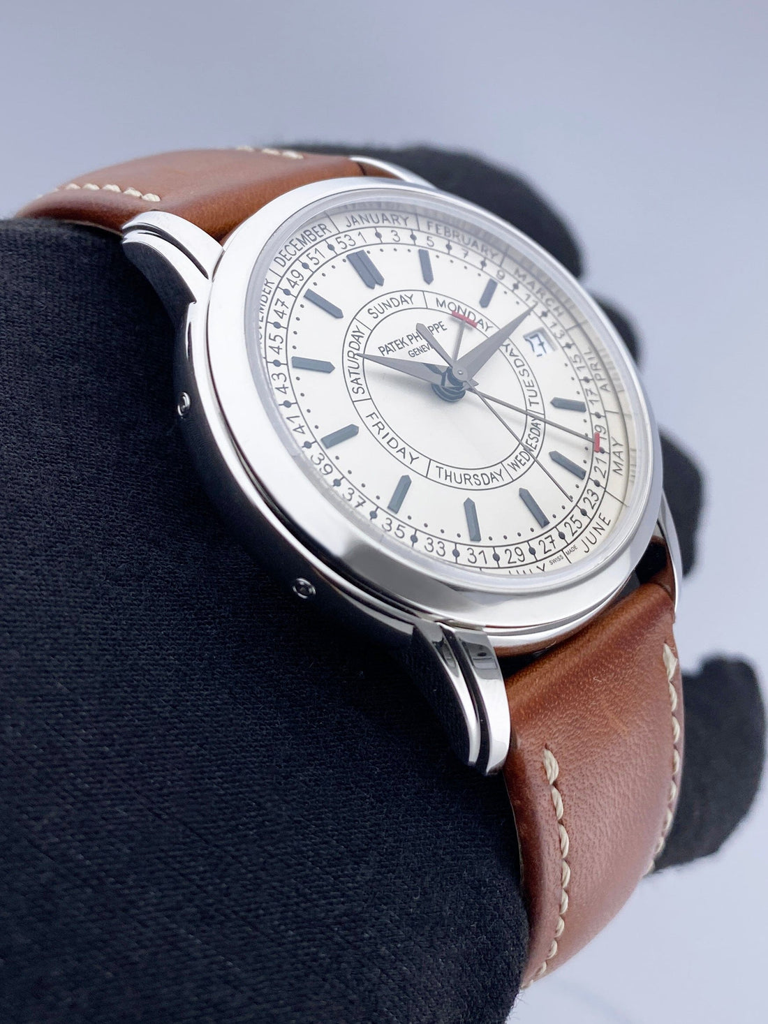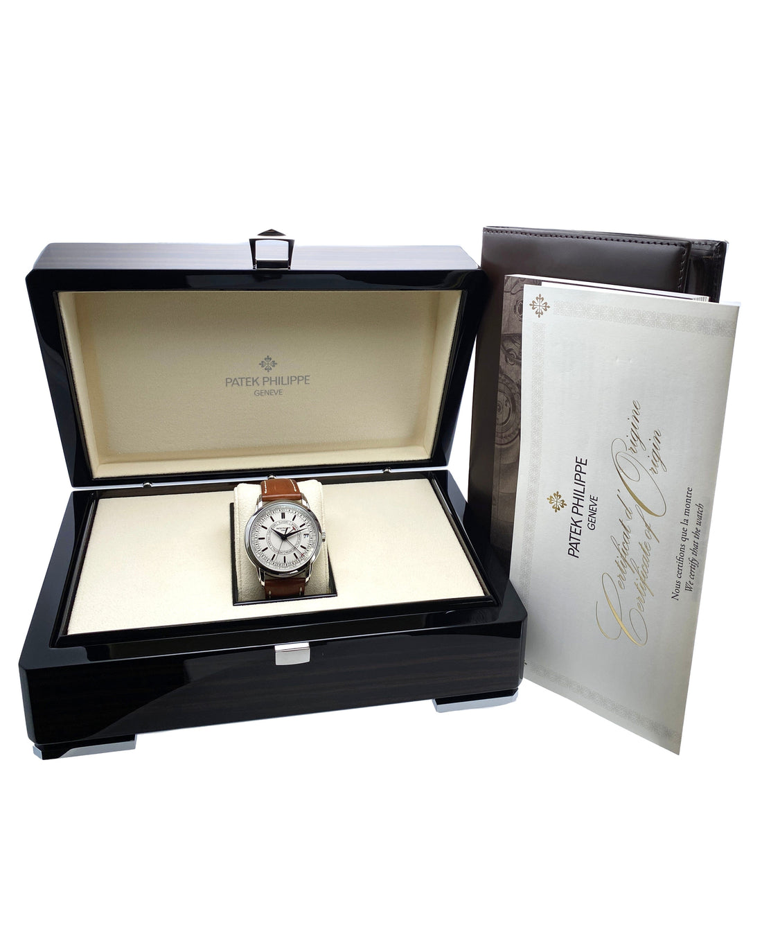 Patek Philippe Complications 5212A-001 Mens Watch. 40mm stainless steel case. Stainless steel bezel. Silver opaline dial with black hands and index hour markers. Weekly calendar displayed around outer dial. Brown leather strap with stainless steel buckle. Will fit up to a 7.5-inch wrist. Sapphire crystal. Transparent sapphire crystal case back. Automatic self-winding movement. This watch comes with original Box and Papers.