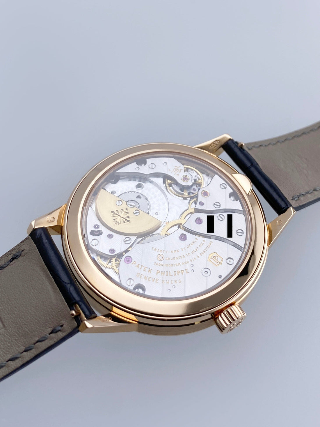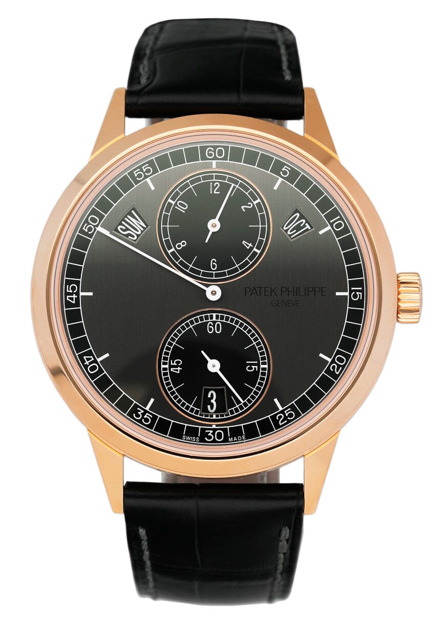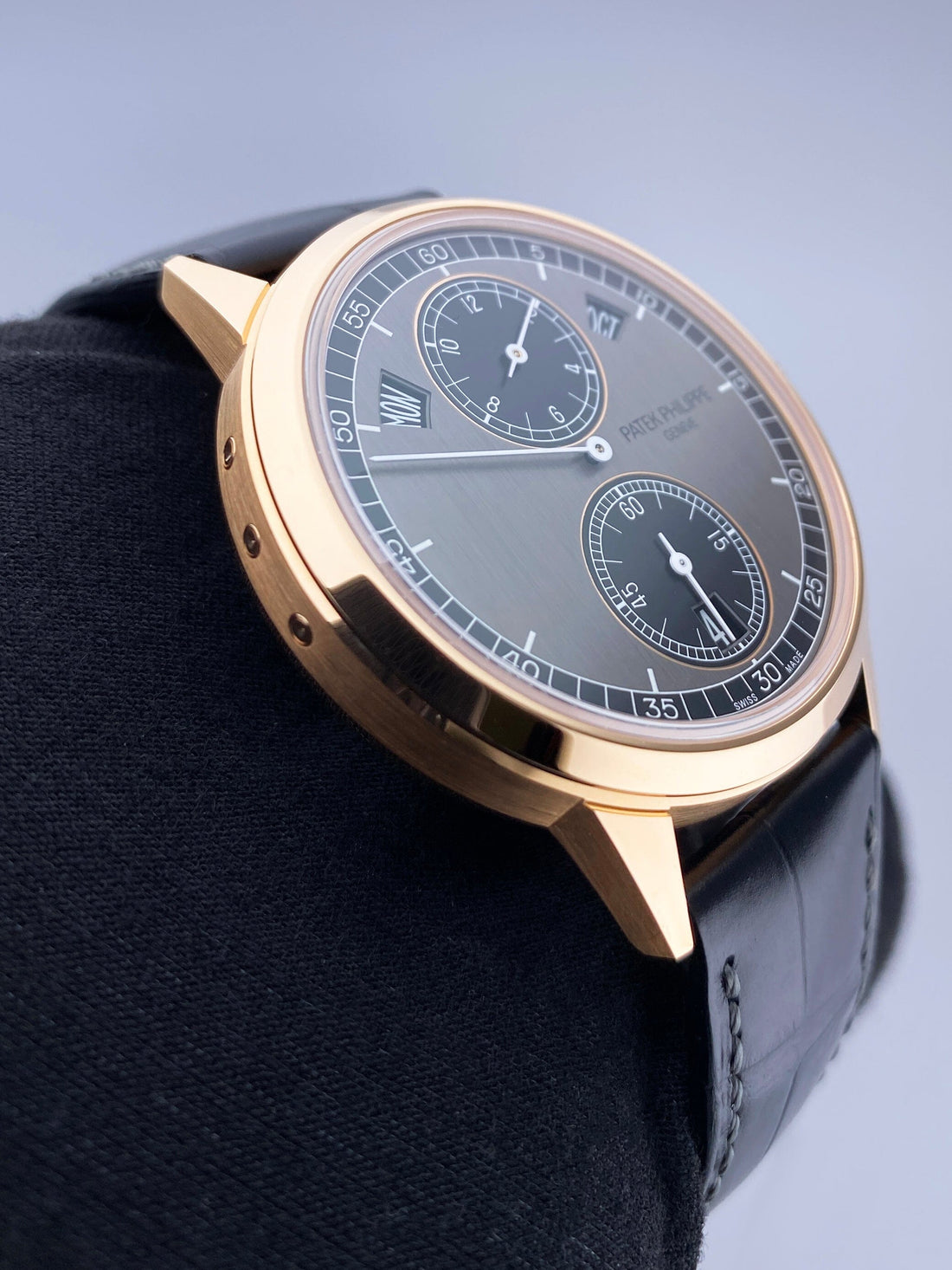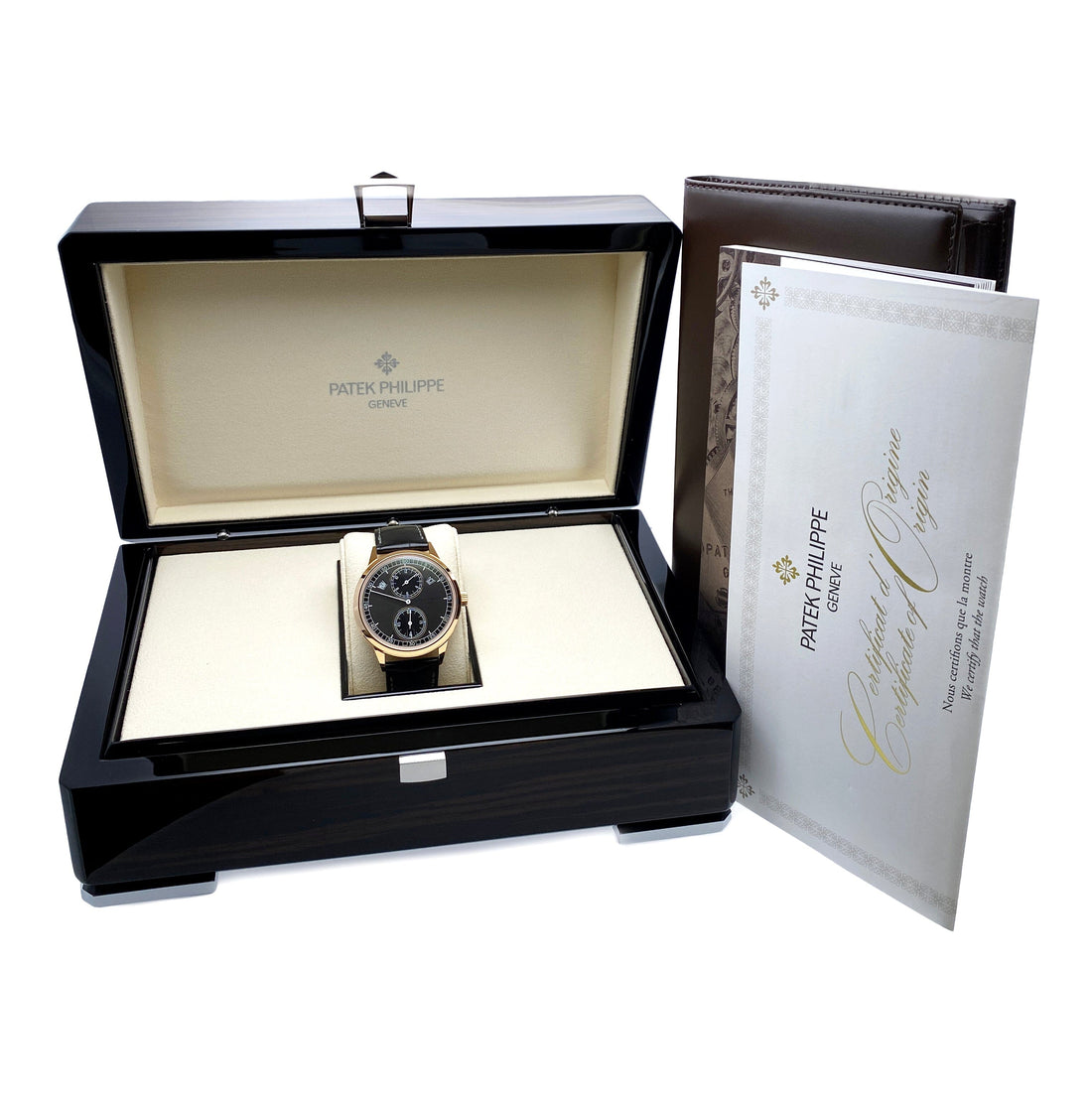 Patek Philippe Complications 5235/50R-001 Mens Watch. 40.5mm 18K rose gold case. 18K rose gold bezel. Gray dial with white hands and index hour markers. Annual calendar. Day display between 10 & 11 o'clock. Month display between 1 & 2 o'clock. Date display at 6 o'clock position. Small second at 6 o'clock. 12-hour counter at 12o'clock. Black leather strap with 18K rose gold buckle. Will fit up to a 7.5-inch wrist. Sapphire crystal. Transparent sapphire crystal case back. Automatic self-winding movement. This watch comes with original Box and Papers.