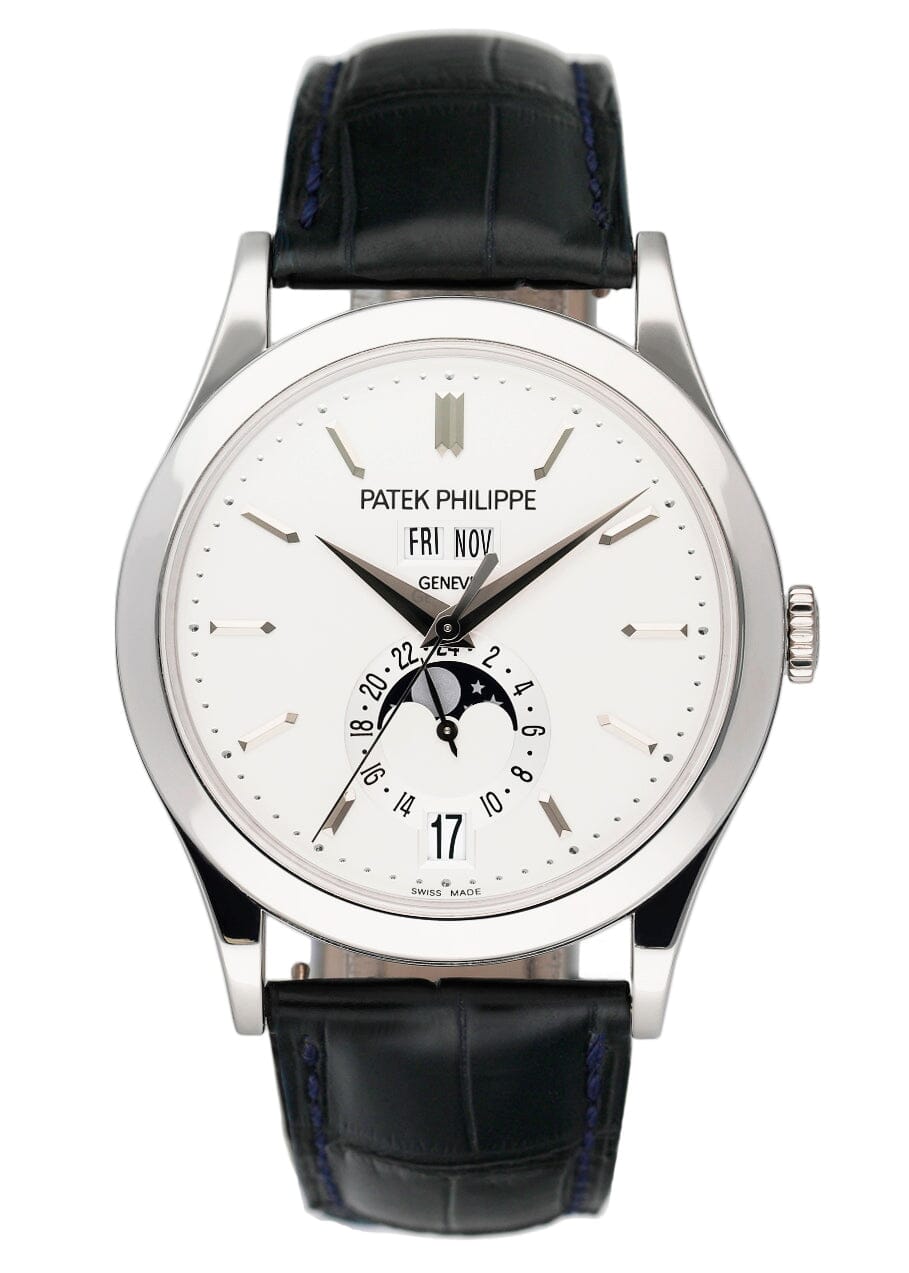 Patek Philippe Complications 5396G-011 Mens Watch. 38.5mm 18K white gold case and 18K white gold bezel. Silver dial with white gold hands and white gold index hour markers. Annual calendar displays with a moon phase indicator. Blue leather strap with 18K white gold deployment buckle. Will fit up to a 7.5-inch wrist. Sapphire crystal. Transparent sapphire crystal case back. Automatic self-winding movement. This watch comes with original Papers.