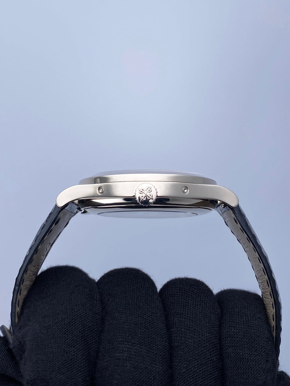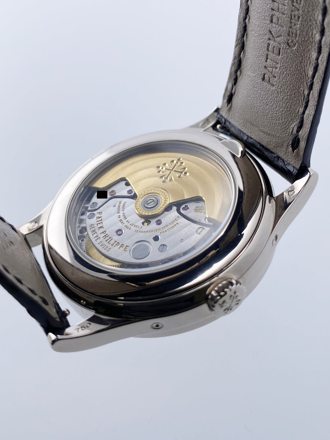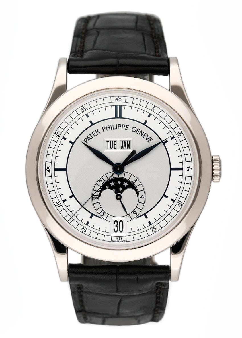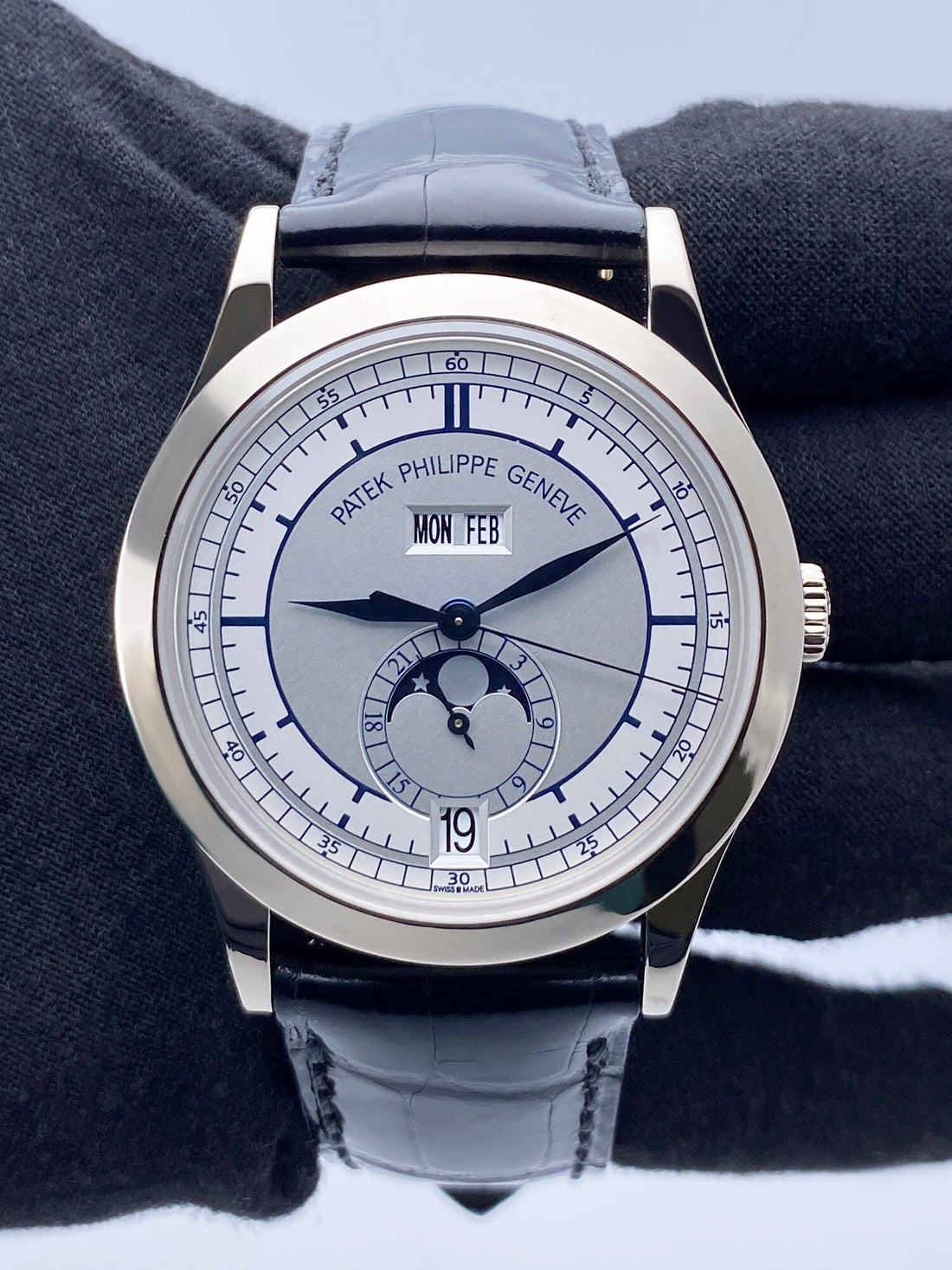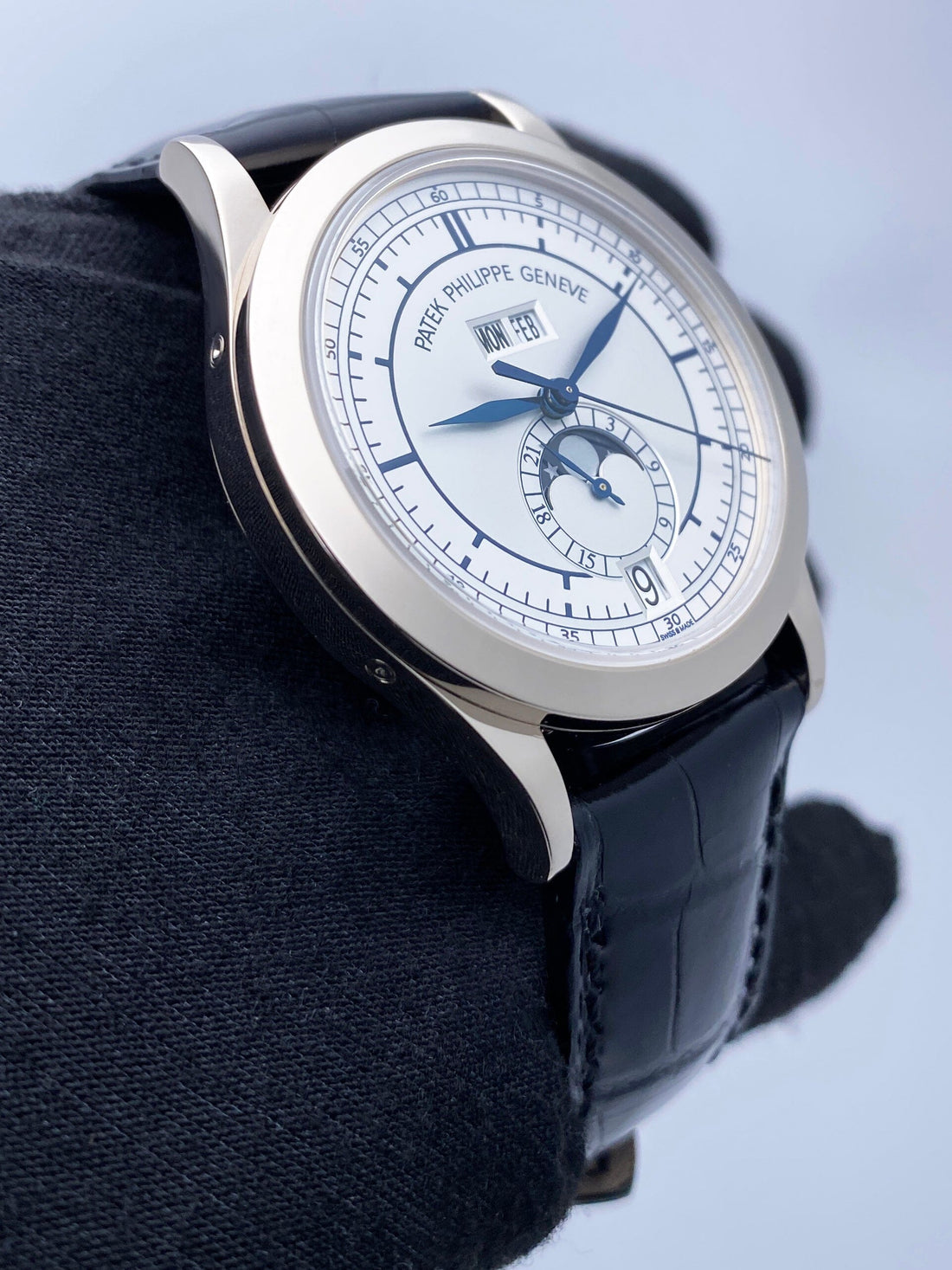Patek Philippe Complications 5396G-001 Mens Watch. 38.5mm 18K white gold case and 18K white gold bezel. Silver dial with blue gold hands and white gold index hour markers. Annual calendar displays with a moon phase indicator. Black leather strap with 18K white gold deployment buckle. Will fit up to a 7.5-inch wrist. Sapphire crystal. Transparent sapphire crystal case back. Automatic self-winding movement. This watch comes with original Box and Papers.